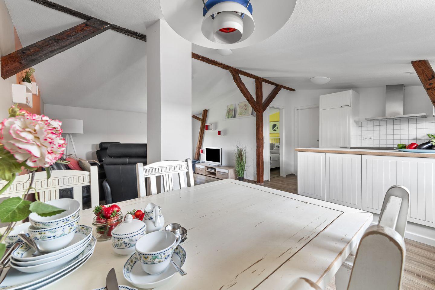 Die offene Wohnküche bietet viele Annehmlichkeiten, die man von einer modernen Küche erwartet. Im Essbereich der voll ausgestatteten Küchefinden hier 4 Personen Platz.