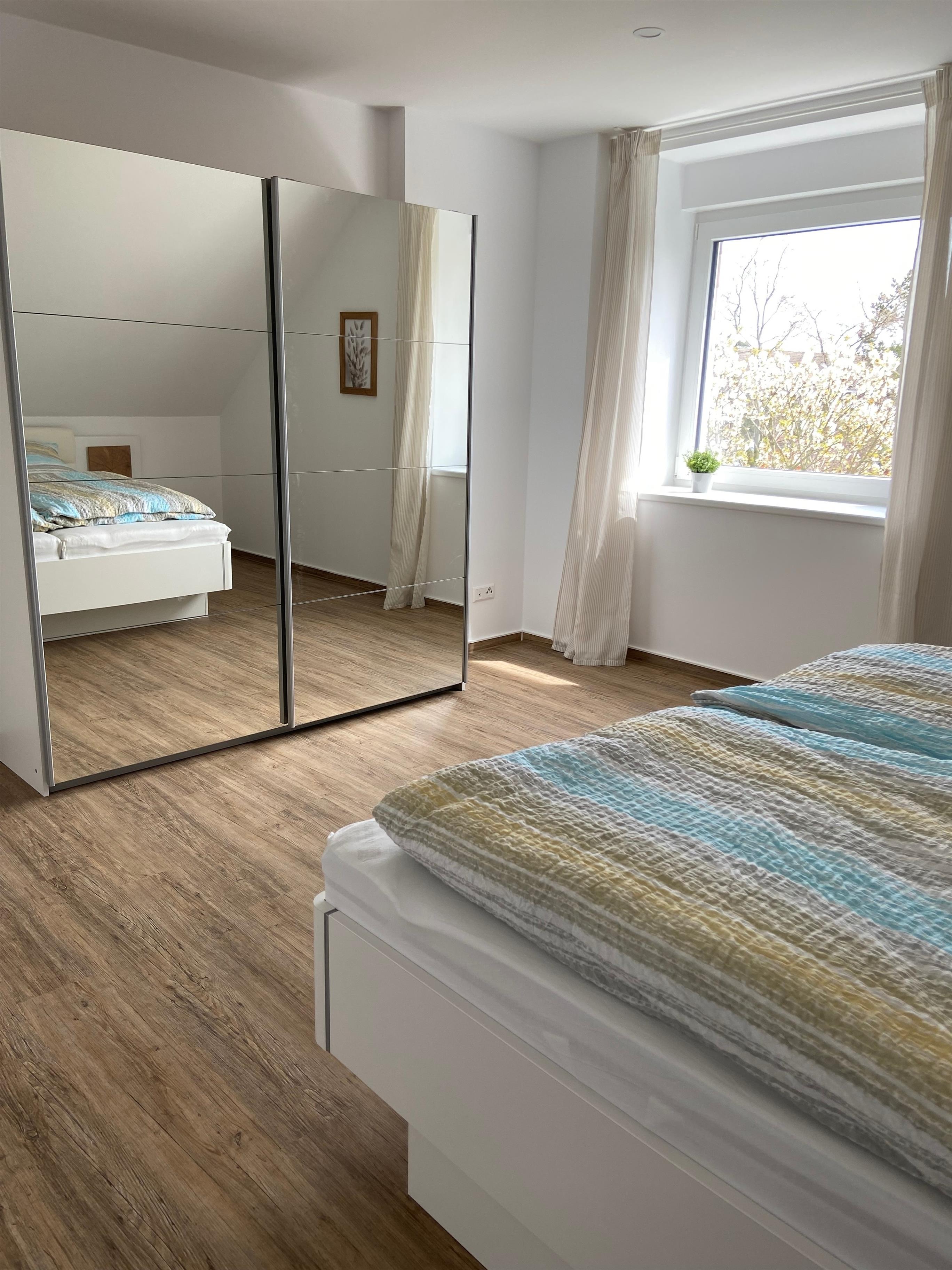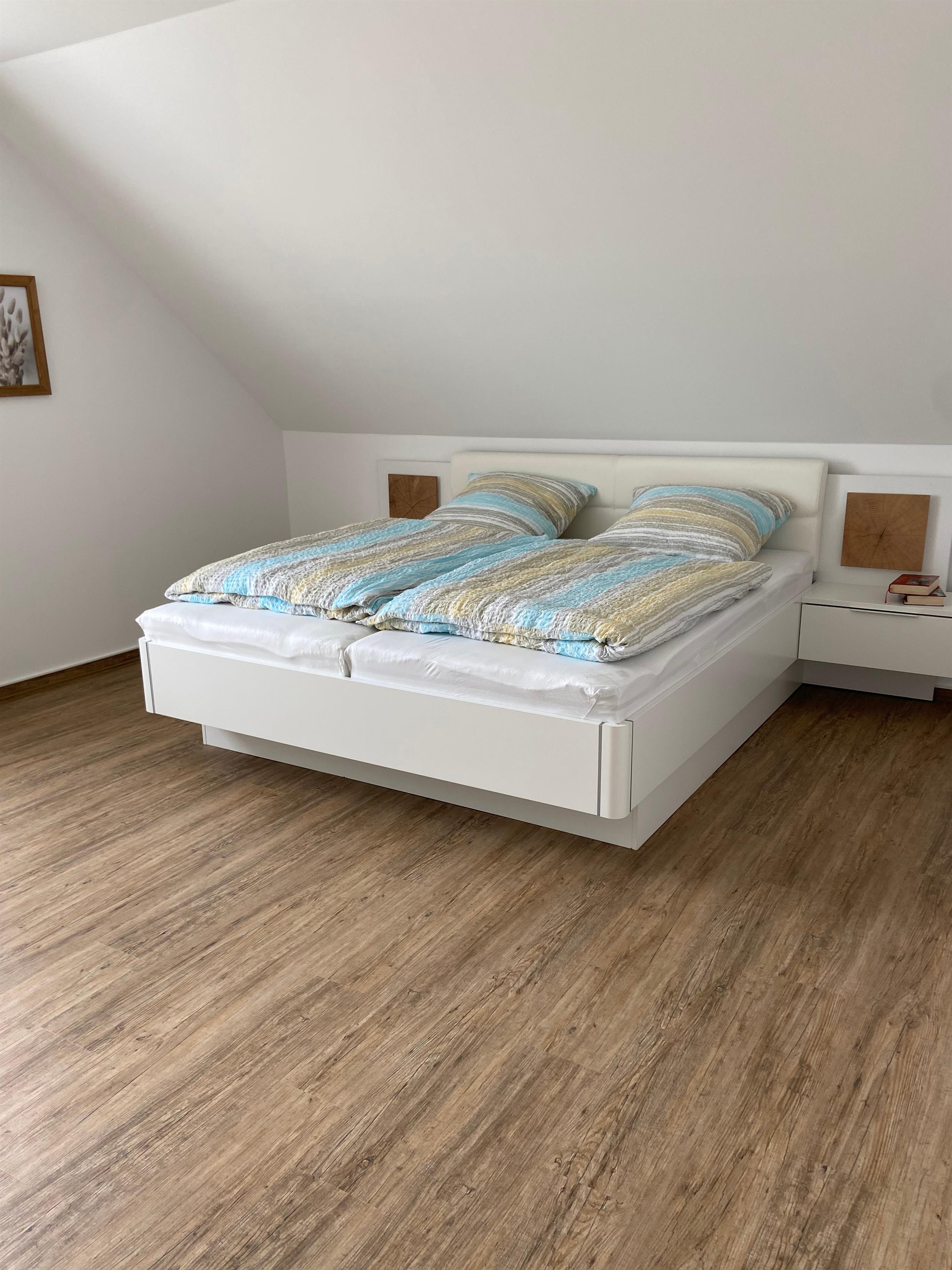 Die 58qm große Ferienwohnung im ersten OG wurde im Jahr 2022 frisch saniert und bietet Platz für bis zu 3 Urlauber. Sie hat einen schönen Balkon mit Blick in die umliegenden Gärten. Die Wohnung verfügt über einen geräumigen, lichtdurchfluteten Wohn-/Essbereich mit einer voll ausgestatteten Küchenzeile, Flat-TV, freiem WLAN und freier Telefonie. Es steht ein Sofa zur Verfügung, welches als Bett (140x200) genutzt werden kann. Das behagliche Schlafzimmer wartet mit einem großen Doppelbett (180x200) auf. Auf Wunsch kann ein Kinderreisebett und ein Hochstuhl bereitgestellt werden (bitte vorher mitteilen). Das moderne Badezimmer verfügt über eine große Dusche und rundet das Wohlfühlpaket gekonnt ab.