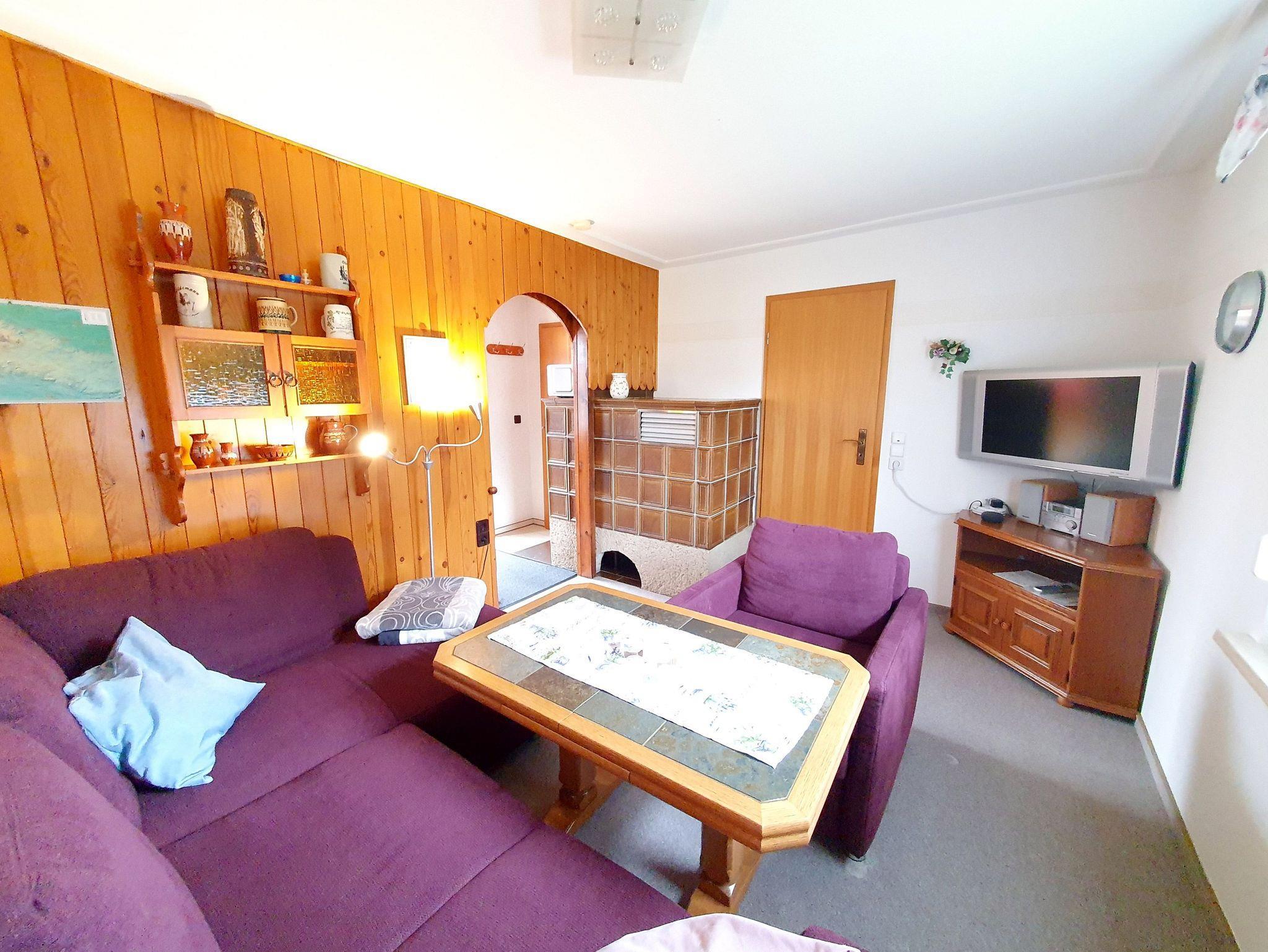 Für behagliche Wärme sorgt ein Heißluftkachelofen und im Bad zusätzlich eine Wärmeplatte. Zum Interieur der voll ausgestatteten Küche gehören u.a. Kühlschrank mit Gefrierfach, Spüle, Cerankochfeld, Kaffeemaschine, Mikrowelle, Wasserkocher, Besteck, Geschirr und Töpfe.