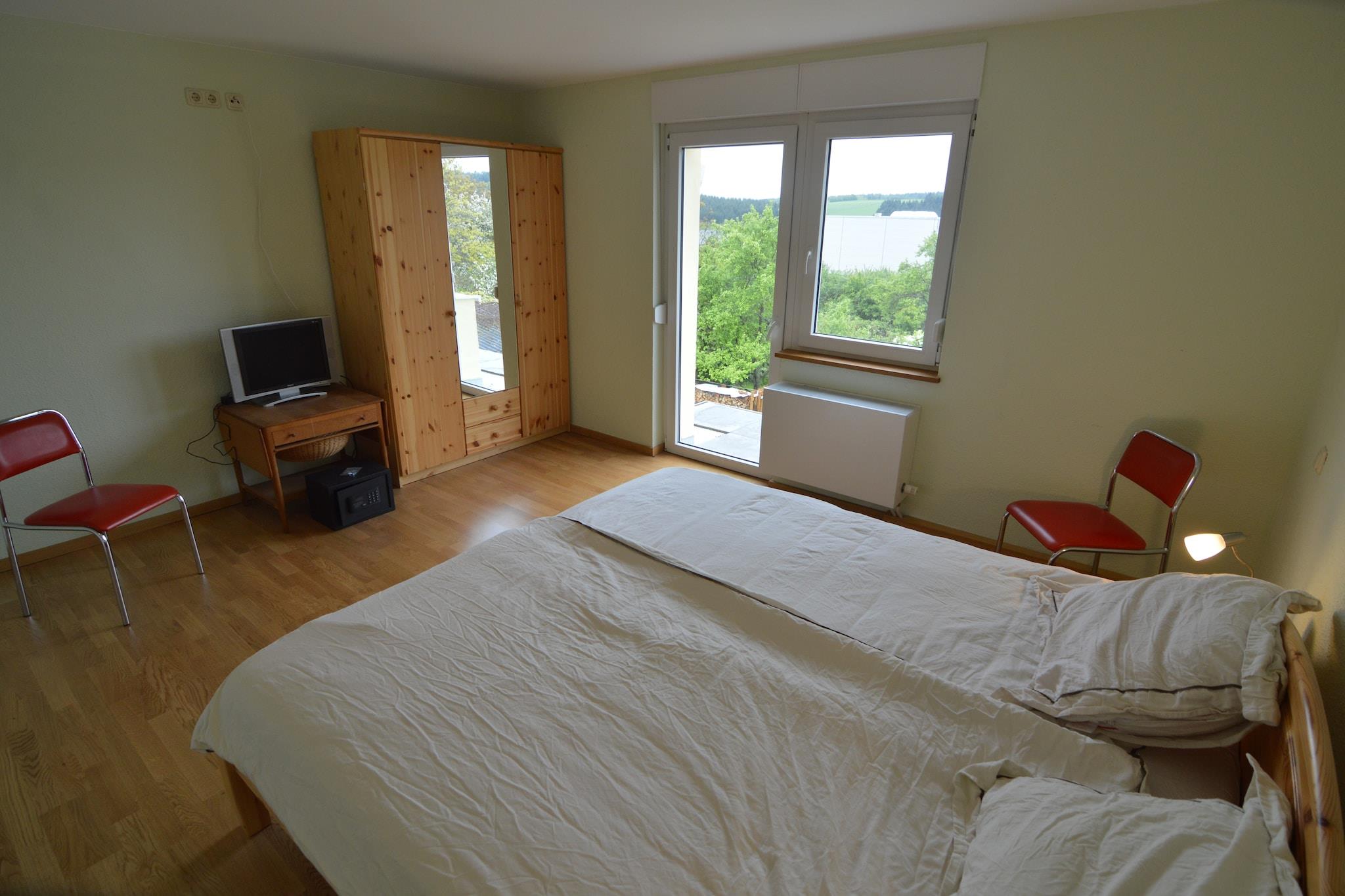 Dette feriehus med fantastisk udsigt ligger i Stipshausen i Hunsrück. Du finder et rummeligt feriehus, komfortabelt møbleret og funktionelt udstyret. I godt vejr kan du slappe af udendørs på 22m2 træterrassen. Intet vil forstyrre din afslappende ferie her! Den stille landsby Stipshausen ligger direkte ved foden af Idarkopf, omgivet af ekspansive skove. Der er mange skiltede vandreruter, der fører fra landsbyen langs vandløb og fortidsmøller i Hunsrücks naturlige omgivelser. Hvis du gerne vil se en ædelstenskutter på arbejdspladsen, er det muligt i Stipshausen. Endnu mere interessante oplevelser omkring de mousserende sten findes i smykker og ædelstadsbyen Idar-Oberstein (ca. 25 km). Byerne Rhaunern og Kirn på skifer- og fæstningsruten er også værd at se. Udforske det dejlige landskab og de mange historiske seværdigheder i Hunsrück!