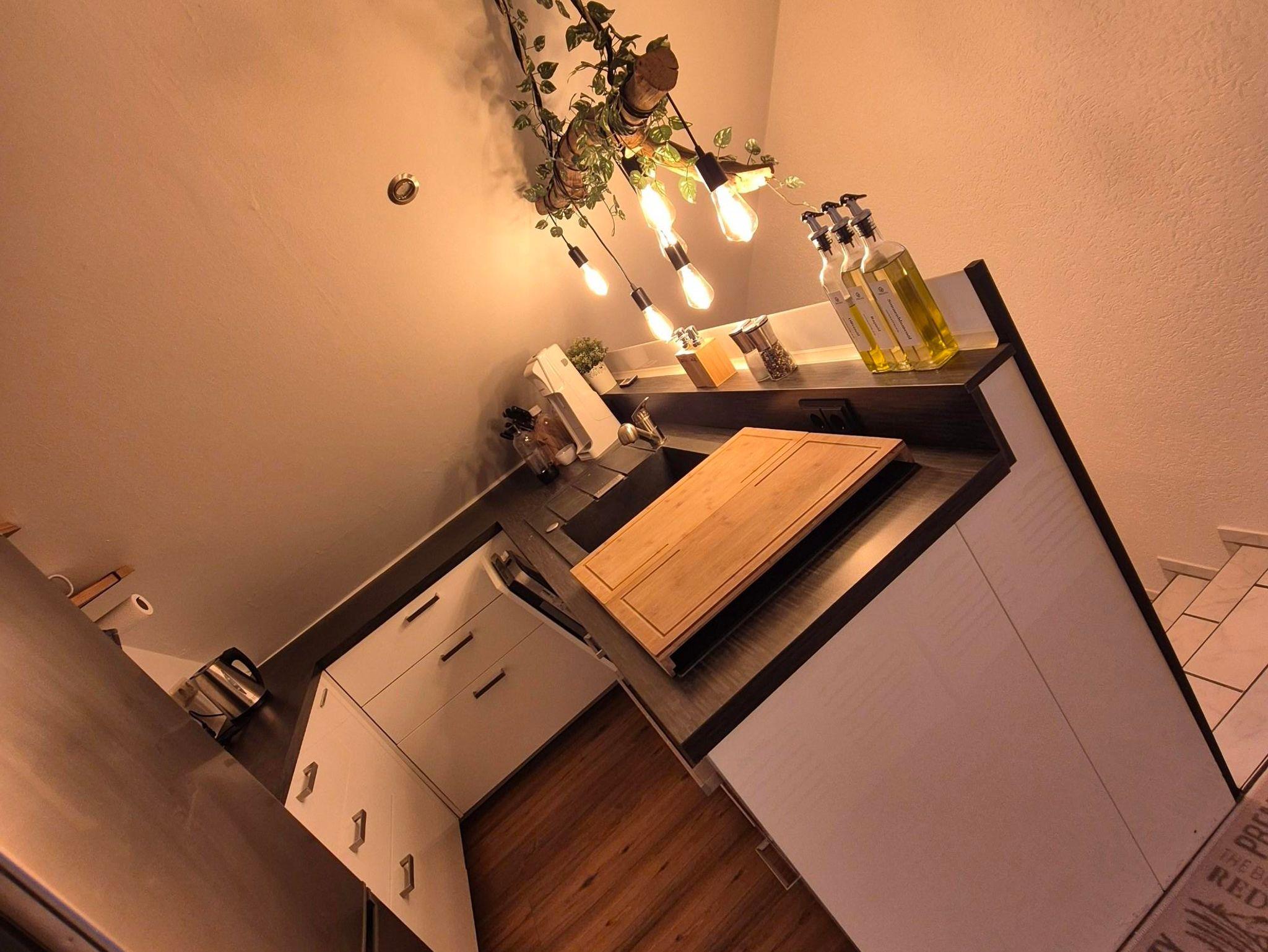 Aus einer ehemaligen Abstellkammer ist eine schöne halboffene U-Küche mit Backofen, Ceranfeld und einer kleinen Spülmaschine, Sodastream für Selter, Kühl-/Gefrierschrankkombi geworden und bietet Euch alles, was ihr benötigt inkl. gut ausgestattetem Gewürzregal, Grillutensilien, verschiedene Teesorten, Kaffeepads, Kaffeepulver, Senf, Ketchup und mit alldem, was man in einer Küche erwartet.