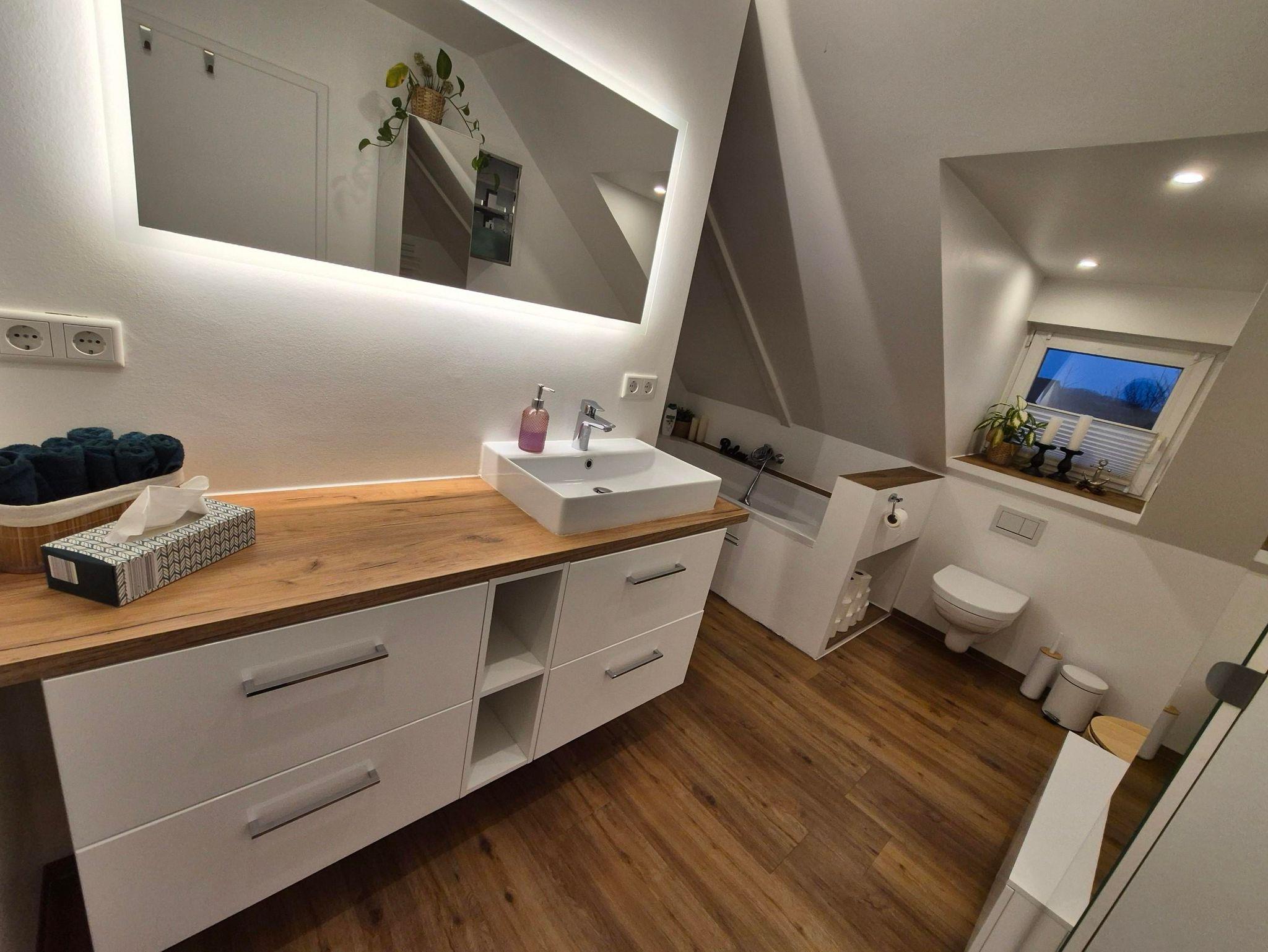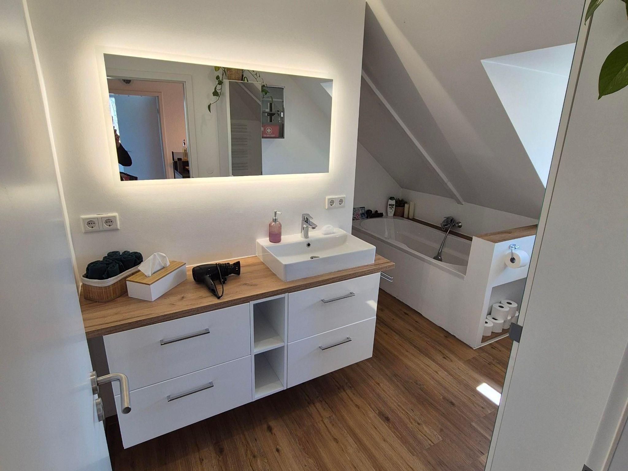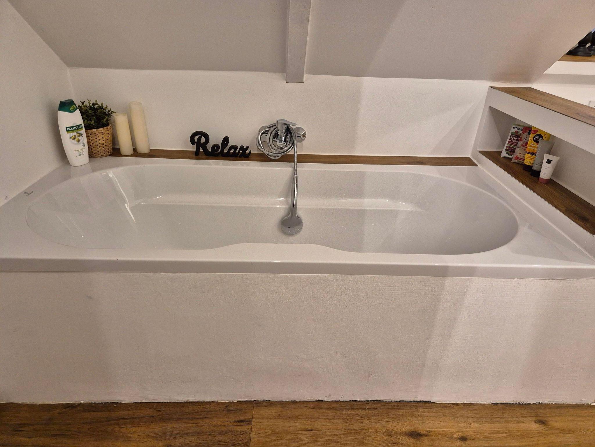 Auch das Vollbad wurde in dem Zuge kernsaniert und lädt durch seine warmen Töne zu einer längeren Dusche (Regendusche und Standardduschkopf mit Sitzfläche, ebenerdig) oder ein Vollbad ein. Ihr habt einen Föhn, Handtücher so viele wie ihr braucht, Duschvorleger und falls vergessen auch Zahnbürsten und Zahnpasta, wie auch WC-Papier.