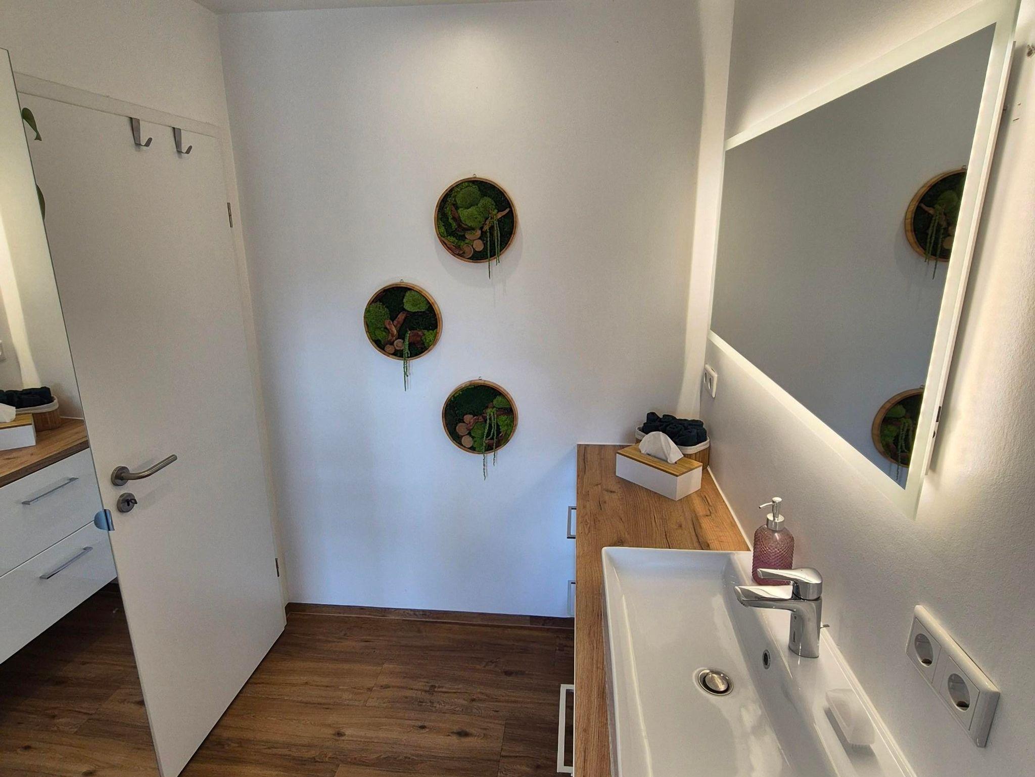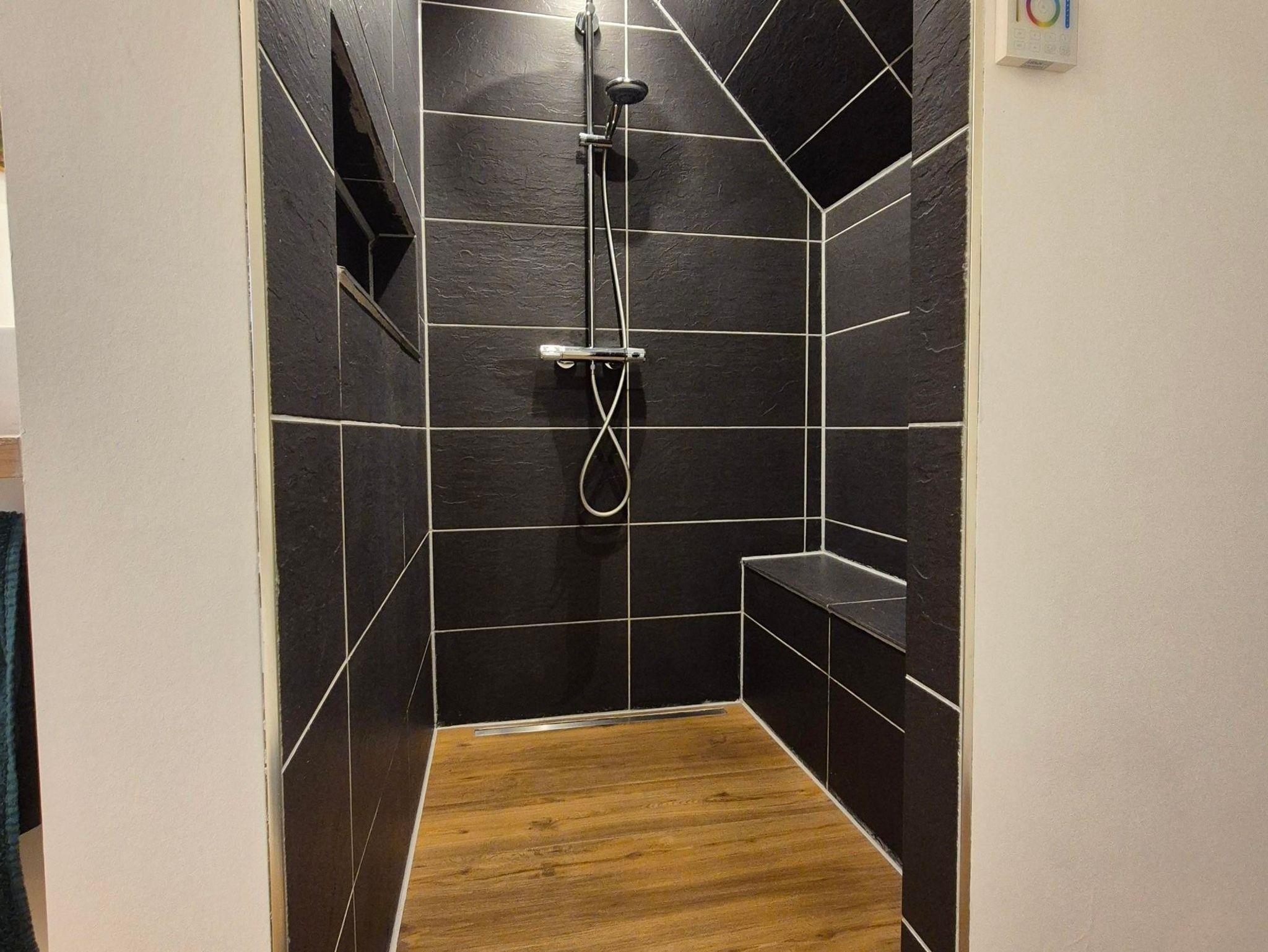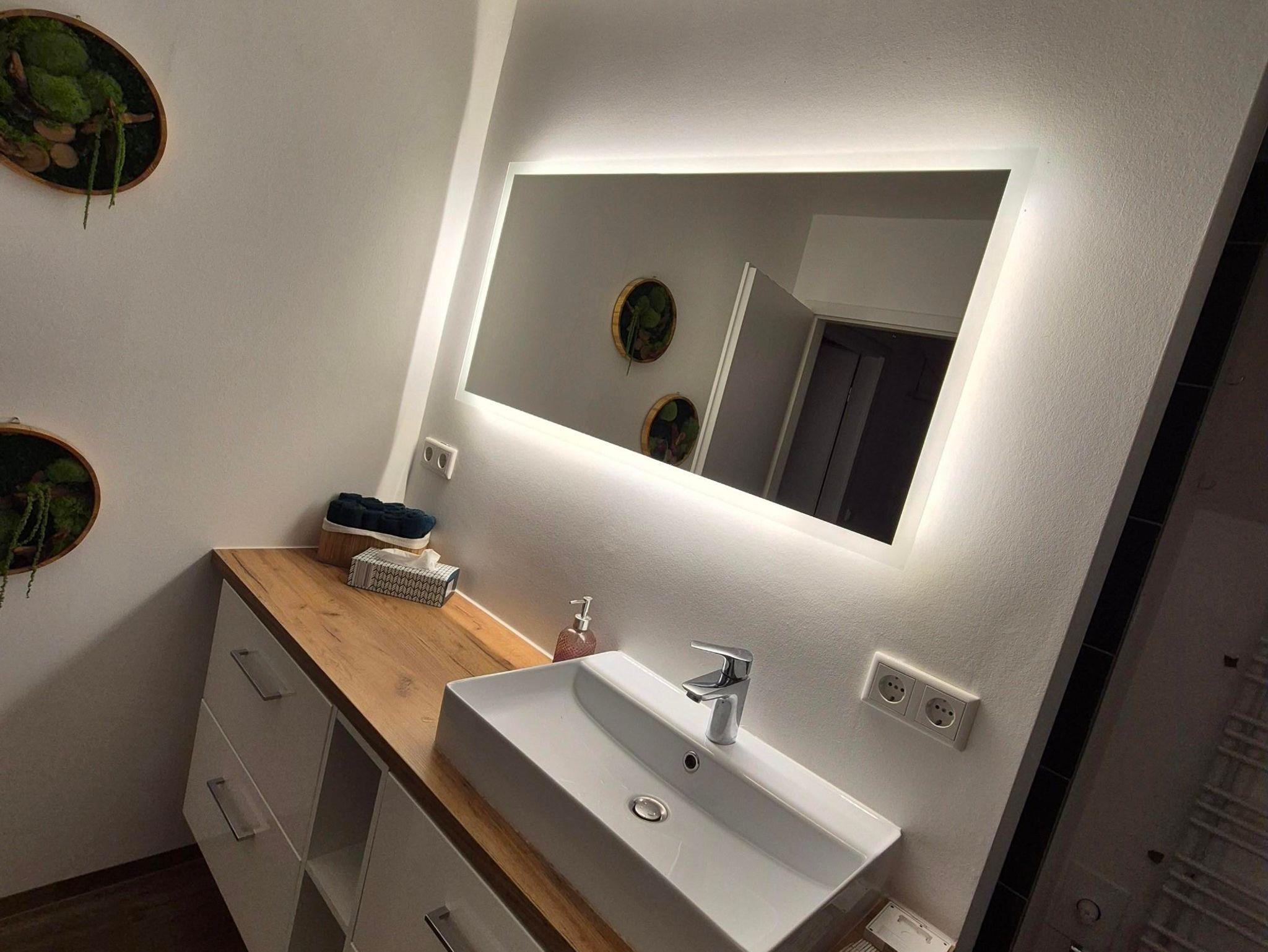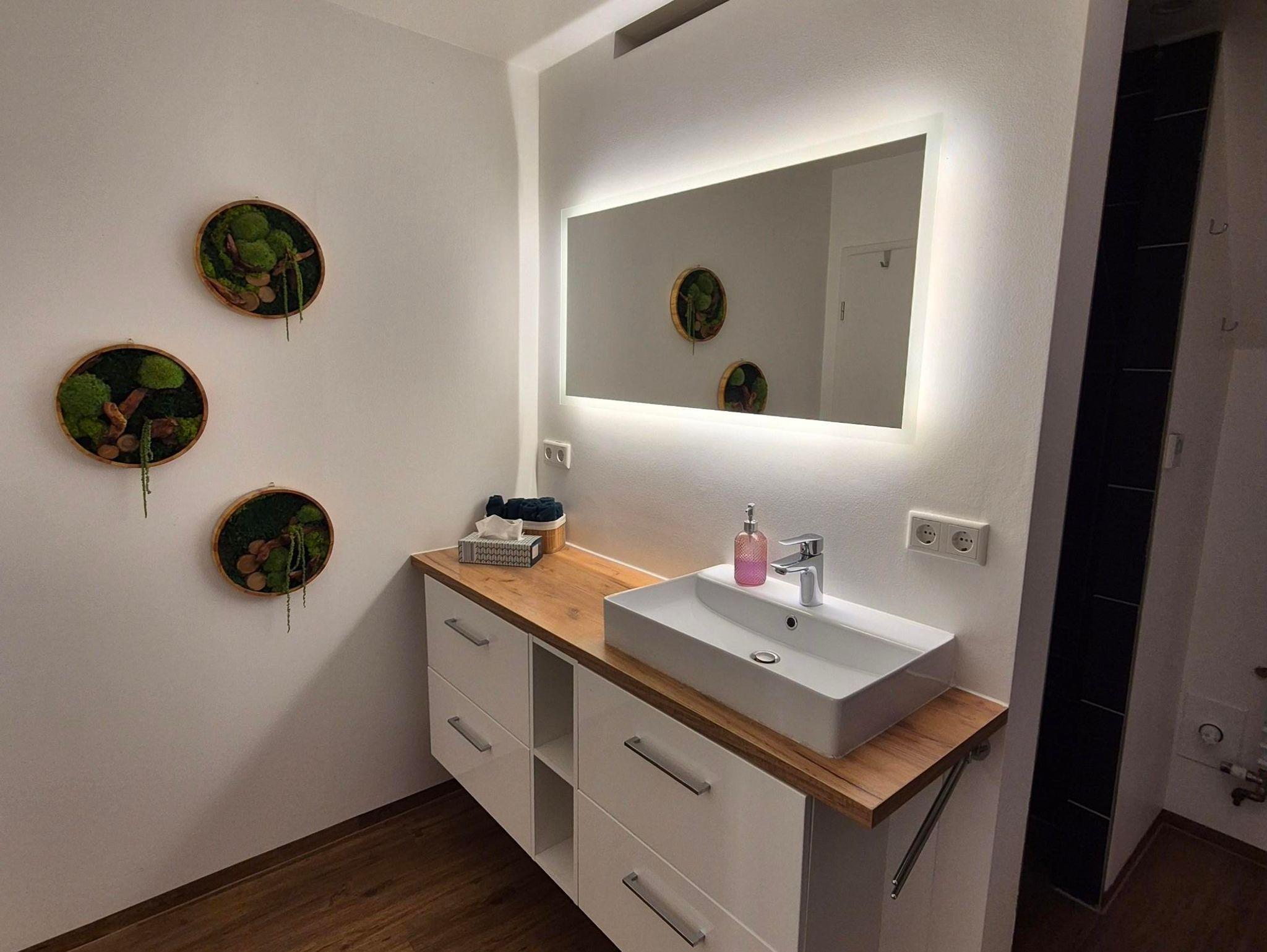 Auch das Vollbad wurde in dem Zuge kernsaniert und lädt durch seine warmen Töne zu einer längeren Dusche (Regendusche und Standardduschkopf mit Sitzfläche, ebenerdig) oder ein Vollbad ein. Ihr habt einen Föhn, Handtücher so viele wie ihr braucht, Duschvorleger und falls vergessen auch Zahnbürsten und Zahnpasta, wie auch WC-Papier.