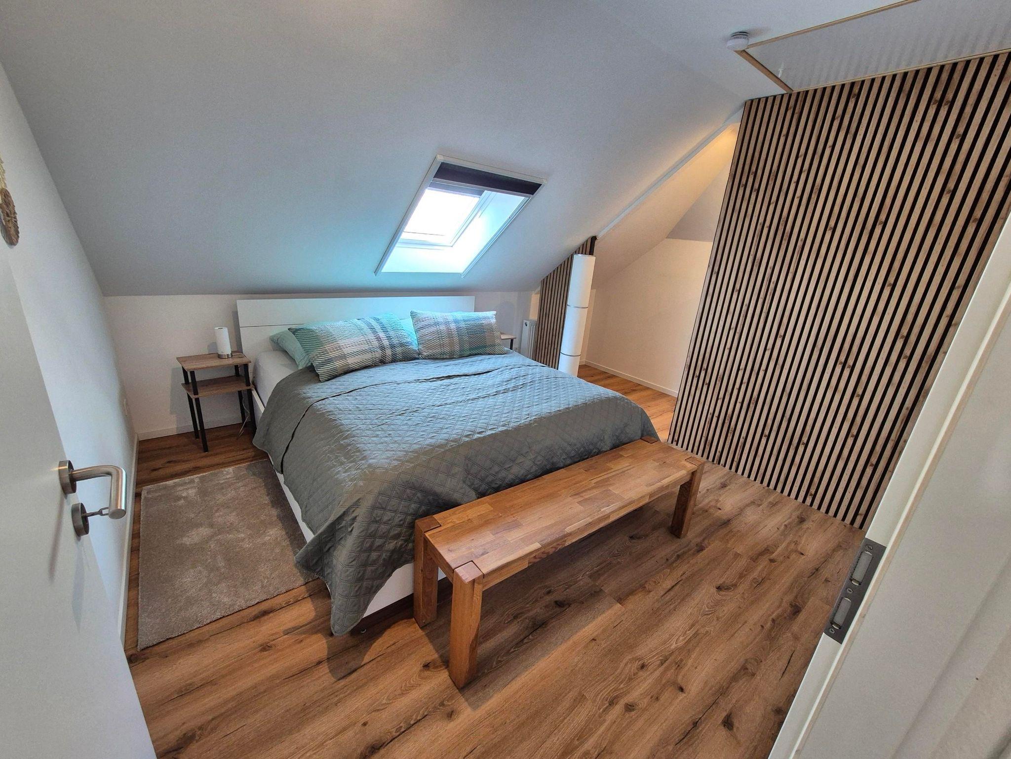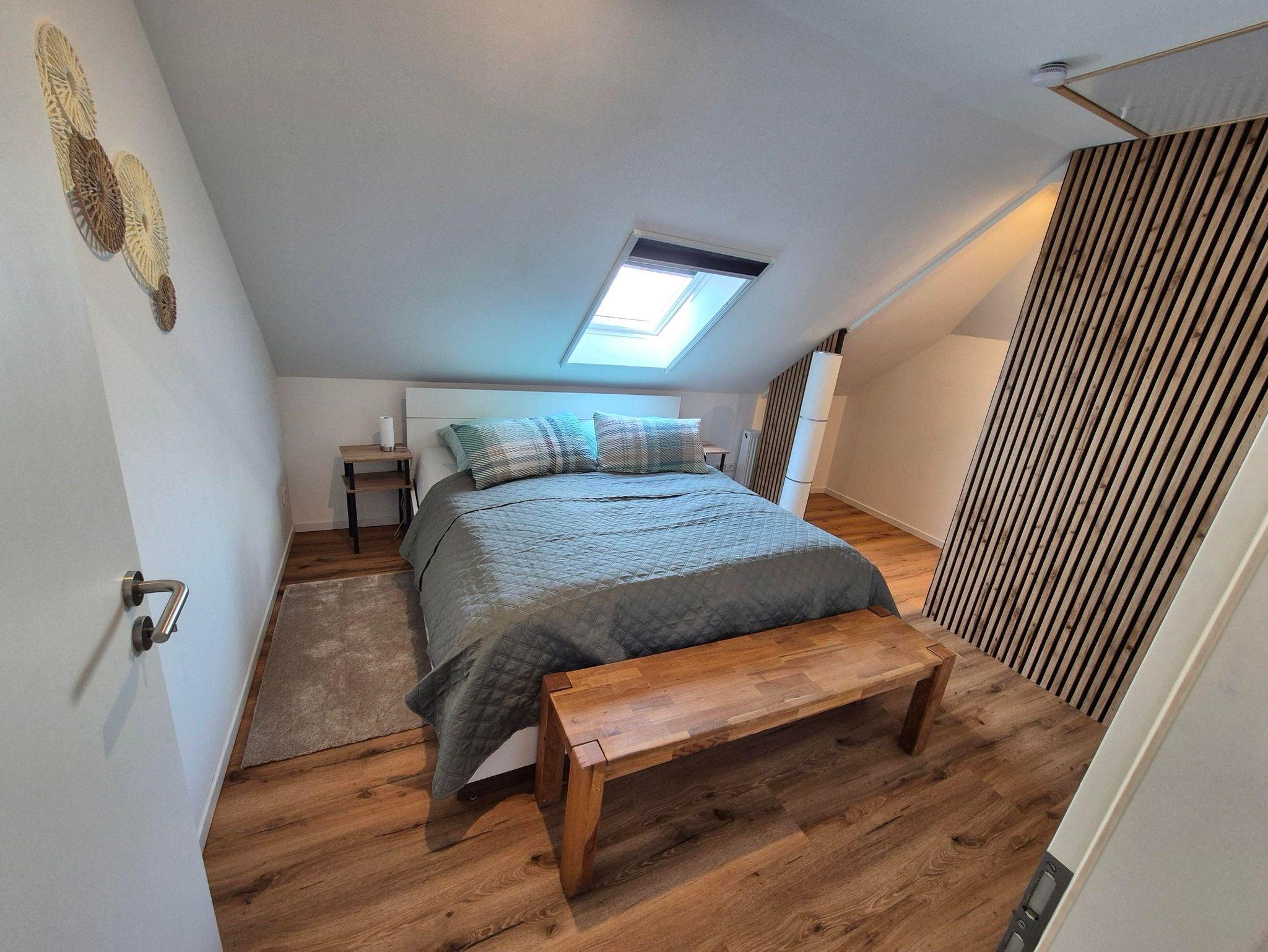 Auf 40qm habt ihr ein sehr geräumiges und kernsaniertes Schlafzimmer mit einem Doppelbett und begehbarem Kleiderschrank. Die 22cm hohen Kaltschaummatratzen werden euch schlafen lassen, wie auf Wolken.