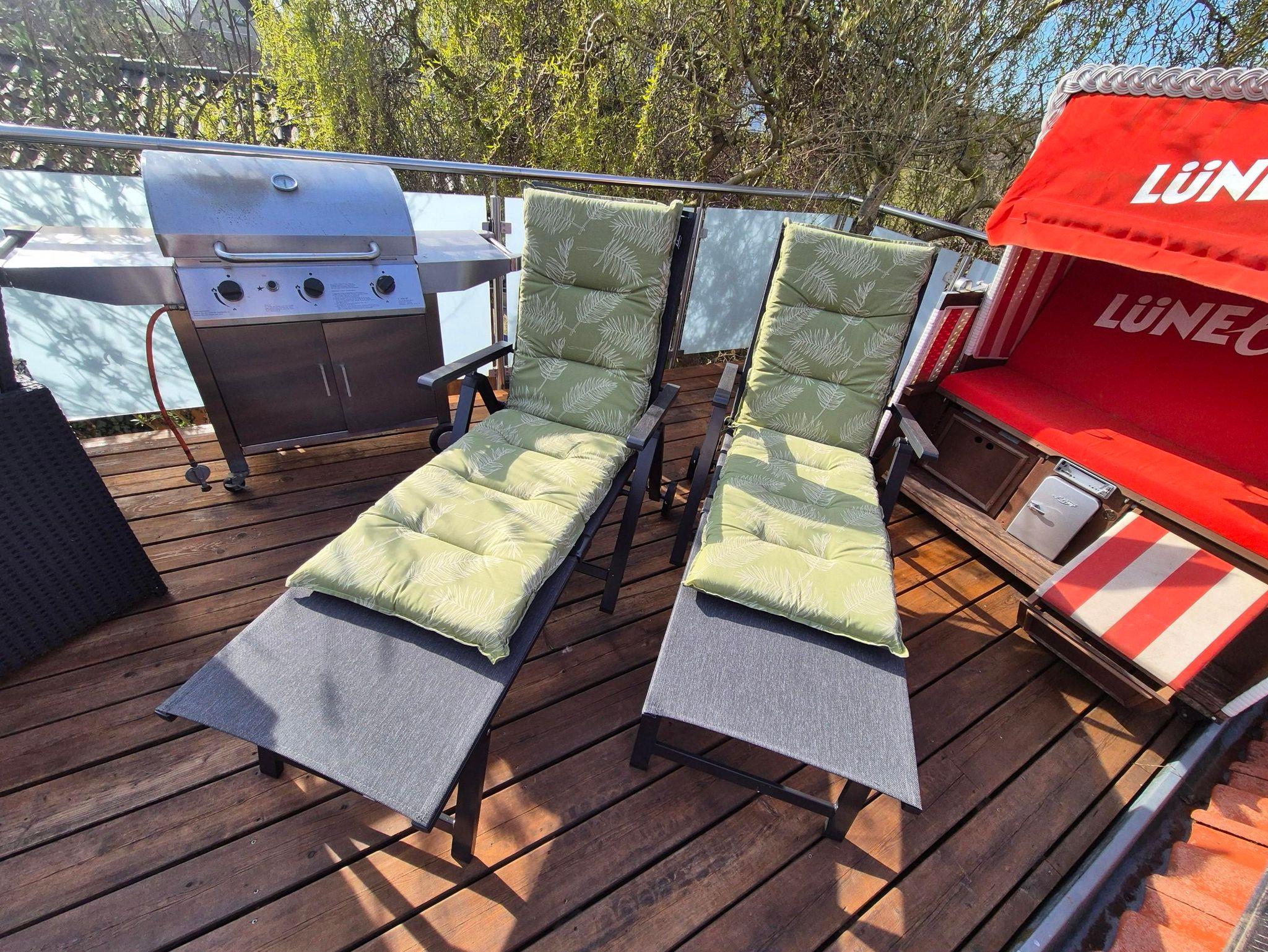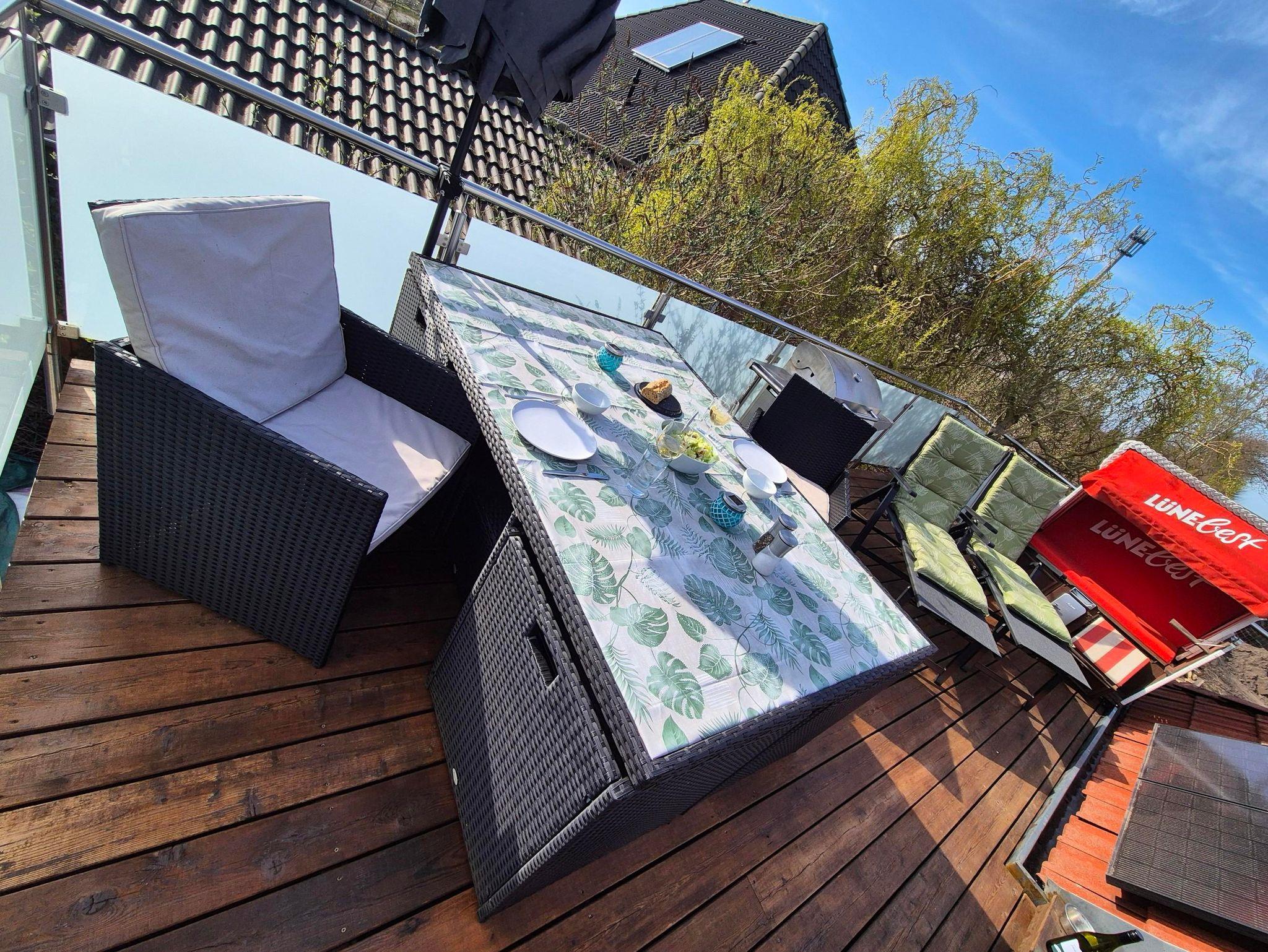 Auf der 25qm großen Dachterrasse mit bis zu 6 Essplätzen, Sonnenschirm, eigenem Gasgrill (Gas stelle ich zur Verfügung), Strandkorb und 2 Sonnenliegen habt ihr ein tolles Plätzchen um jeden Sonnenstrahl voll auszukosten. Die Wohnung befindet sich im Obergeschoss eines Einfamilienhauses. Das Obergeschoss ist teilweise kernsaniert und erst in 2025 zu einer Ferienwohnung hergerichtet worden.