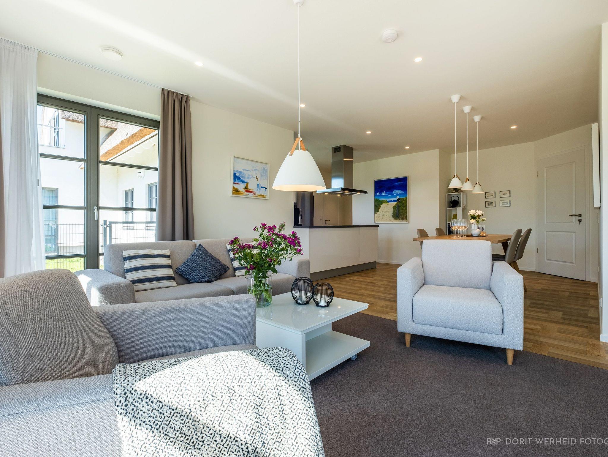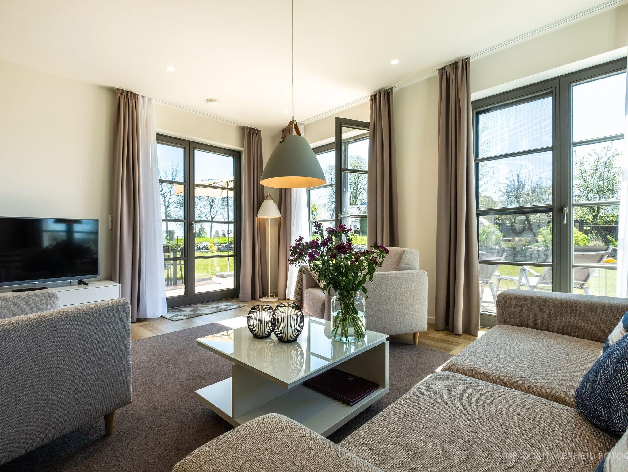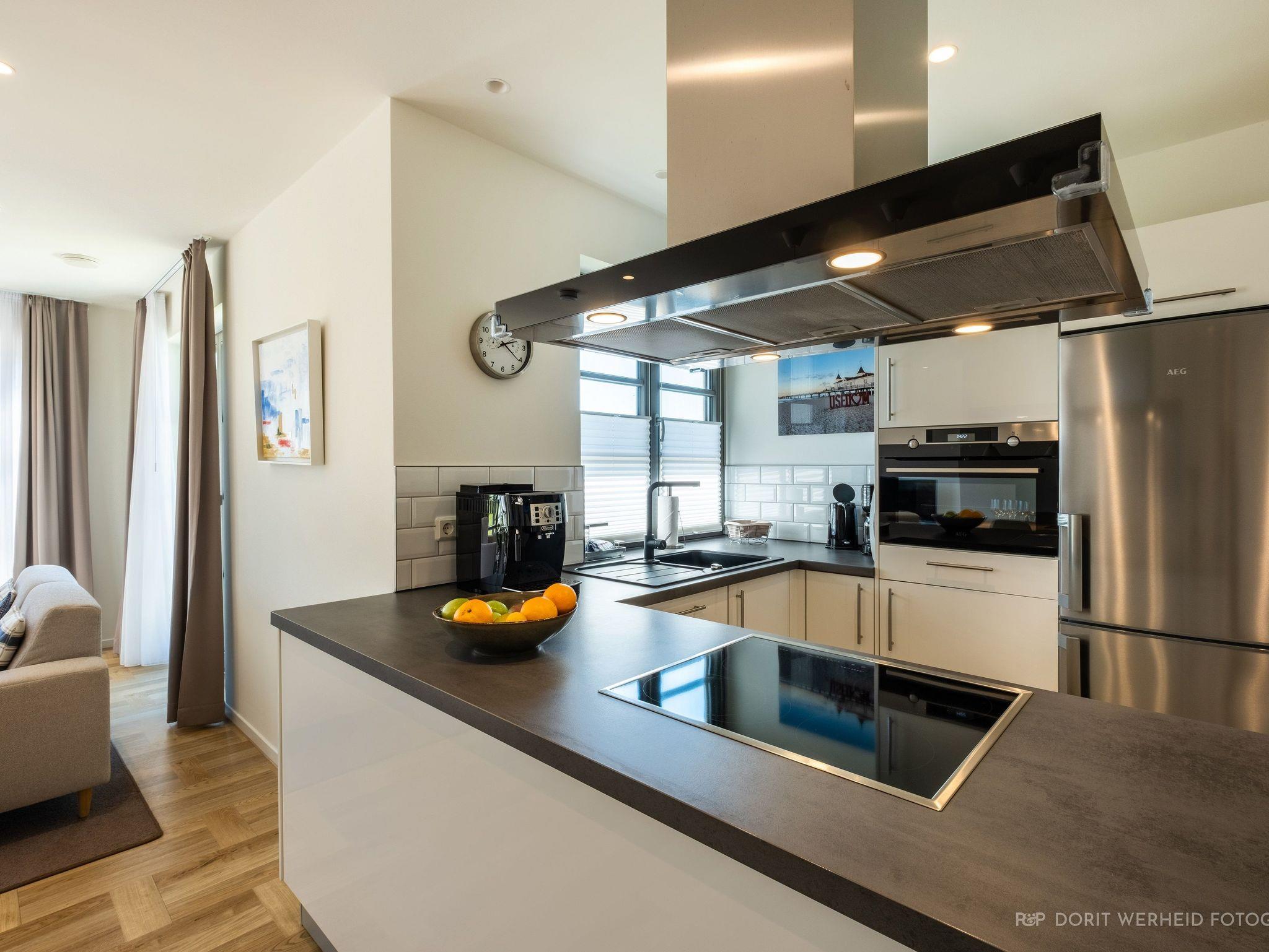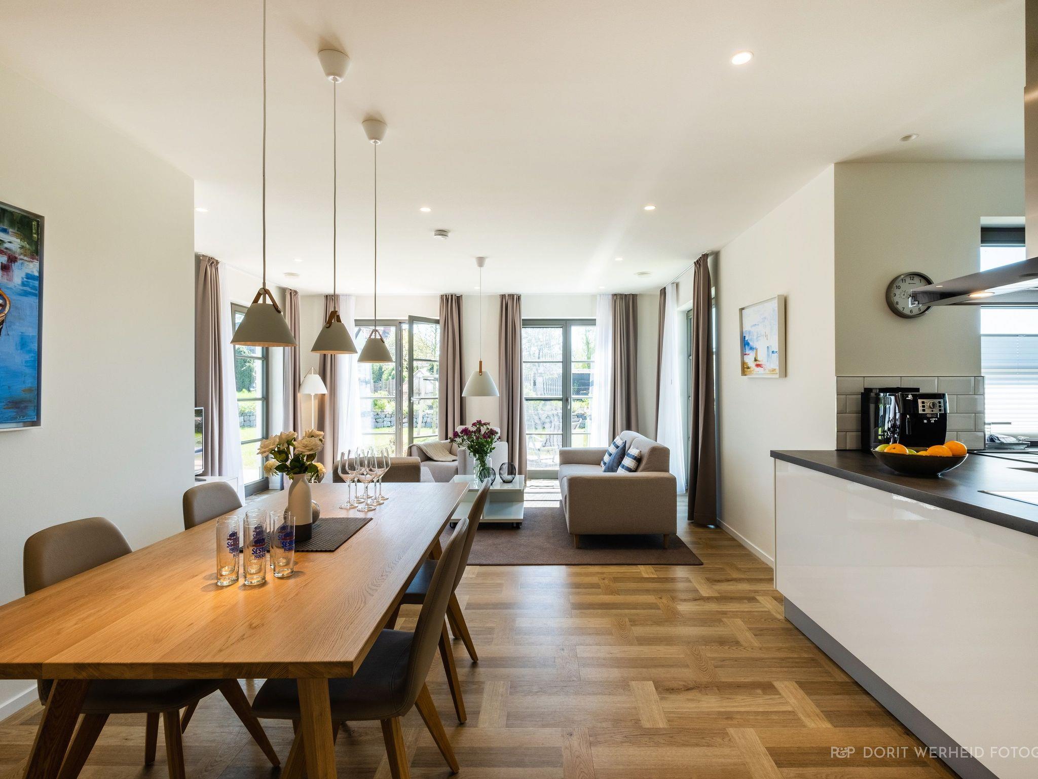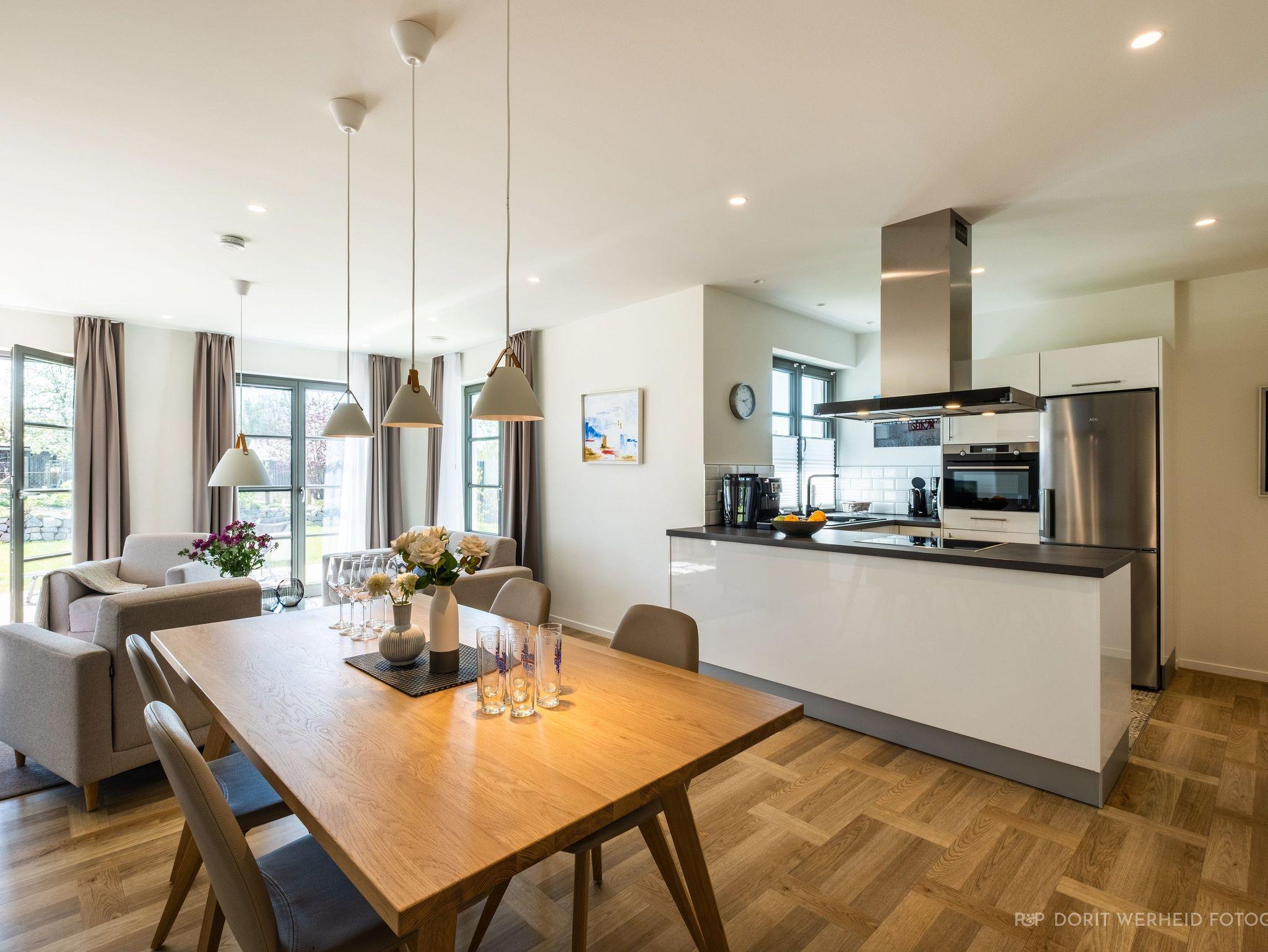 Die Wohnung ist sehr hochwertig ausgestattet. Sie verfügt über eine komplett eingerichtete Einbauküche mit Spülmaschine, Mikrowelle, Induktionsherd, großem Kühlschrank mit separatem Gefrierabteil und Kaffeevollautomat. Ebenfalls verfügt die Wohnung über eine Waschmaschine. Der Wohnraum bietet durch die großzügige Verglasung einen weiten Blick über die Felder und das Haff. Es gibt zwei Terrassen (30m²) und einen großen Garten, die nach Süden ausgerichtet sind. Zwei große Bäder sind mit einer bodentiefen Dusche mit Glastrennung ausgestattet.