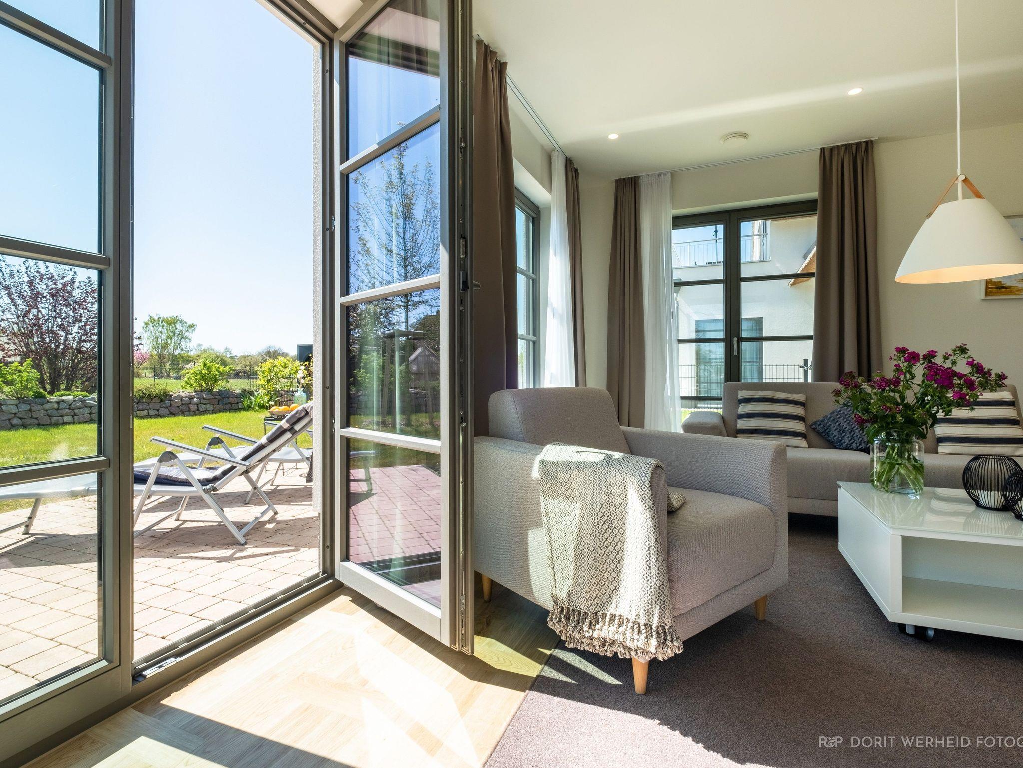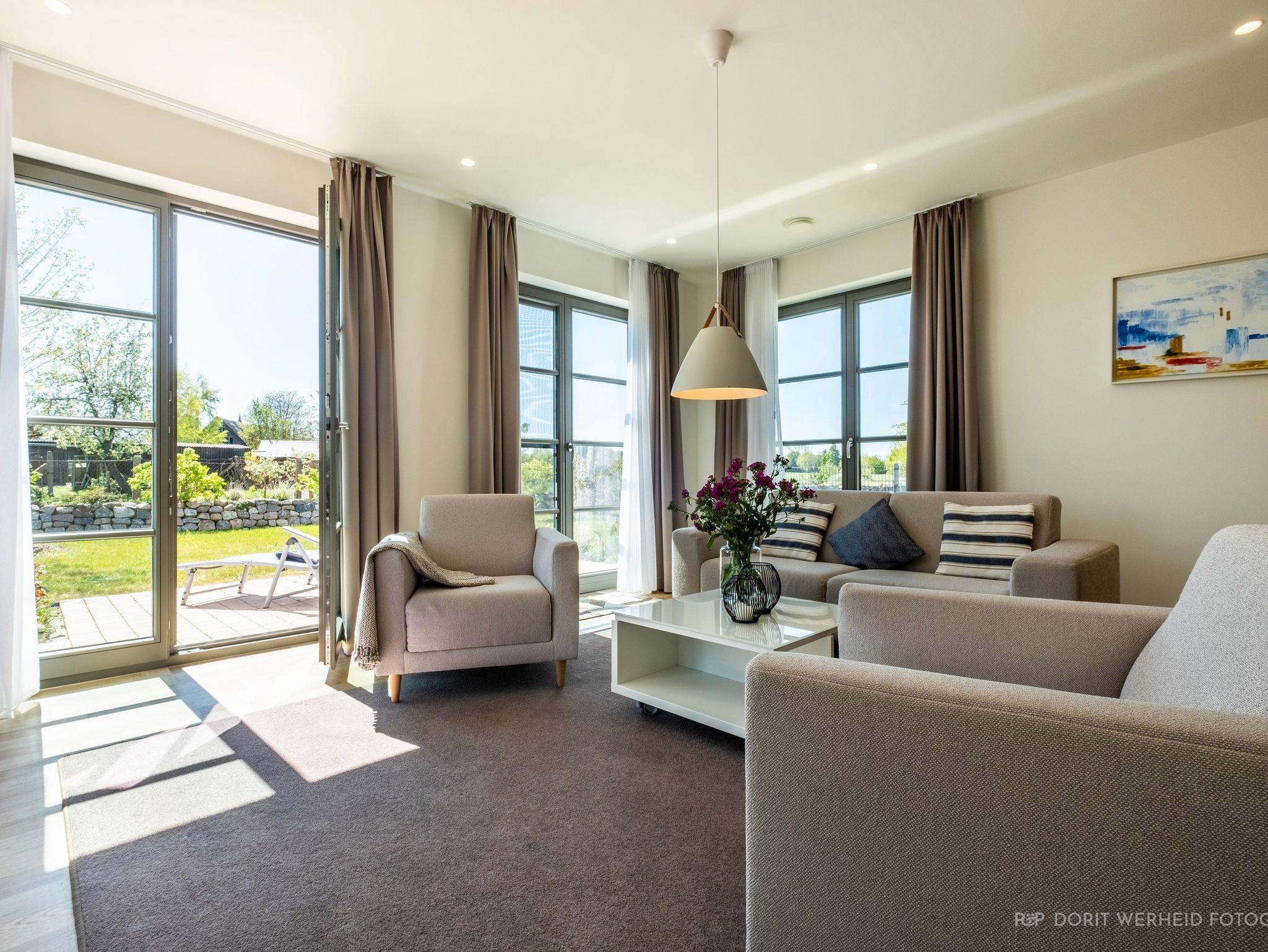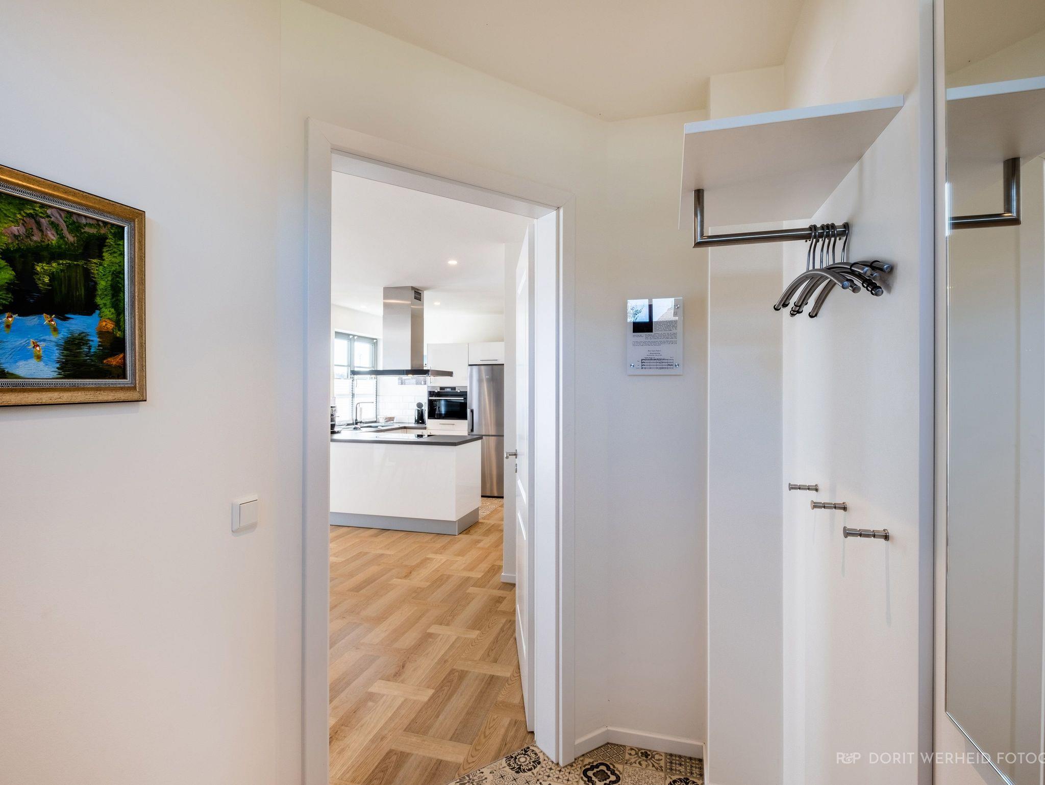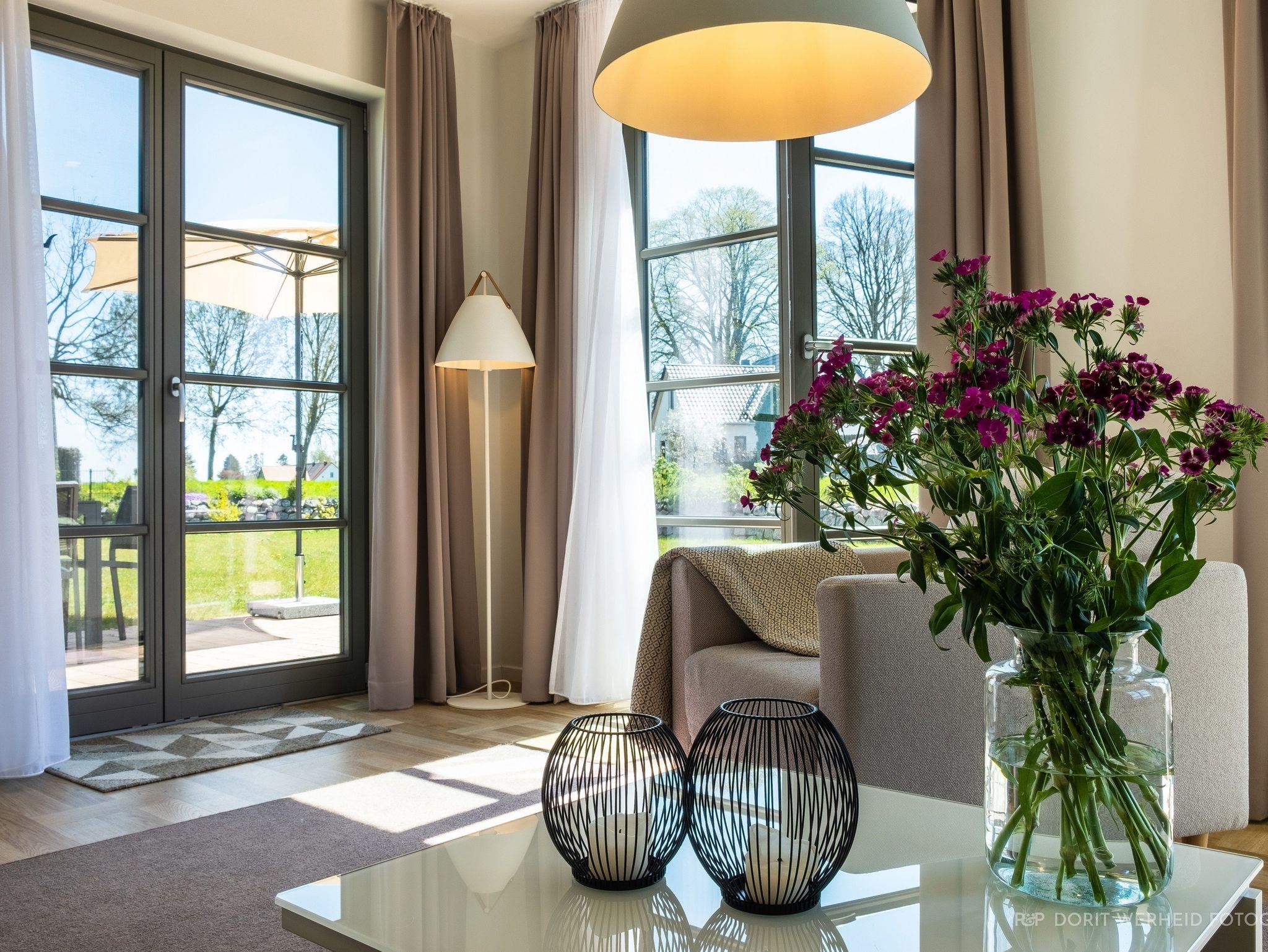 Die Wohnung ist sehr hochwertig ausgestattet. Sie verfügt über eine komplett eingerichtete Einbauküche mit Spülmaschine, Mikrowelle, Induktionsherd, großem Kühlschrank mit separatem Gefrierabteil und Kaffeevollautomat. Ebenfalls verfügt die Wohnung über eine Waschmaschine. Der Wohnraum bietet durch die großzügige Verglasung einen weiten Blick über die Felder und das Haff. Es gibt zwei Terrassen (30m²) und einen großen Garten, die nach Süden ausgerichtet sind. Zwei große Bäder sind mit einer bodentiefen Dusche mit Glastrennung ausgestattet.