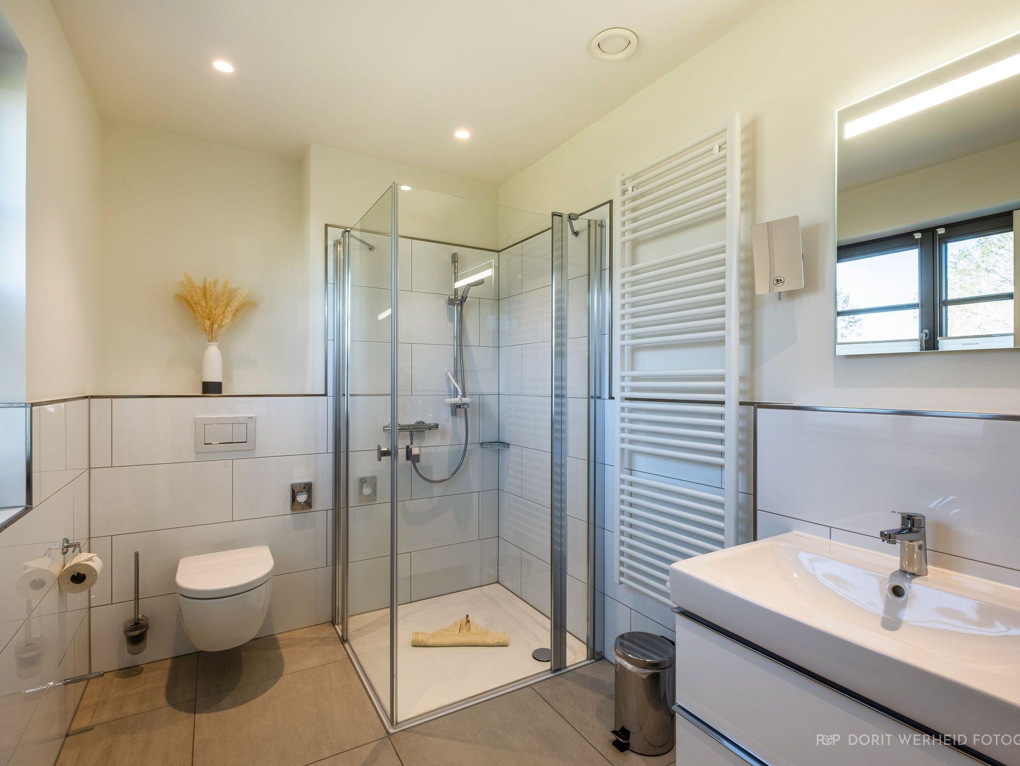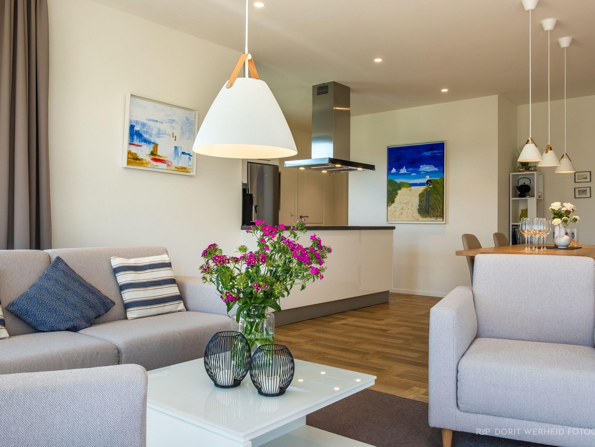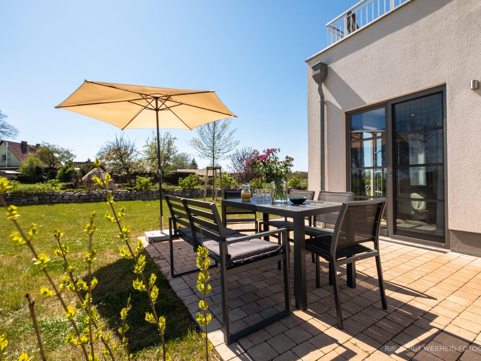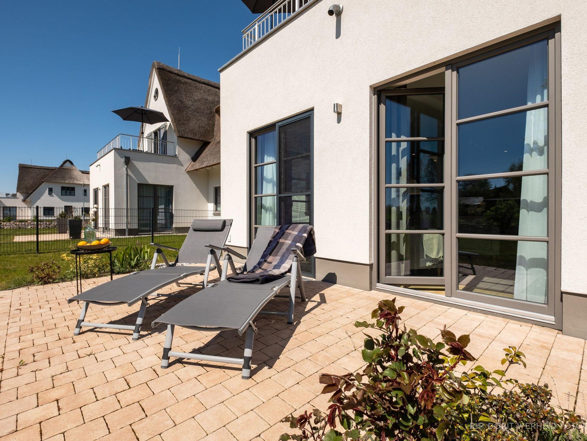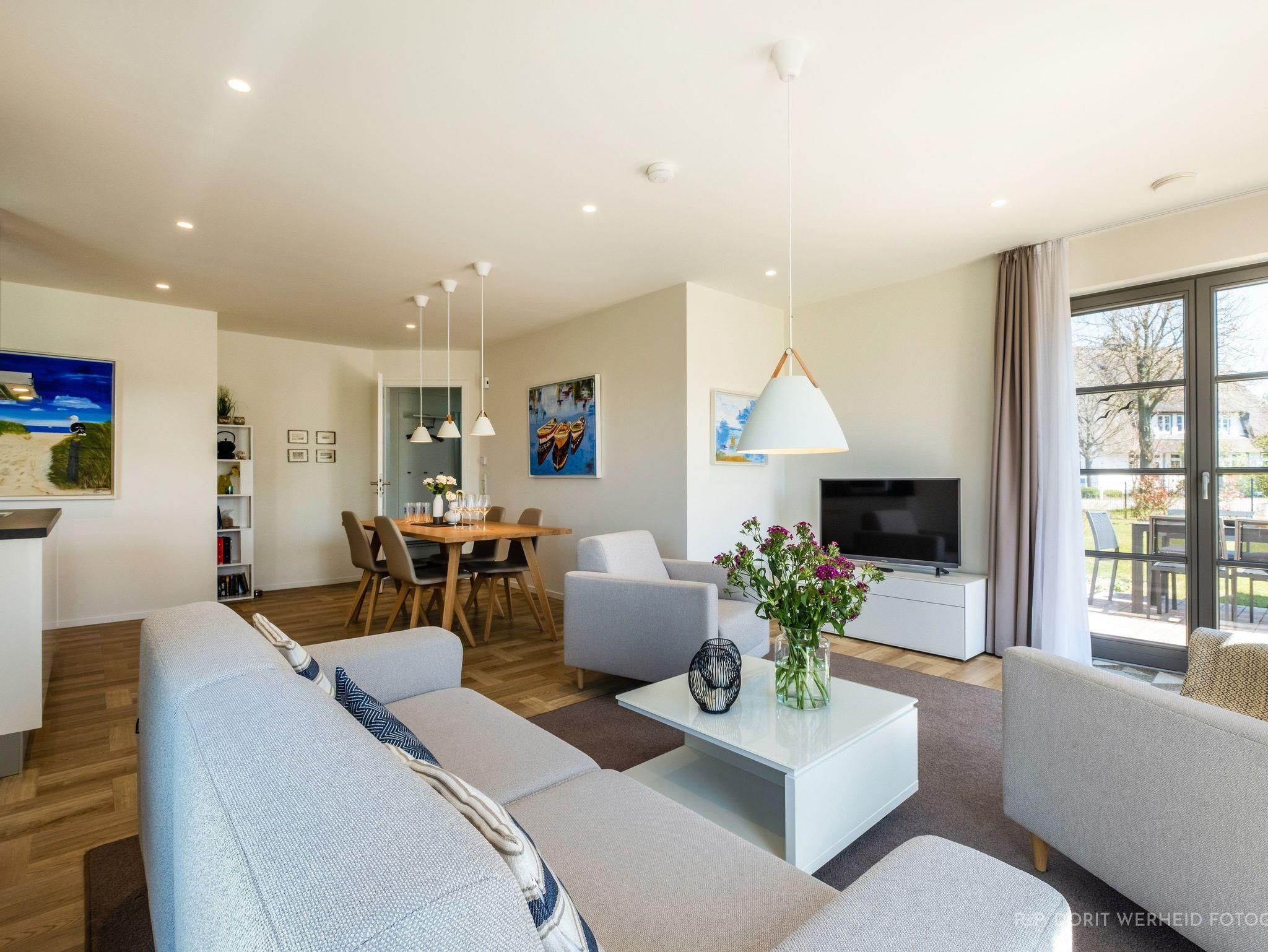 Die Wohnung ist sehr hochwertig ausgestattet. Sie verfügt über eine komplett eingerichtete Einbauküche mit Spülmaschine, Mikrowelle, Induktionsherd, großem Kühlschrank mit separatem Gefrierabteil und Kaffeevollautomat. Ebenfalls verfügt die Wohnung über eine Waschmaschine. Der Wohnraum bietet durch die großzügige Verglasung einen weiten Blick über die Felder und das Haff. Es gibt zwei Terrassen (30m²) und einen großen Garten, die nach Süden ausgerichtet sind. Zwei große Bäder sind mit einer bodentiefen Dusche mit Glastrennung ausgestattet.