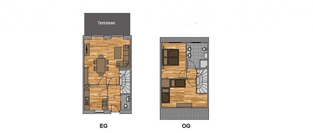 Im Obergeschoss sind zwei Schlafzimmern mit einem Komfortdoppelbett und 2 Einzelbetten. Eine Aufbettung des grossen Kuschelsofas im Erdgeschoss ermöglicht einen Schlafplatz für zwei weitere Personen.