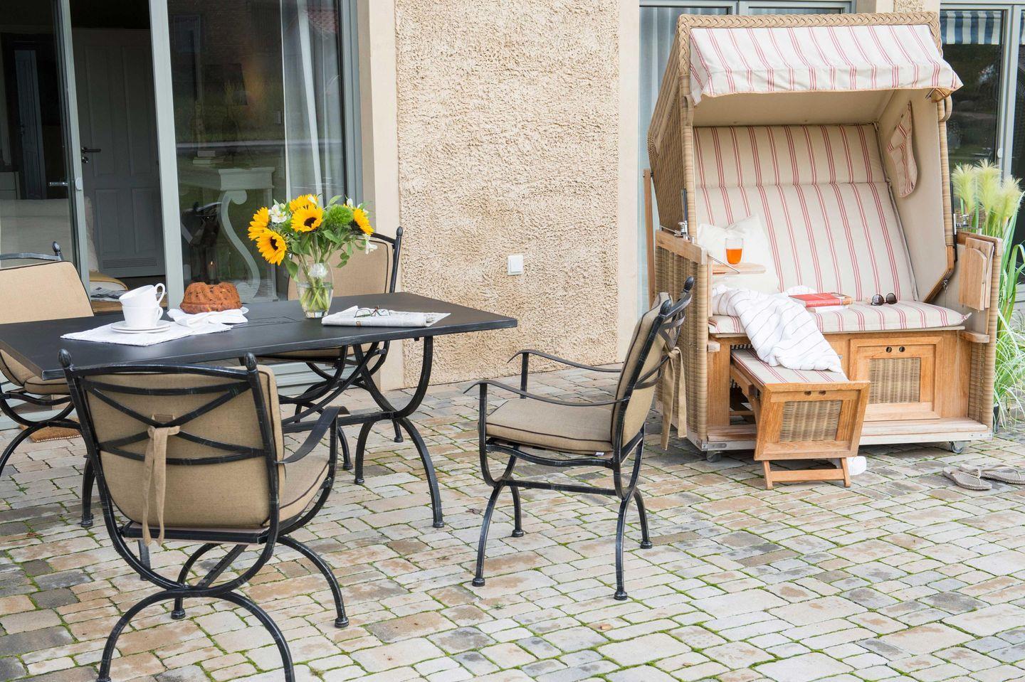 Zur weiteren Ausstattung gehören Fön, Kosmetikspiegel, Flat-TV, Telefon, freies WLAN, ein Strandkorb auf der Terrasse und ein kostenfreier Parkplatz.