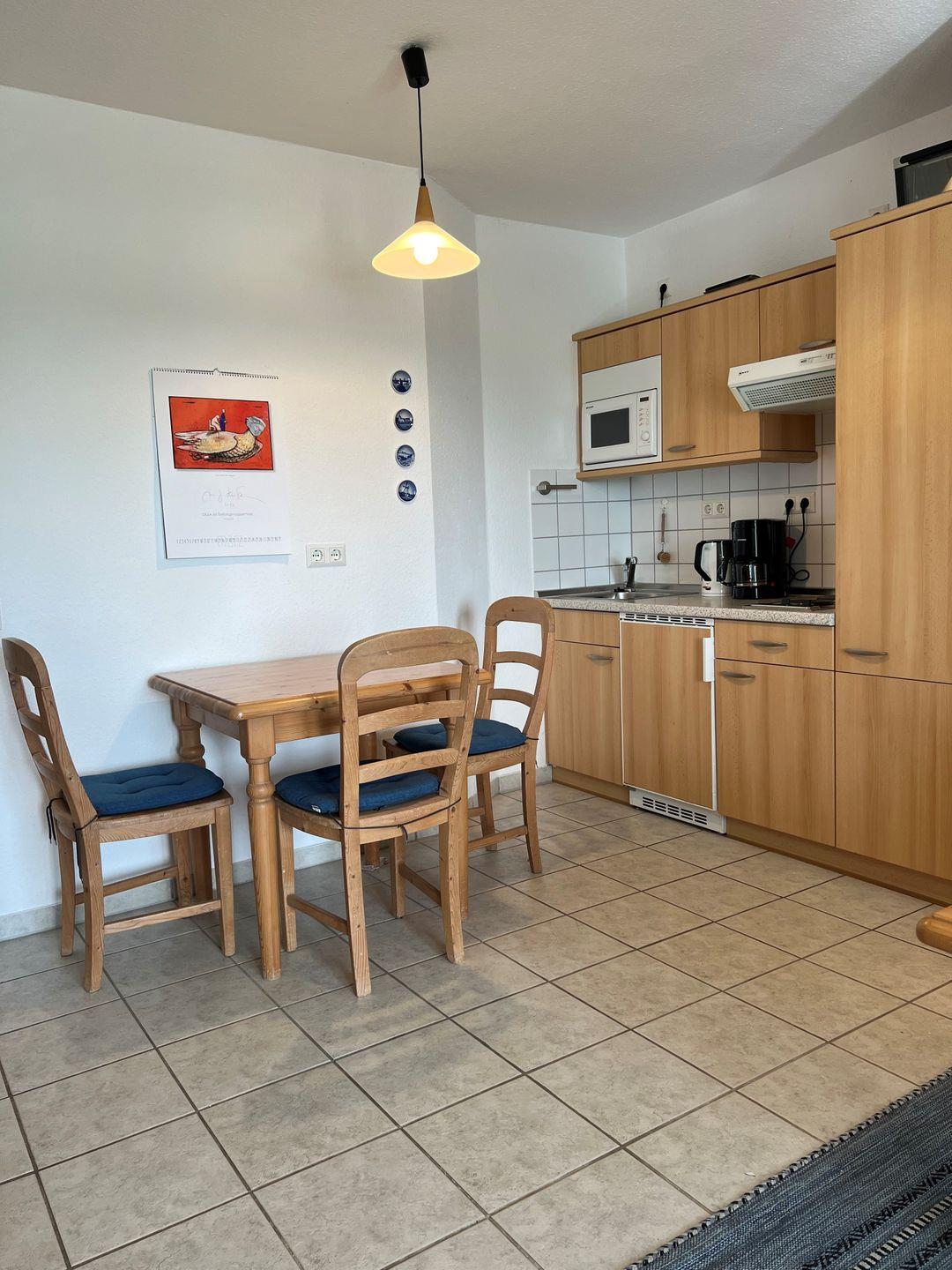 Im Schlafzimmer befindet sich ein Doppelbett. Das Wohn-und Esszimmer mit Kochnische hat als zusätzliche Schlafmöglichkeit eine ausziehbare Couch mit 160 x 200 cm Liegefläche, so das die Wohnung bis zu vier Personen beherbergen kann. Ein Parkplatz ist direkt am Haus. Zu der gepflegten Anlage gehört ein Spielplatz mit eigenem Spielschiff, einem Fußballtor, einer Tischtennisplatte und ein Grillbereich, der von allen genutzt werden kann.