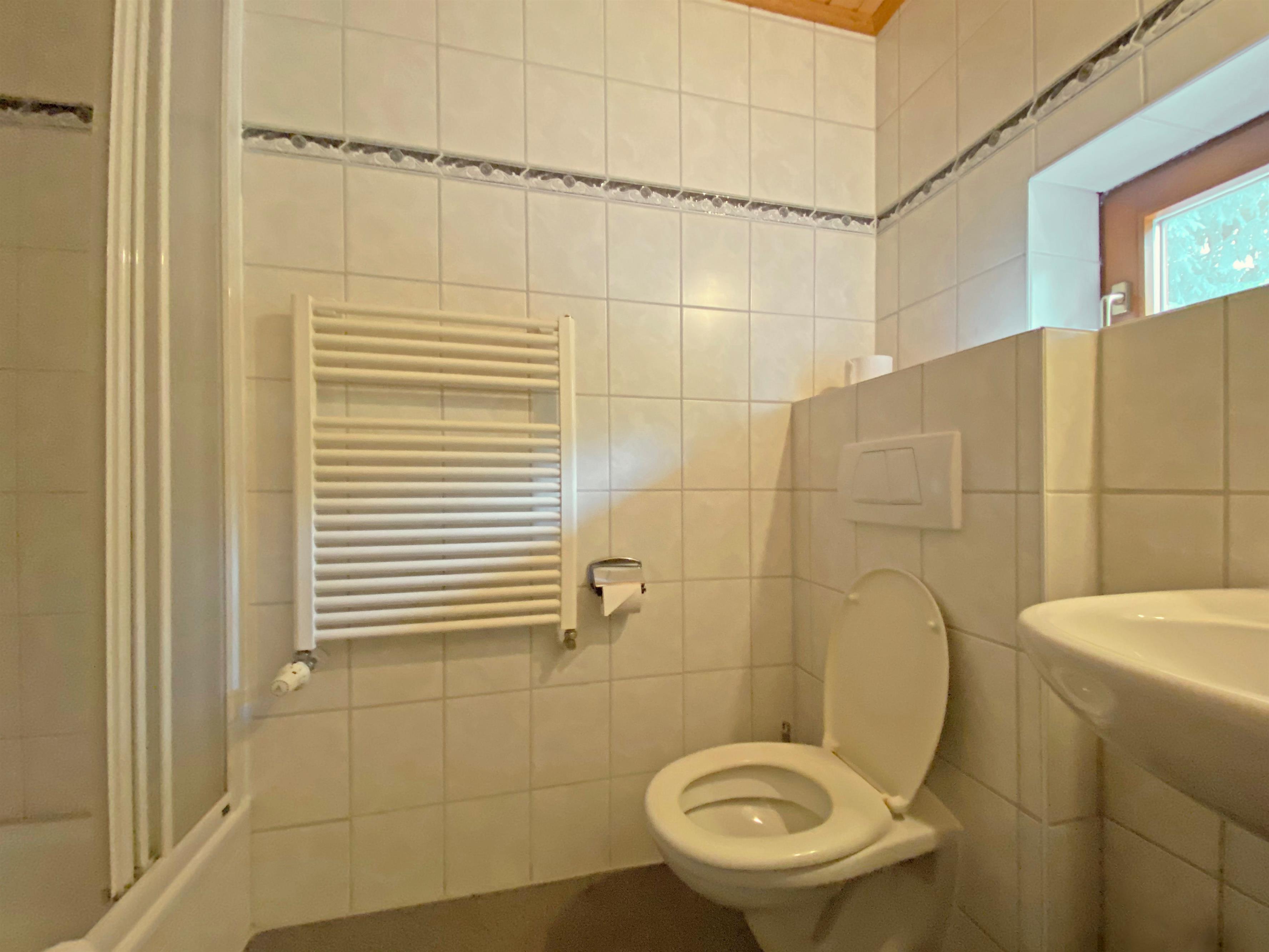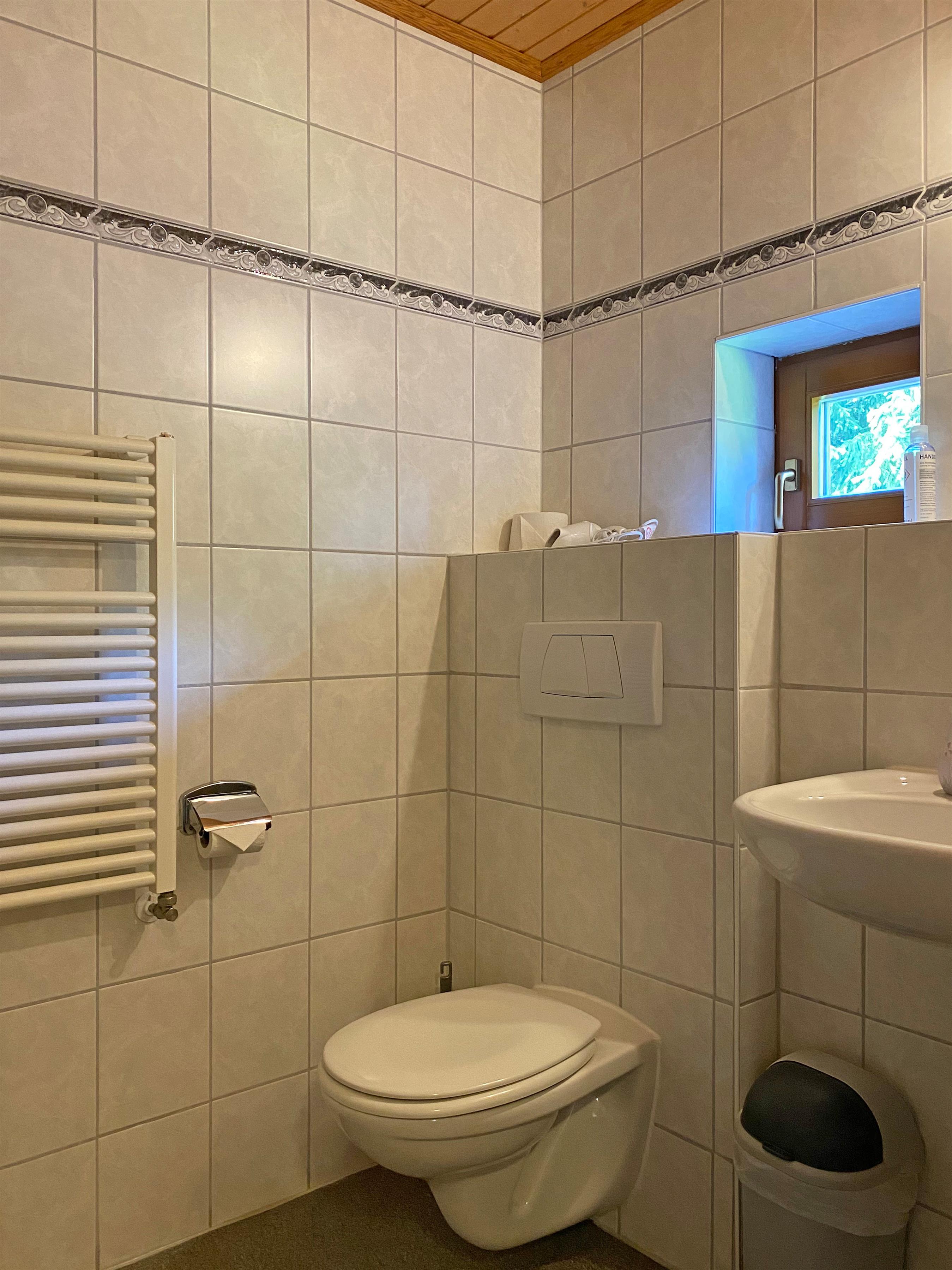 Das Zimmer ist über eine massive Treppe mit 18 bequemen Stufen erreichbar, die durchgehend mit einem stabilen Holzhandlauf ausgestattet ist. Die Durchgangshöhe durch ein Gewölbe im Erdgeschoss beträgt 1,90 m. Das Zimmer verfügt über ein nach Westen ausgerichtetes Fenster sowie ein separates Bad mit Du/WC. Ein kleines Lüftungsfenster im Bad bringt zusätzlichen Komfort. Zur weiteren Ausstattung des Zimmers gehören ein Sat-TV, der unter der Zimmerdecke montiert ist, ein Beistelltisch mit 2 Stühlen, ein großer Spiegelschrank, 2 Nachttischschränkchen und ein Standventilator. Im Bad liegt ein Haartrockner bereit. WLAN steht im Zimmer als auch in der Gaststätte zur Verfügung.