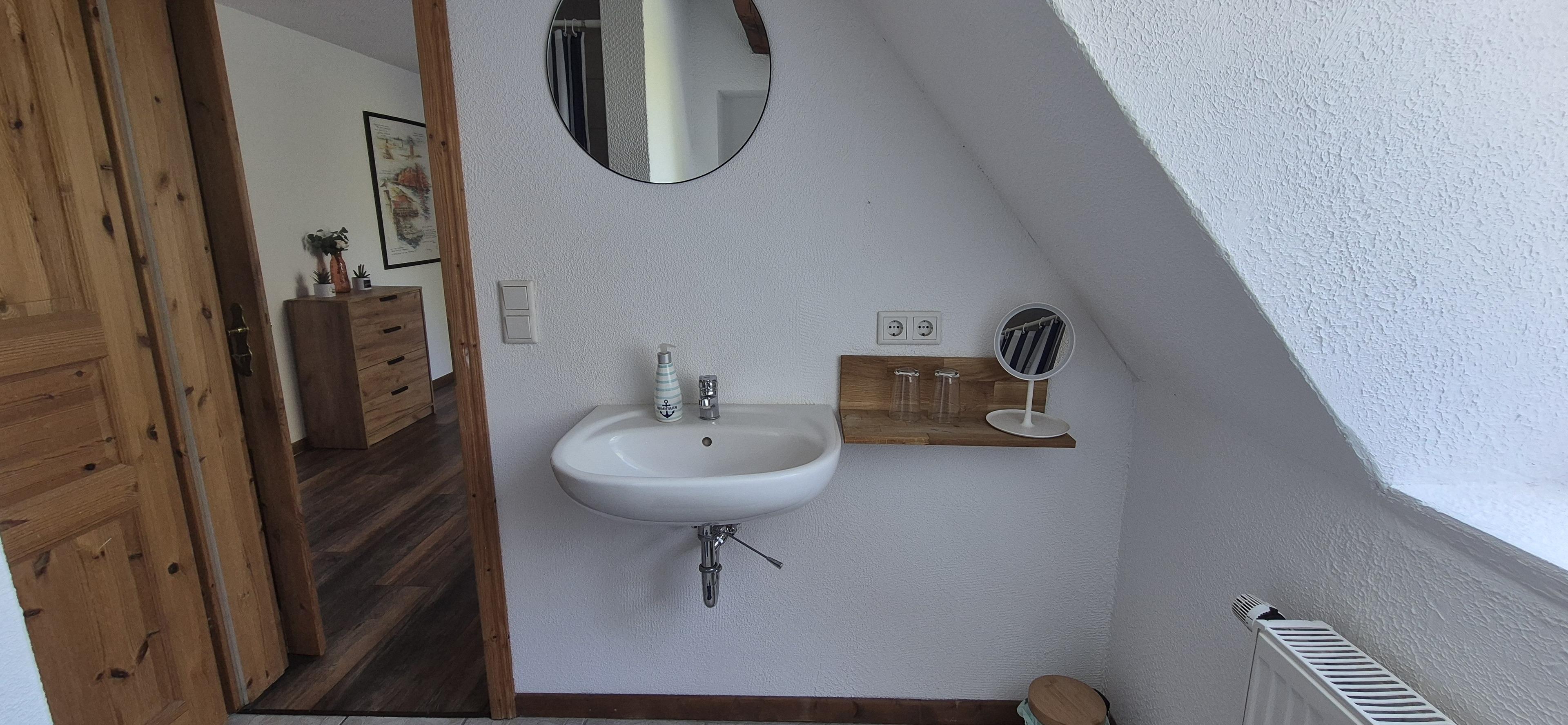 Die Wohnung betreten Sie über die wunderbare Holztreppe. In der Wohnung ist im vorderen Bereich das große Schlafzimmer mit dem KingSize Bett und dem daran anschliessenden Badezimmer. Die Holzbalkendecke gibt dem Raum eine gemütliche Atmosphäre. Im Bett liegend sehen Sie durch das Dachfenster unseren wunderbaren Sternenhimmel.
