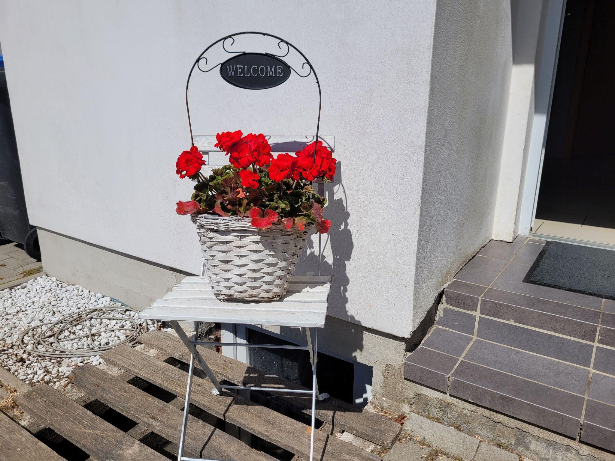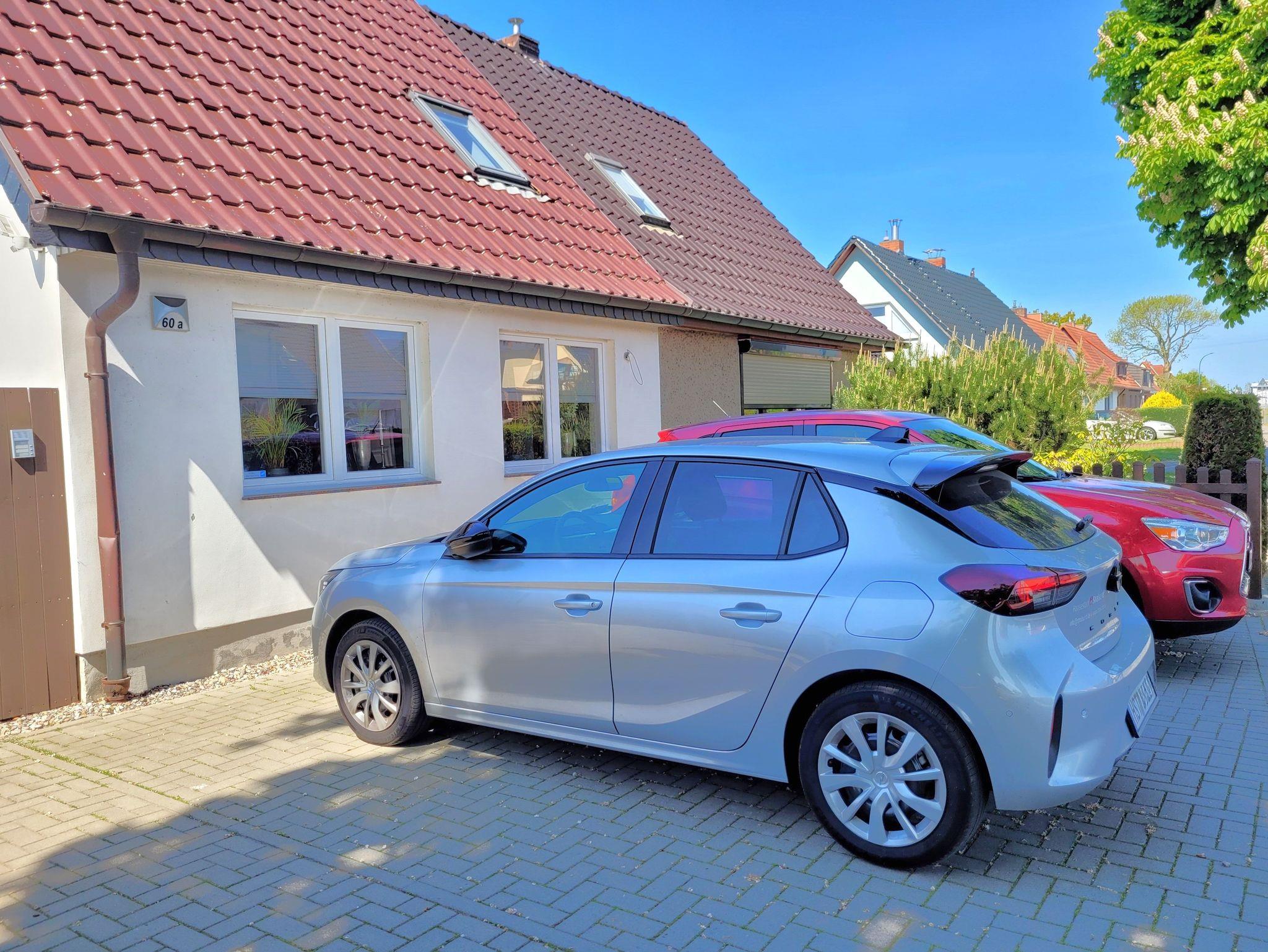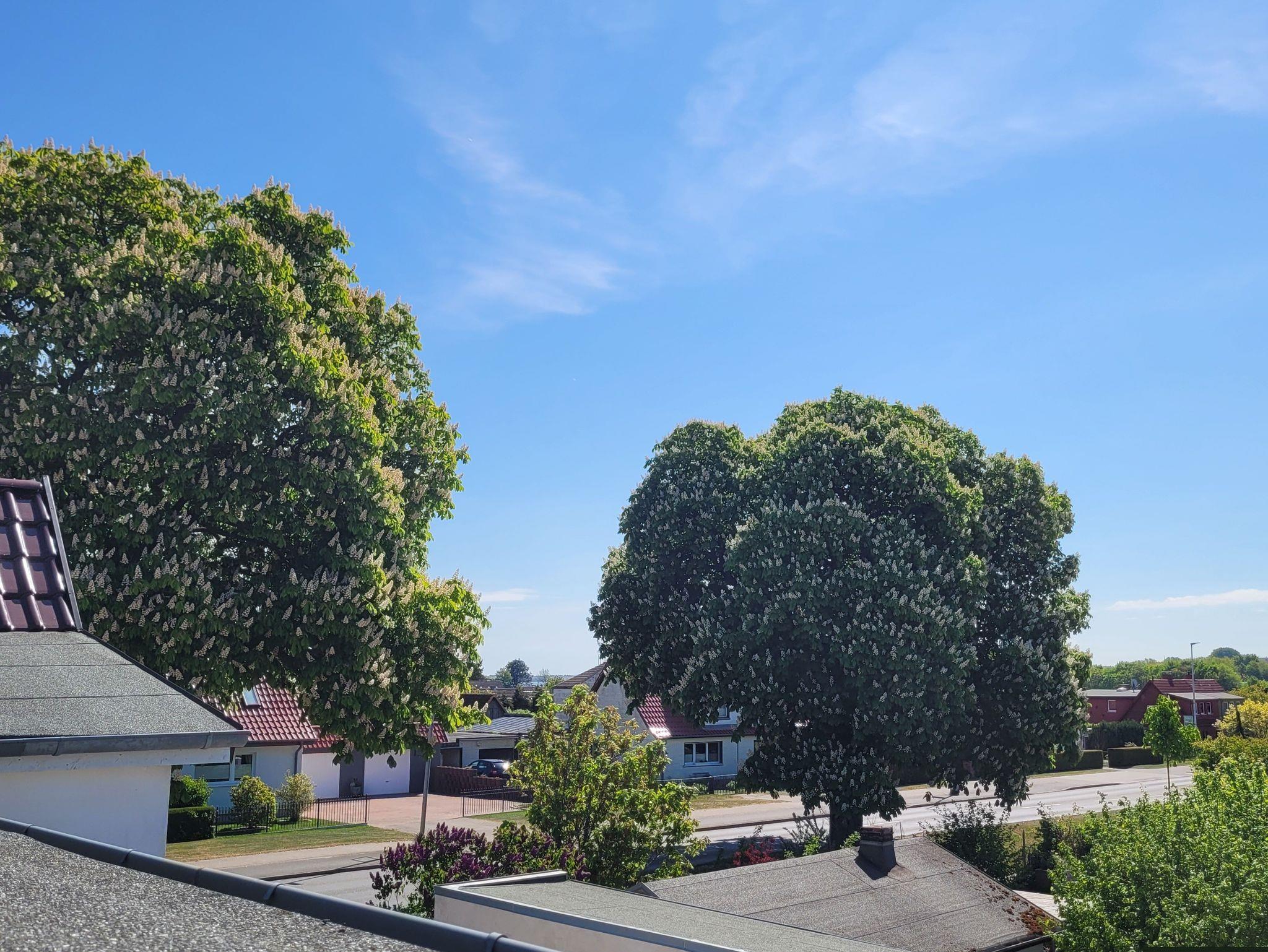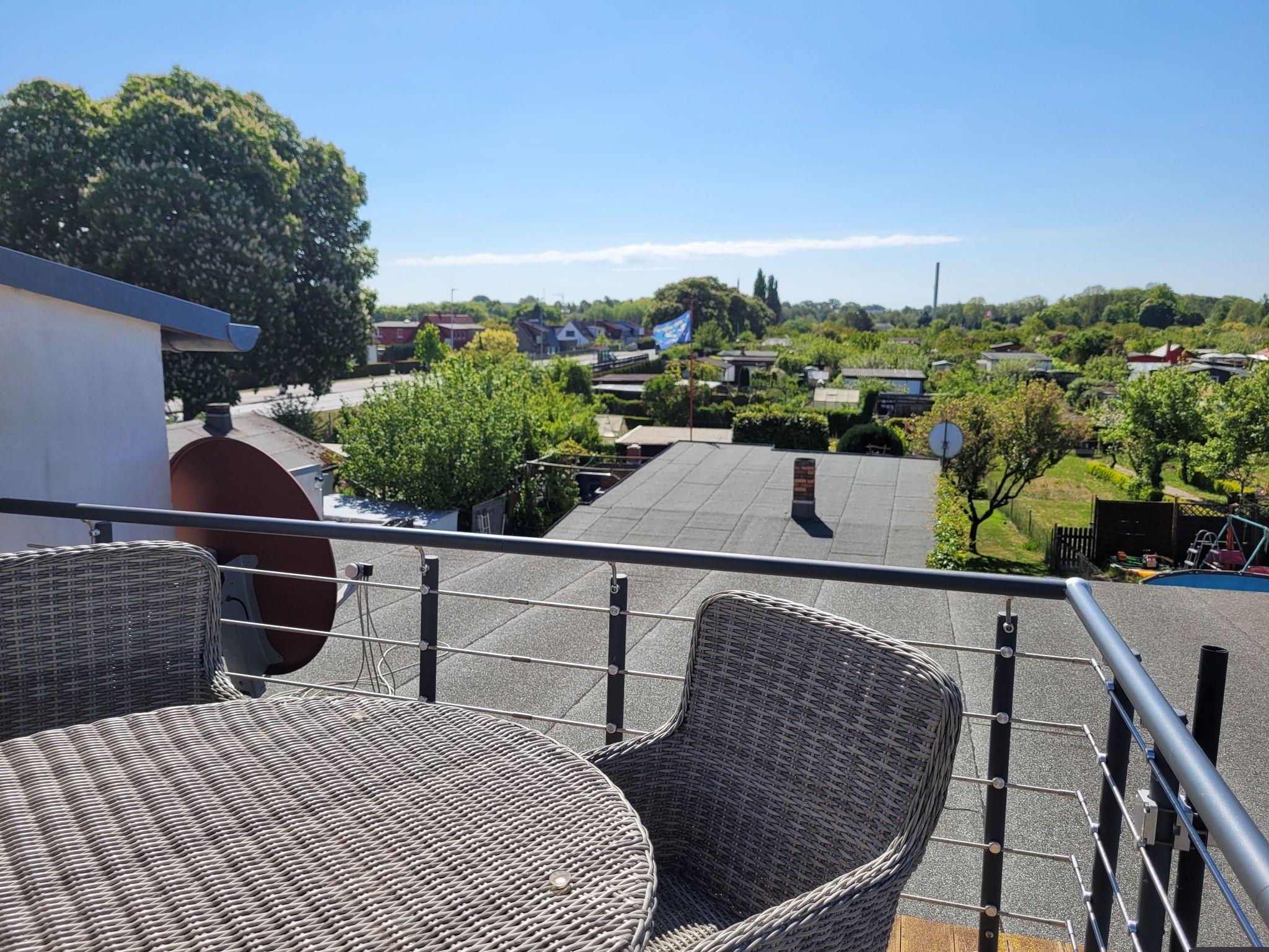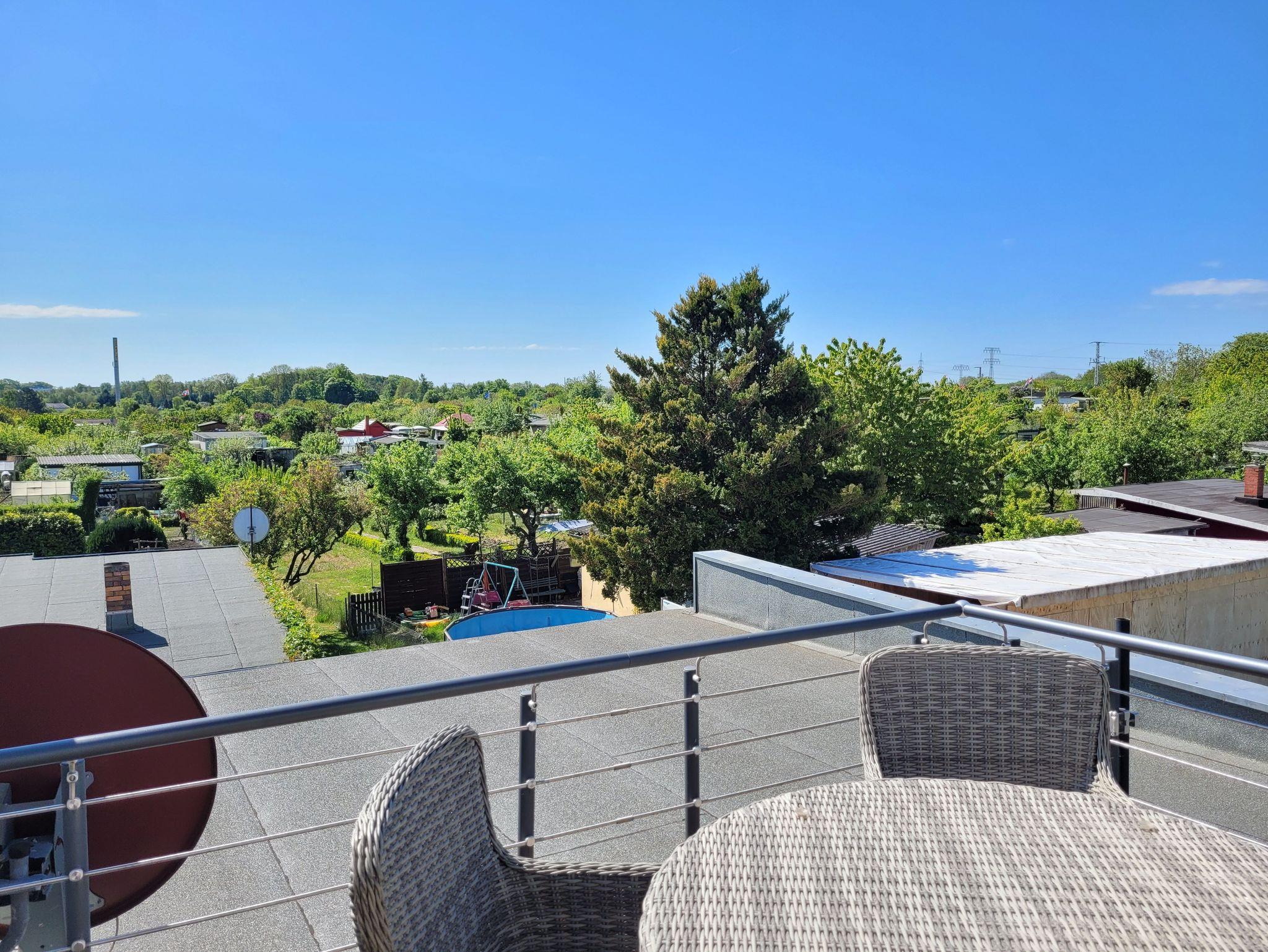 Unsere 2-Raum-Ferienwohnung ist mit einer Dachterrasse ausgestattet. Von hier aus haben Sie einen schönen Ausblick auf die Kleingartenanlage und können durch die Bäume den Strelasund durchblitzen lassen. Am Haus steht Ihnen ein kostenfreier Parkplatz zur Verfügung. Fahrräder können auf dem Hof abgestellt werden. Nach Rücksprache mit dem Vermieter können E-Räder im Außenbereich geladen und auch sicher untergestellt werden.