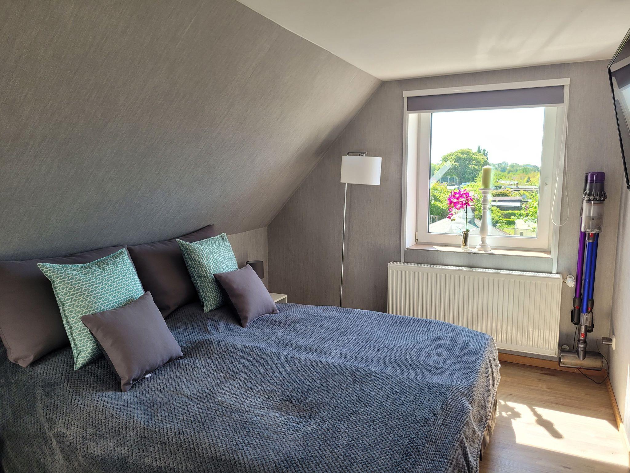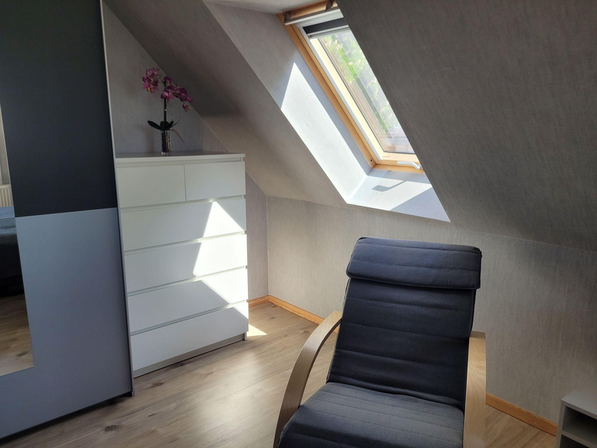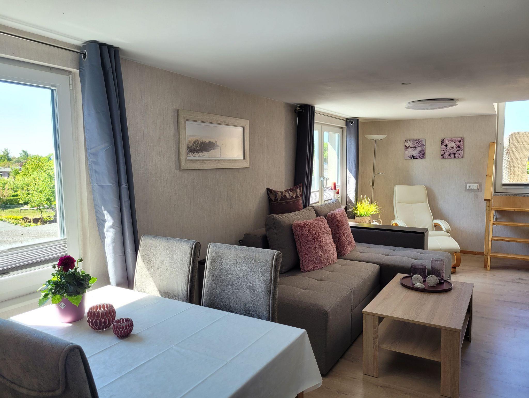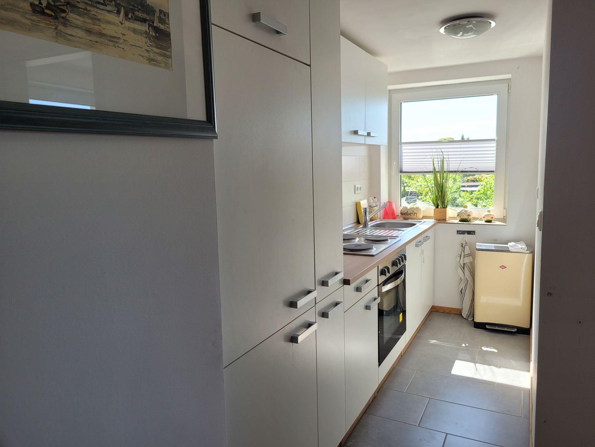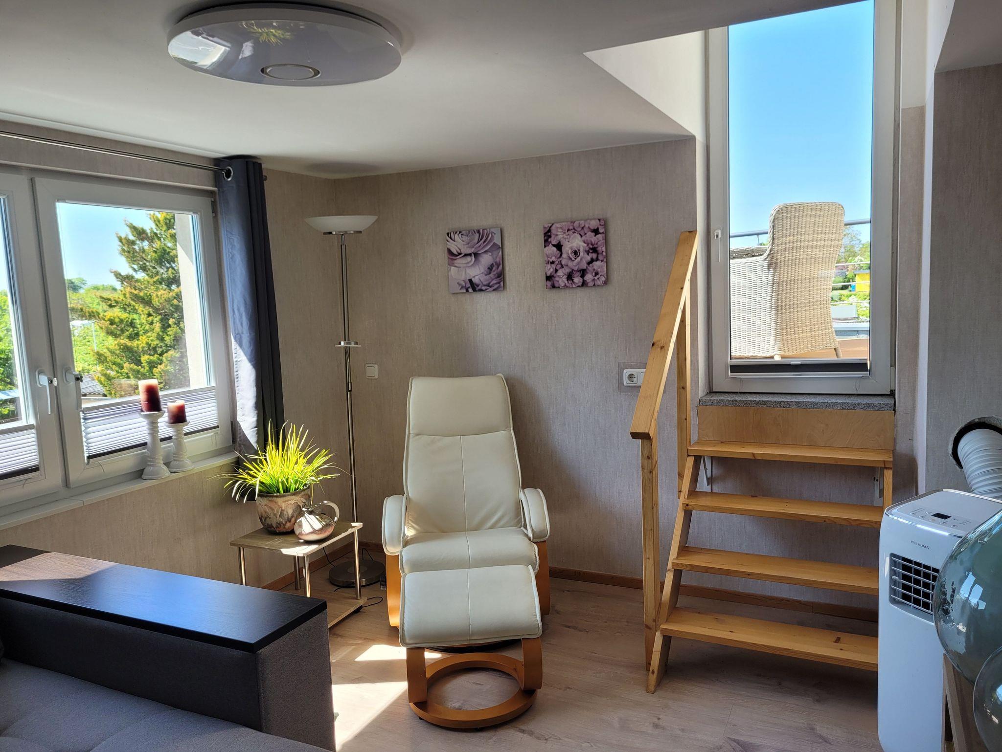 Die liebevoll eingerichtete Ferienwohnung (2020 renoviert) ist ca. 60 qm groß und dominiert durch den hellen, freundlichen Wohnbereich mit Essecke, Flachbild-TV und Zugang zur Dachterrasse. Das Schlafsofa (1,60 x 2,00m) lässt sich für eine weitere Person aufbetten. Das Schlafzimmer verfügt über einen Kleiderschrank, eine Komode sowie einen weiteren Flachbild-TV. Die offene Küche ist gut ausgestattet (Wasserkocher, Toaster, Herd, Mikrowelle, Kaffeemaschine), das Bad mit Tageslicht verfügt über eine ebenerdige Dusche und WC. Küche und Bad sind gefliest, Schlaf- und Wohnbereich mit Laminat eingerichtet. Bettwäsche und Handtücher sind in Erstausstattung im Preis inklusive. Es handelt sich um eine Nichtraucherwohnung. Vor dem Eingangsbereich bzw. auf der Dachterrasse darf geraucht werden. Haustiere sind nicht erlaubt.
