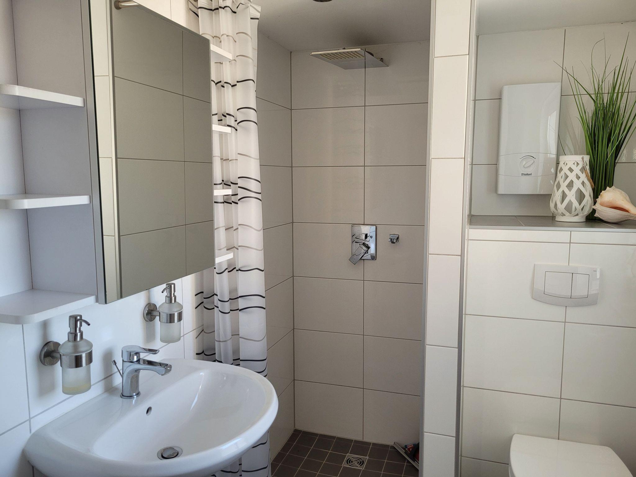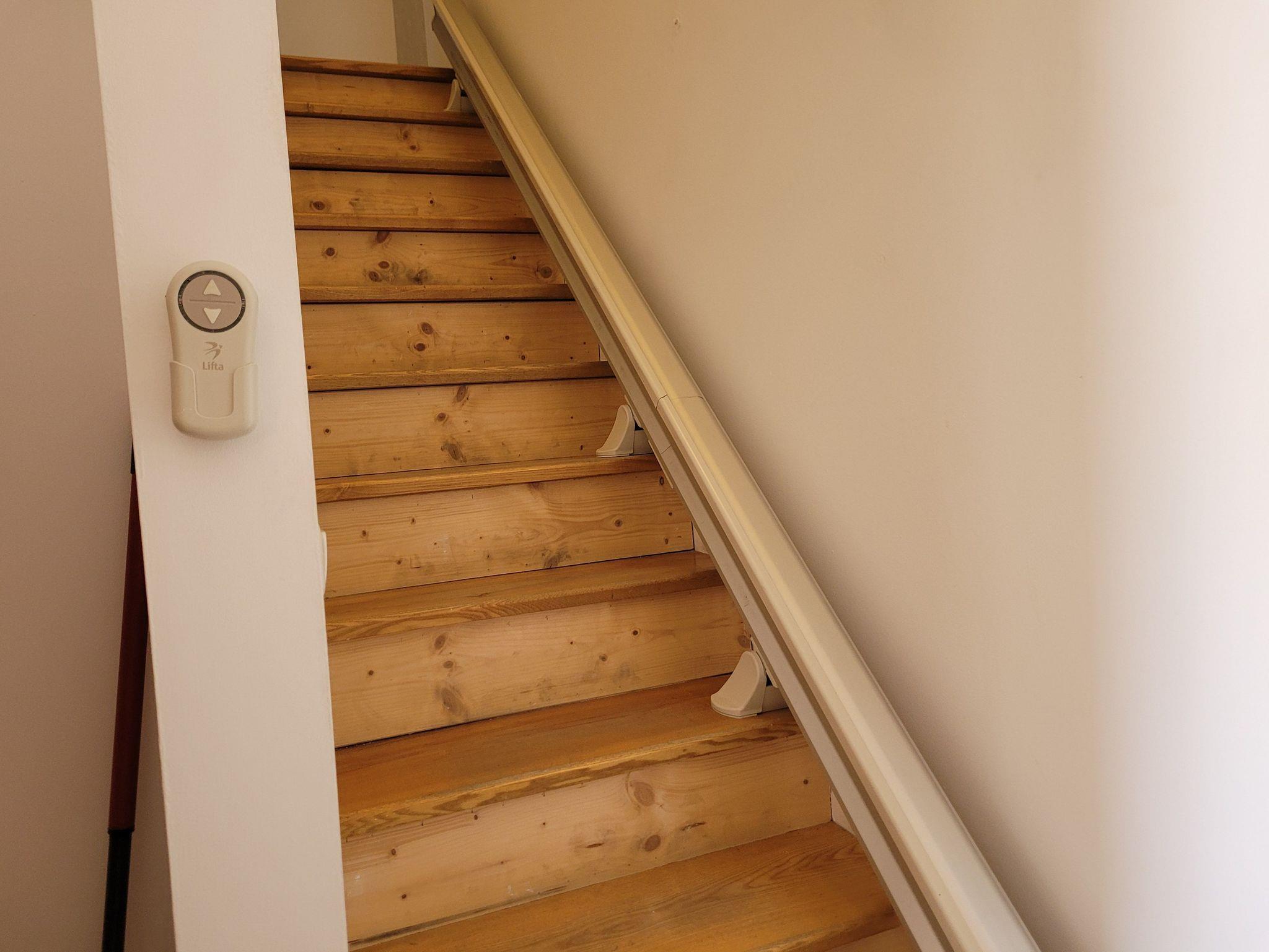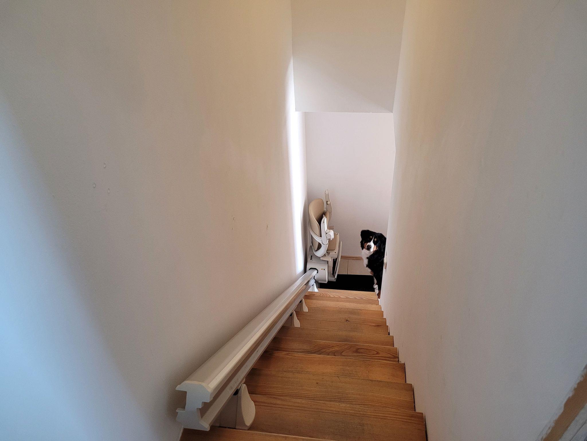 Der Eingang zur Treppe ist über 2 Stufen zu erreichen. Die Treppe ist mit einem Treppenlift ausgestattet und kann durch geheingeschränkte Personen genutzt werden. Die Dusche ist ebenerdig.