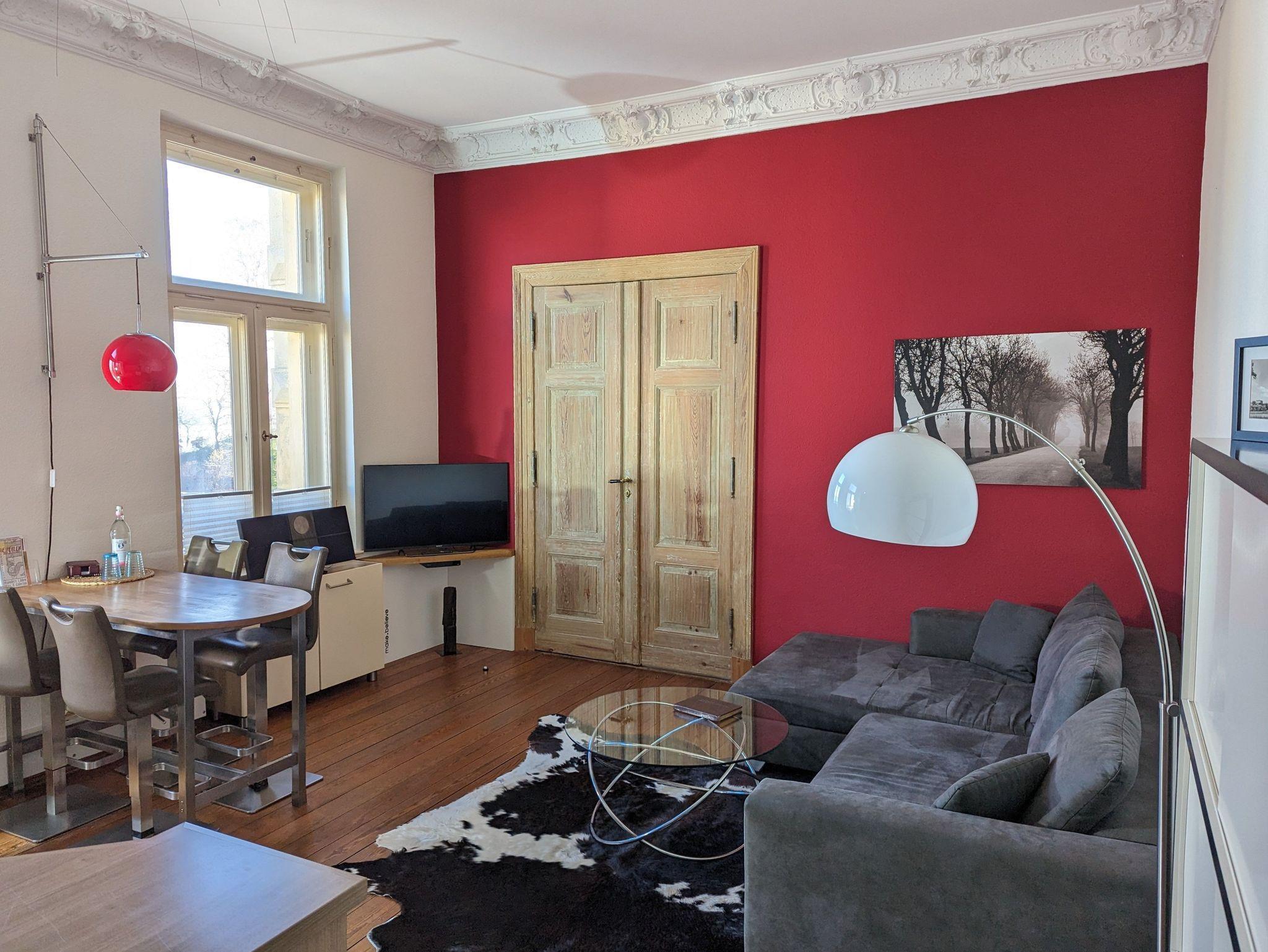 Unsere Ferienwohnung im 1. OG ist 80 qm groß und verfügt über ein Wohnzimmer mit Küchenzeile, zwei Schlafzimmer, Bad mit Badewanne und Flur. Alle Zimmer haben Dielenboden und originale Stuckdecken.