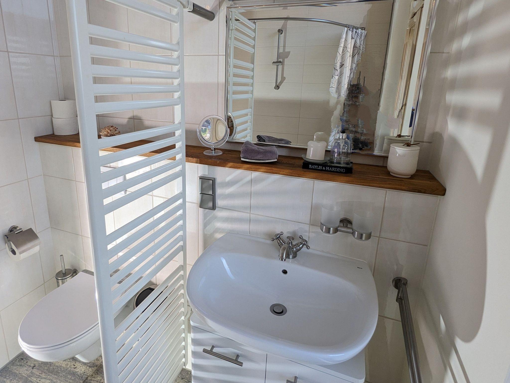 Das funktionale Bad umfasst eine Badewanne mit Duschmöglichkeit, Waschtisch und WC.