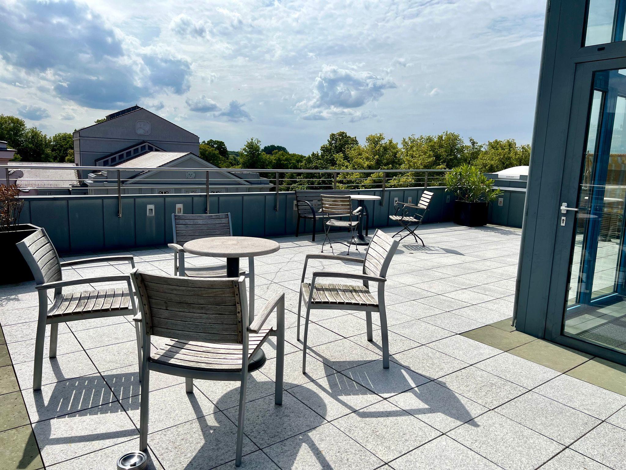 Allen Gästen unseres Hauses steht eine große Gemeinschaftsdachterrasse zur Verfügung. Hier haben Sie einen fantastischen Bilck auf das Stralsunder Theater, die Stadtmauer, die Altstadt und den Hafen.