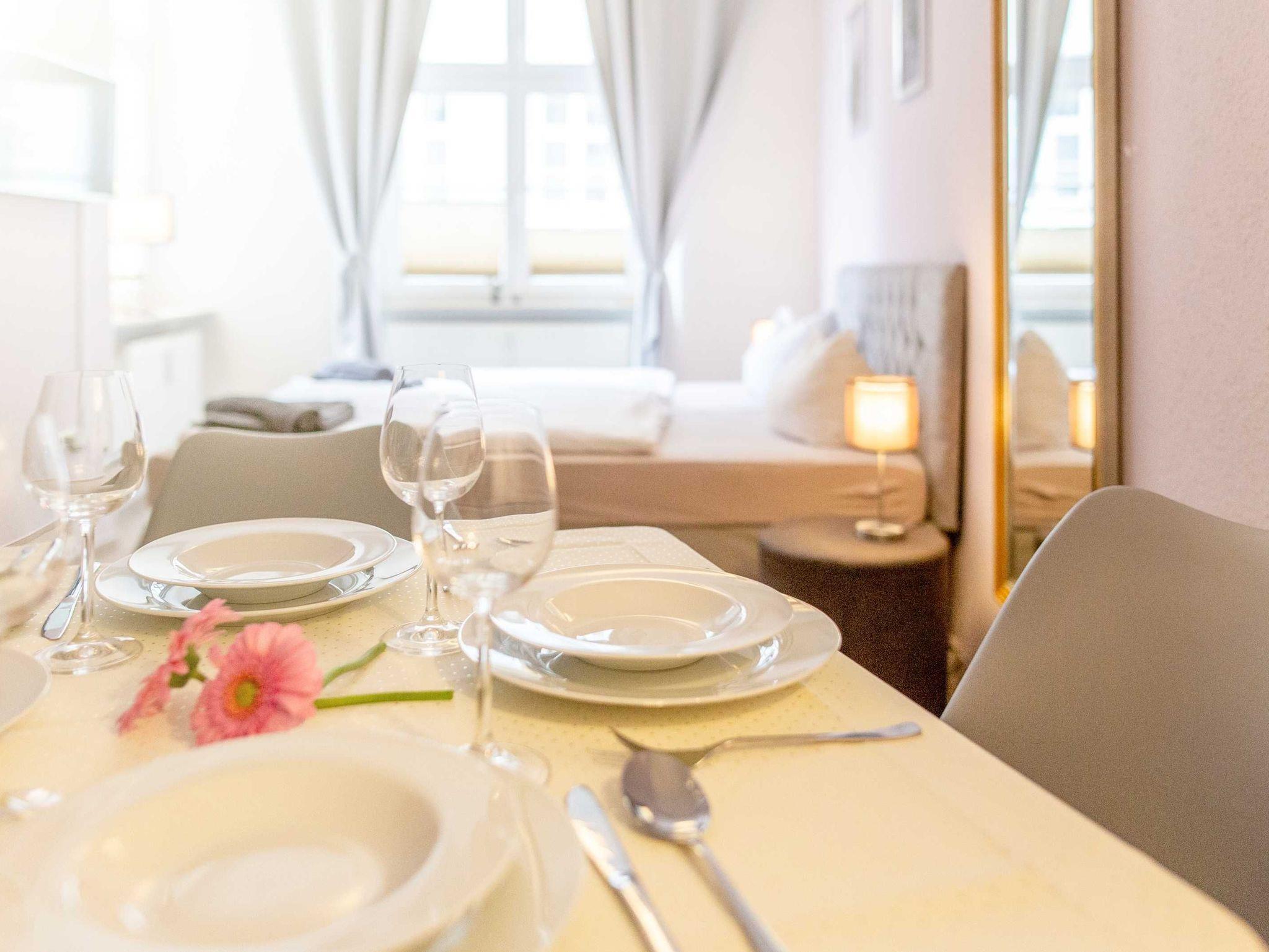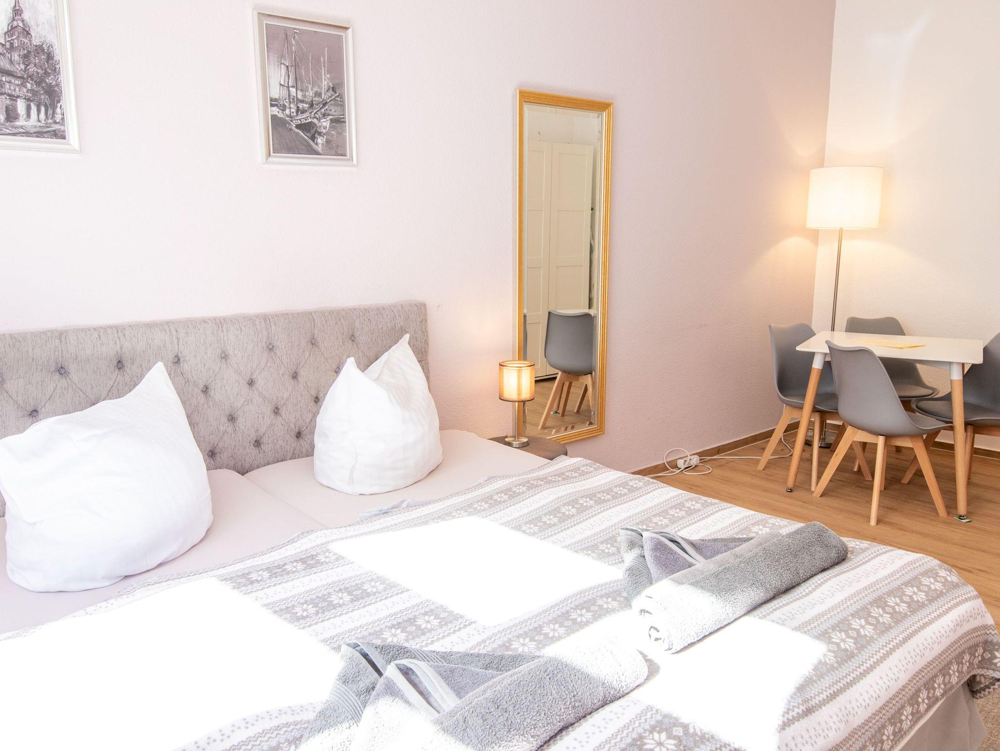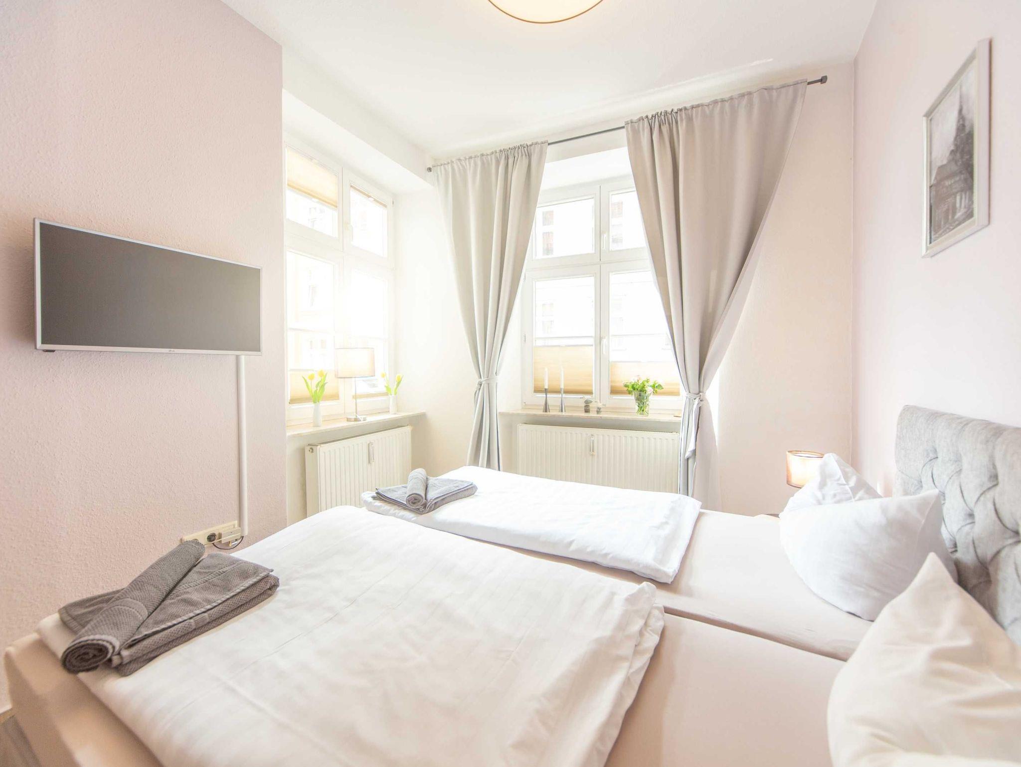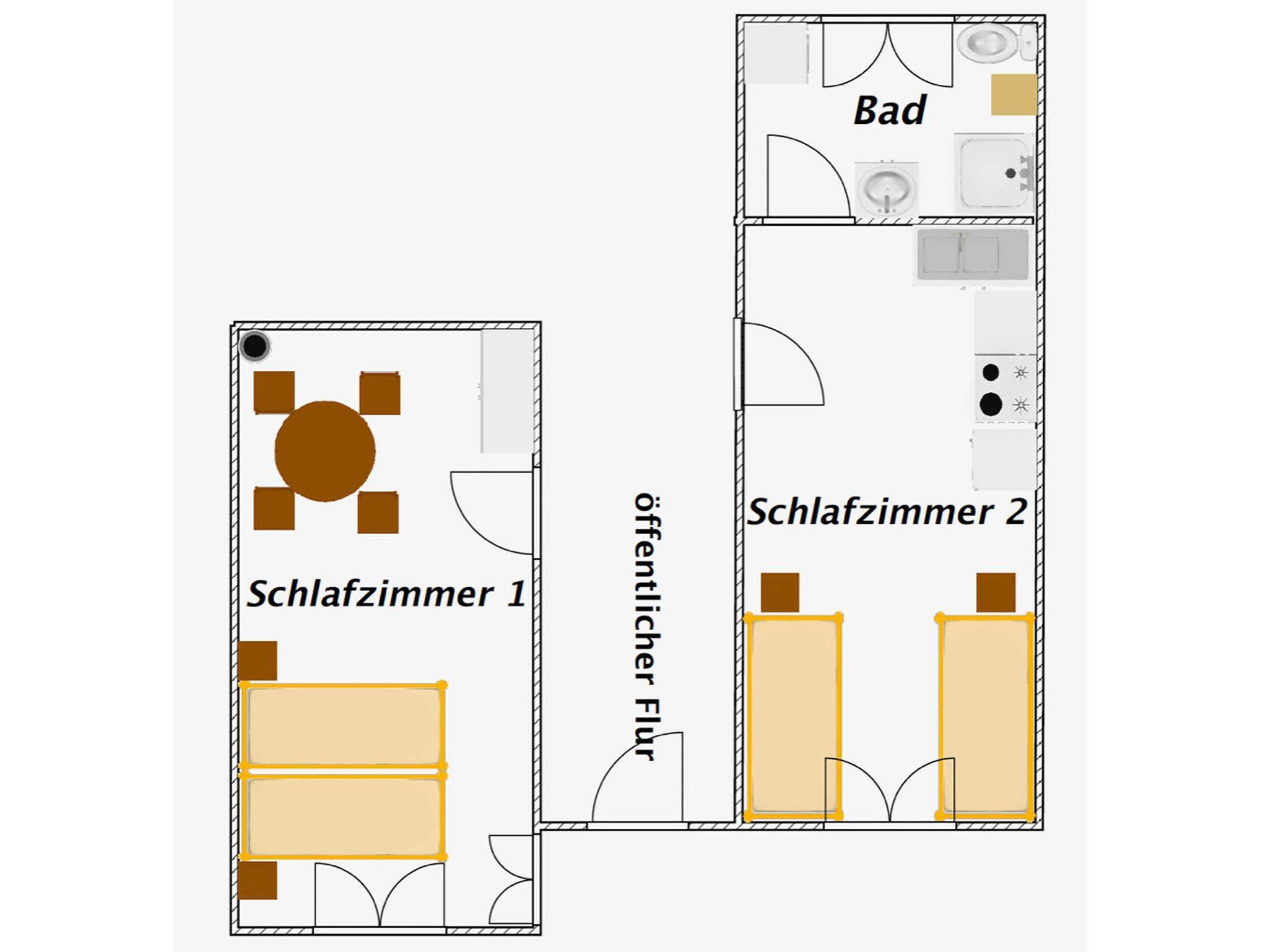 Die Ferienwohnung 1 verfügt auf 35m² Fläche über 2 Räume sowie ein seperates Badezimmer. Die Küche ist mit Spüle, Geschirrspüler, Backofen, Cerankochfeld, Kühlschrank mit Gefrierfach, Wasserkocher, Toaster, Kaffeemaschine, täglichen Küchenhelfern, Besteck, Geschirr etc. ausgestattet. In der Küche befindet sich auch ein Schlafbereich mit zwei zusammenstellbaren Einzelbetten. Der zweite Raum, das Schlafzimmer ist über den öffentlichen, aber sehr ruhigen Hausflur zu erreichen und nur ca. 2 m entfernt. Hier befinden sich ein Doppelbett (180x200cm), Smart-TV und eine gemütliche Sitzecke. Das Badezimmer verfügt über Dusche, WC und Waschbecken.