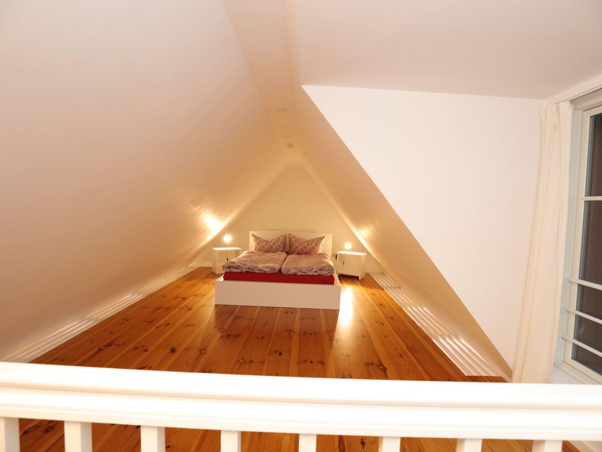 Die Ferienwohnung befindet sich im 1. OG des historischen Speichergebäudes. Sie finden dort eine offene Küche mit Esszimmer und Blick in den grünen Innenhof. Die Küche ist mit Elektroherd/ Ceranfeld, Backofen, Spülmaschine, Kühlschrank mit Eisfach, Kaffeemaschine, Wasserkocher und weiteren diversen Küchengeräten bestückt. Im geräumige Wohnzimmer stehen 2 gemütliche Ledersofas mit Kissen und Decken, sowie ein Couchtisch. Zusätzlich finden Sie hier ein Bücherregal mit einer Auswahl interessanter Urlaubslektüre und eine Spät-Biedermeier-Kommode. Außerdem ist im Wohnzimmer der Flachbildfernseher mit Satelliten-Empfang und ein DVDPlayer mit DVD Sammlung vorhanden. Hier finden sie noch ein zusätzliches Einzelbett.