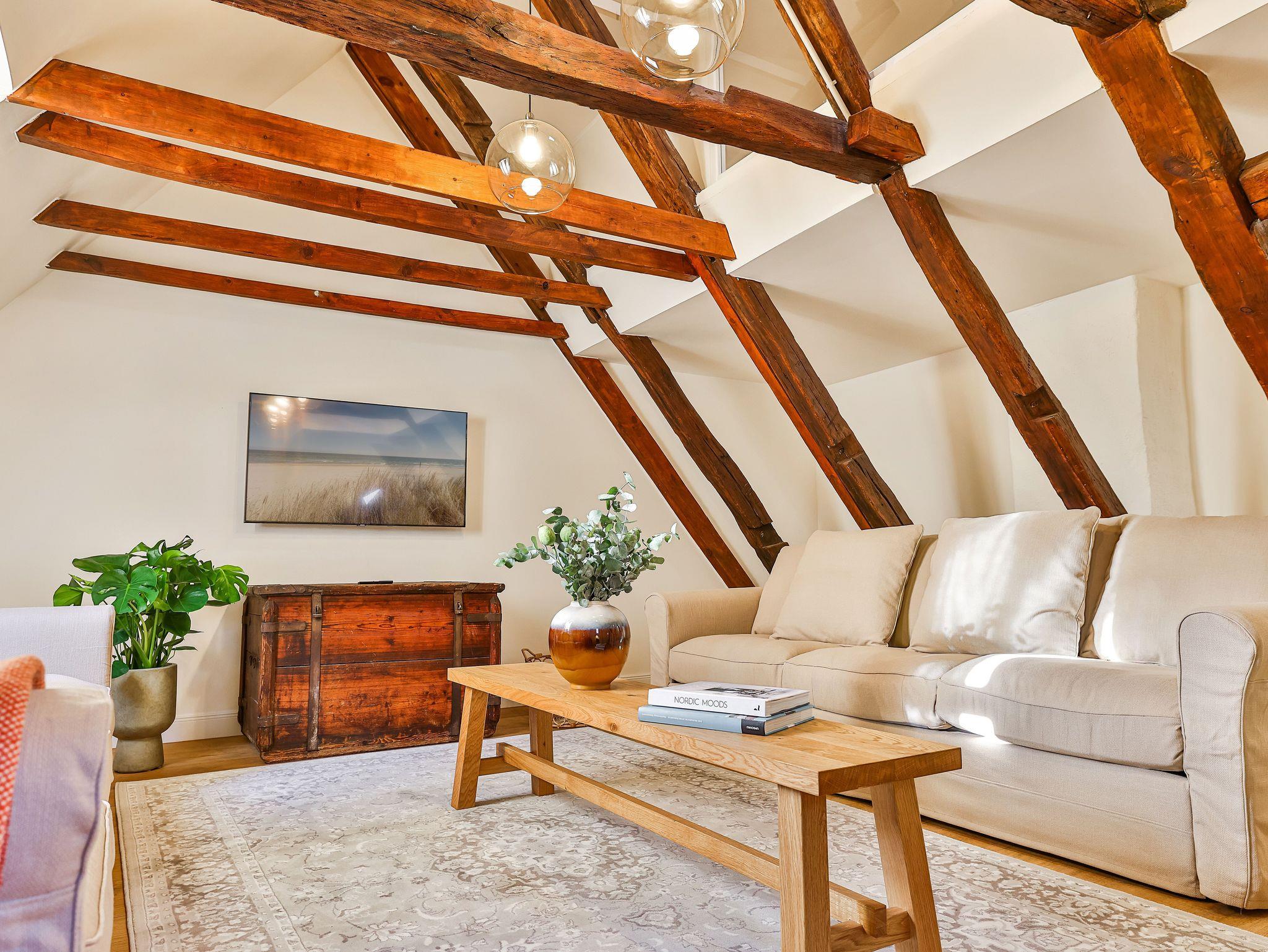 Im 2. OG gibt es das große Wohnzimmer mit 1 Schlafsofas und eine Galerie mit einem weiteren Doppelbett und das kleine Bad.