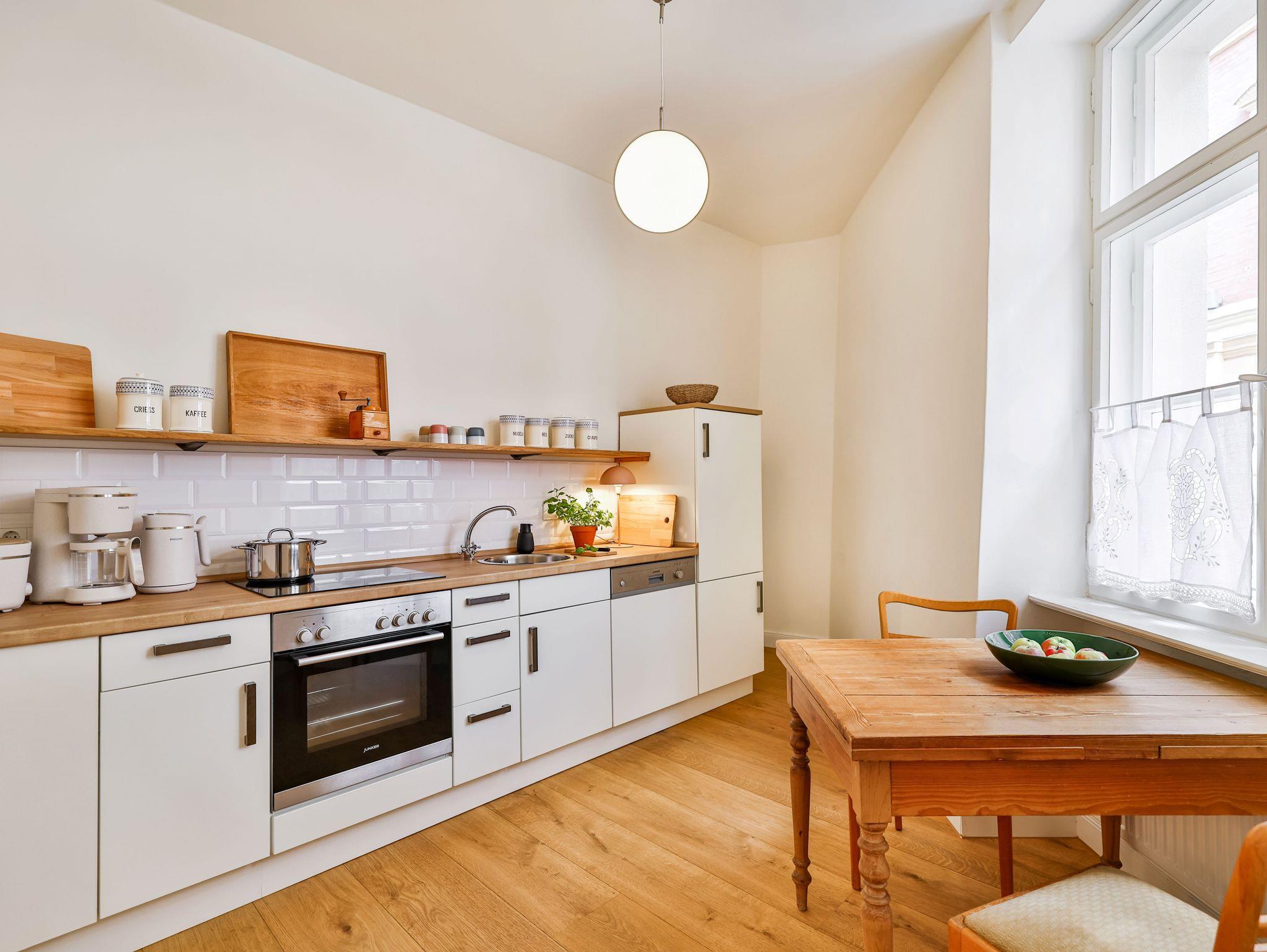 Im EG gibt es eine separate Küche, ein separates Esszimmer und das große Bad mit Dusche und Badewanne.