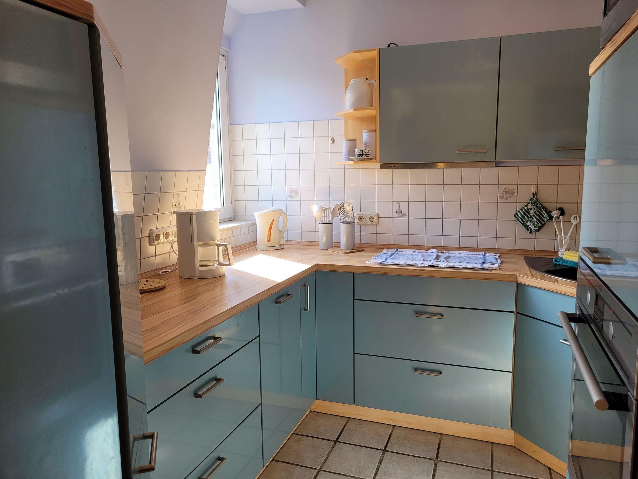 Die Ferienwohnung verfügt über 2 Etagen (1. Etage + Dachgeschoss) und befindet sich in der 1.Etage eines Zweifamilienhauses. Sie umfasst neben einer offenen Küche und dem Bad, einen Essraum, einen kombinierten Wohn- Schlafraum sowie ein separates Schlafzimmer. Bei Bedarf kann ein zweites Schlafzimmer im Dachgeschoß genutzt werden. Die Vermieter wohnen im Erdgeschoss. Bitte beachten Sie die Treppen, siehe Fotos.