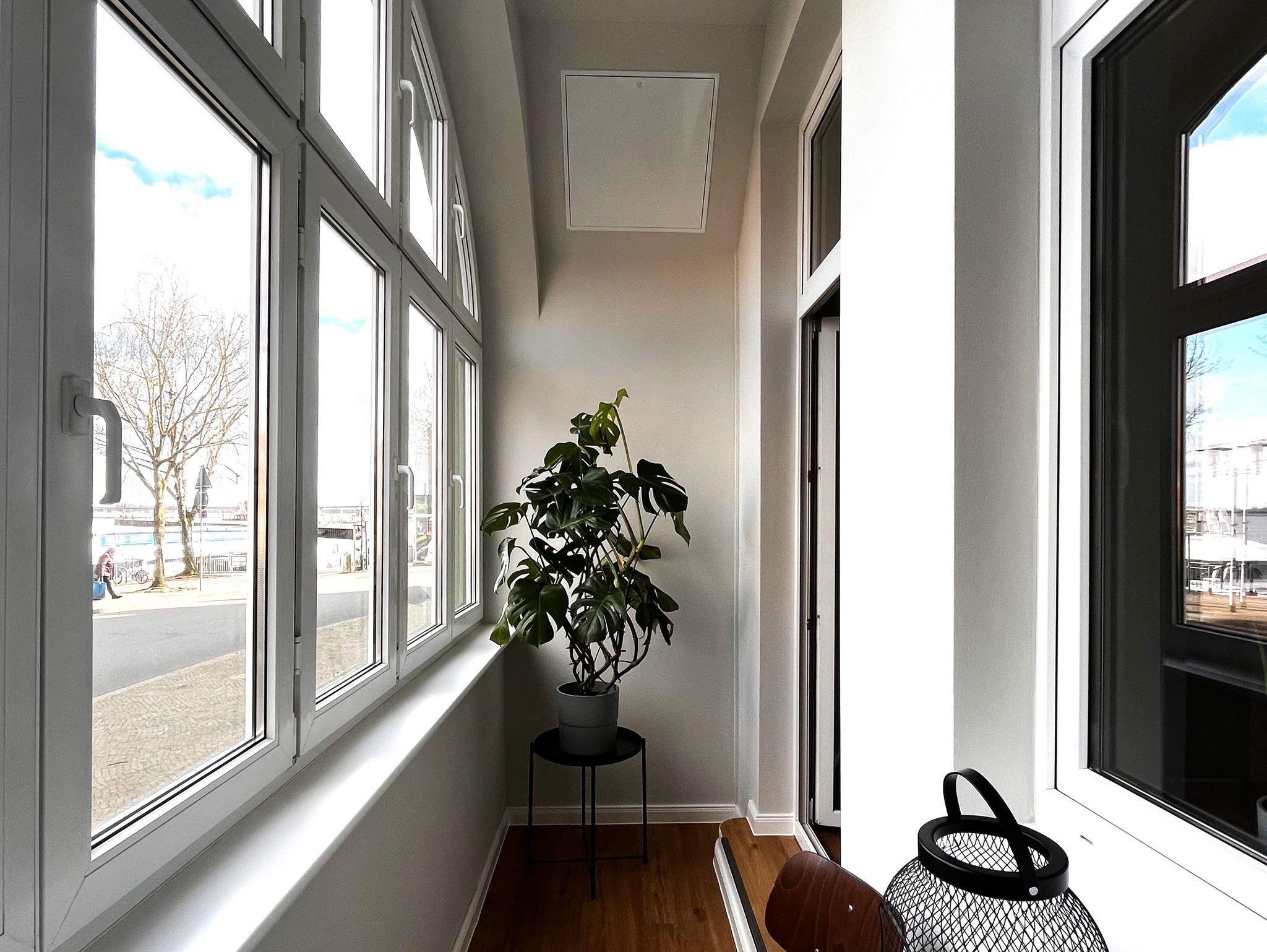 Das Apartment teilt sich mit den anderen Apartments eine Gemeinschaftsküche, welche sich auf dem Flur und abgeschlossen von Bereichen außerhalb der Apartments befindet.