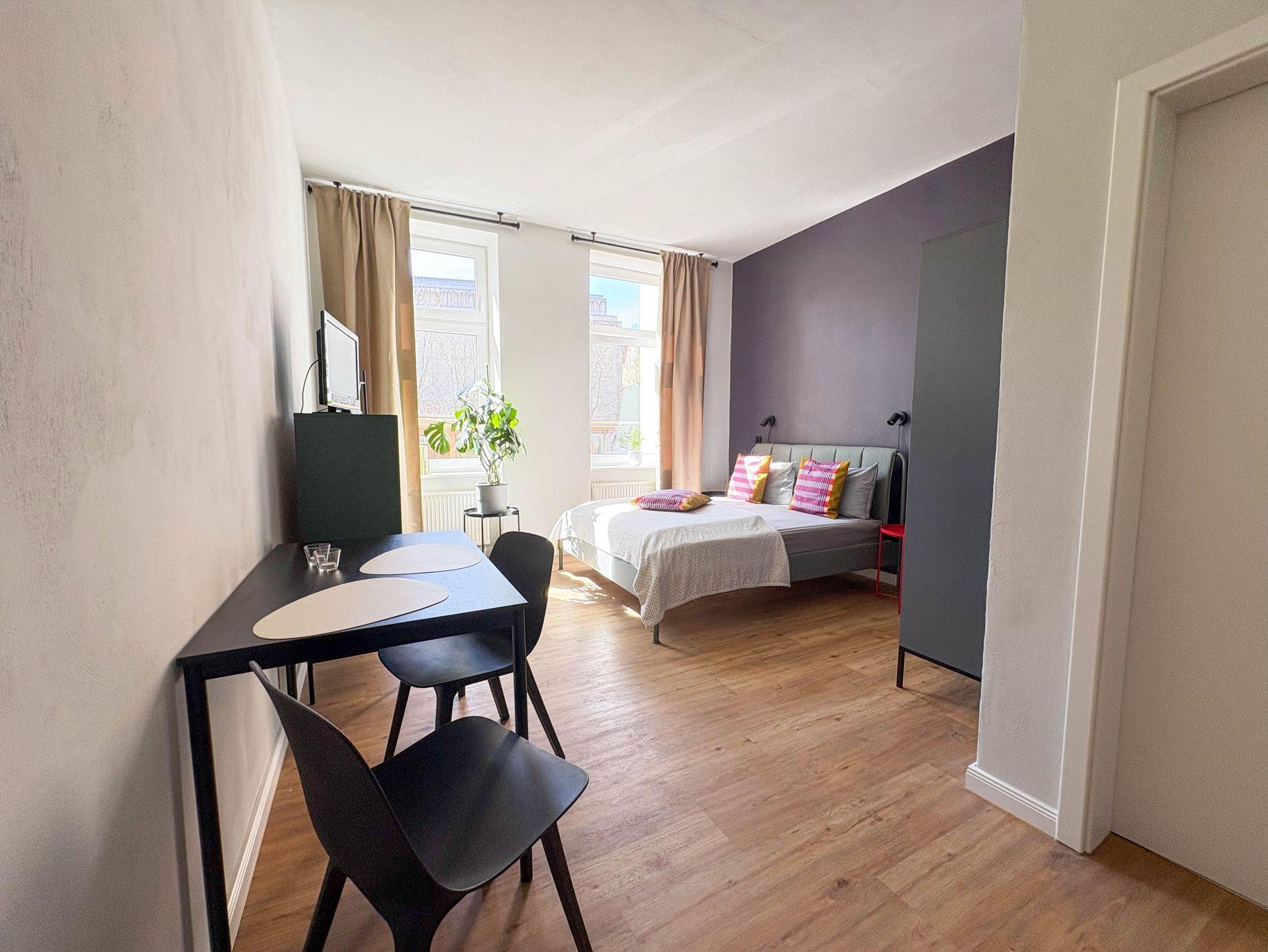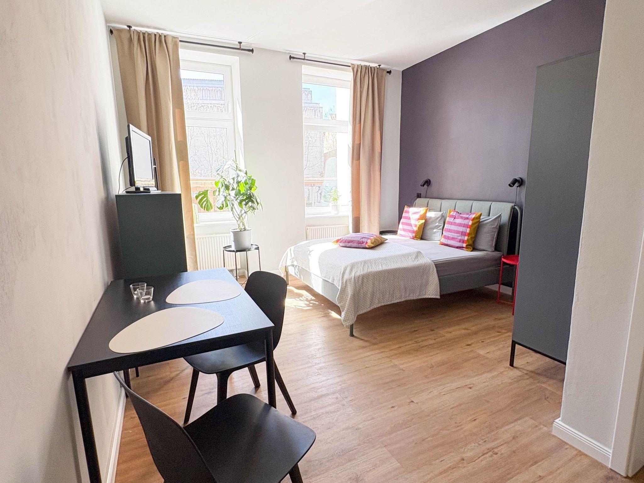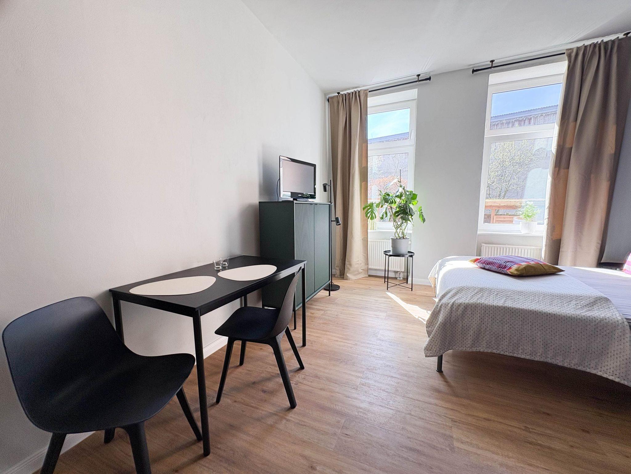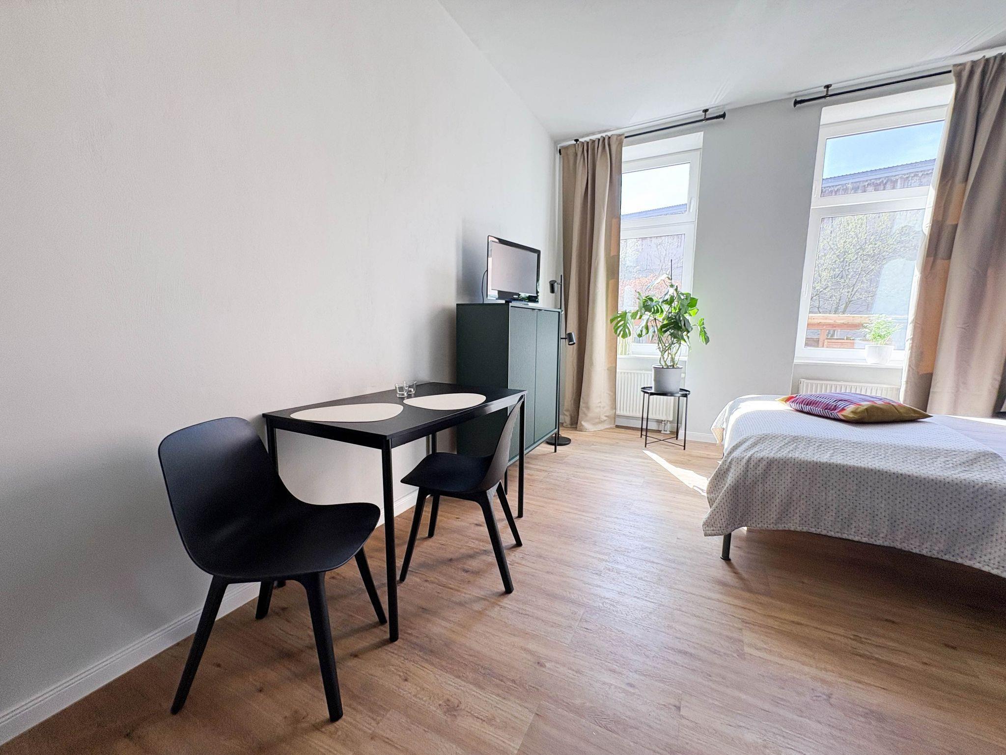 Unser Apartment mit 30 m² ist ideal für Paare. Hier kannst du entspannen in der Loggia mit einem tollen Blick auf den Stralsunder Hafen. Du schaust durch das große Fenster auf Segelboote, Fähren und Möwen. Es sind nur ein paar Schritte zu Restaurants, Kneipen und Bars. Der Stadtstrand ist 15 Minuten zu Fuss entfernt. Die zentrale Lage biete viele Möglichkeiten für Entdeckungen der Stadt Stralsund und der Insel Rügen. Unsere Unterkunft eignet sich perfekt für Paare, aber auch für dich alleine. Im Zimmer befindet sich ein Doppelbett, ein Schrank und Kommode, Schreibtisch mit Stuhl und eine Garderobe. Das Zimmer verfügt über ein Bad mit Dusche. Die Pantry- Küche verfügt über einen Mini-Kühlschrank, Mikrowelle, Wasserkocher und Kaffeemaschine. Die Apartments haben natürlich WLAN.