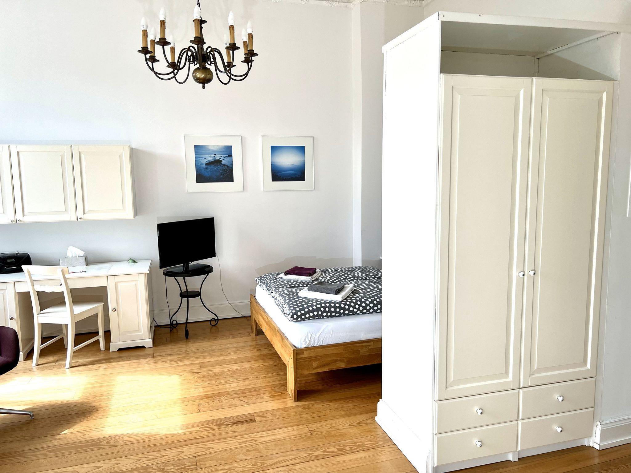 Die Wohnung ist insgesamt 37,4 qm groß und bietet ein Wohn-/Schlafzimmer mit einem Doppelbett (160 x 200 cm), Sitzecke und Arbeitsplatz, eine Küche mit Eßplatz und Dusche/WC. WLan kostenfrei.
