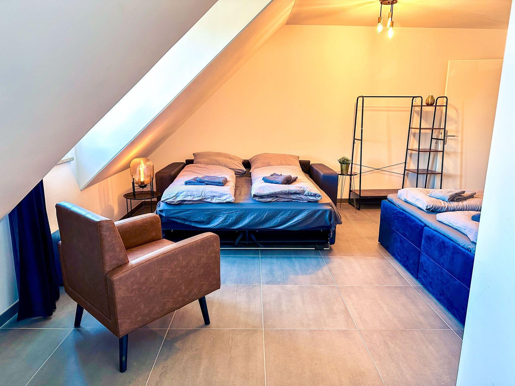 Das Altstadt-Studio 8 erstreckt sich über zwei Etagen, die durch einen privaten Hausflur verbunden sind und bietet mit 100 m² viel Platz für bis zu 4 Personen. Zwei Schlafzimmer mit bequemen Doppelbetten und zwei moderne Bäder mit Dusche sorgen für zusätzlichen Komfort. Der Wohnbereich mit offener Küche lädt zu gemeinsamen Mahlzeiten oder entspannten Abenden ein. Beide Studios bieten dir eine voll ausgestattete Küche, in der du bequem kochen kannst, sowie gemütliche Wohnbereiche mit Smart-TV und kostenfreiem WLAN. Direkt vor der Tür findest du eine öffentliche Ladestation für E-Autos ideal für umweltbewusste Reisende.