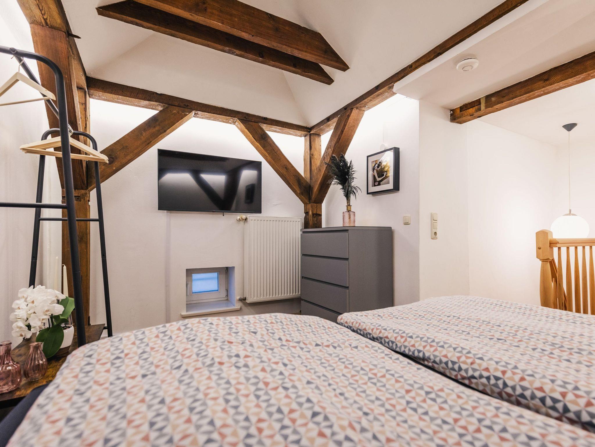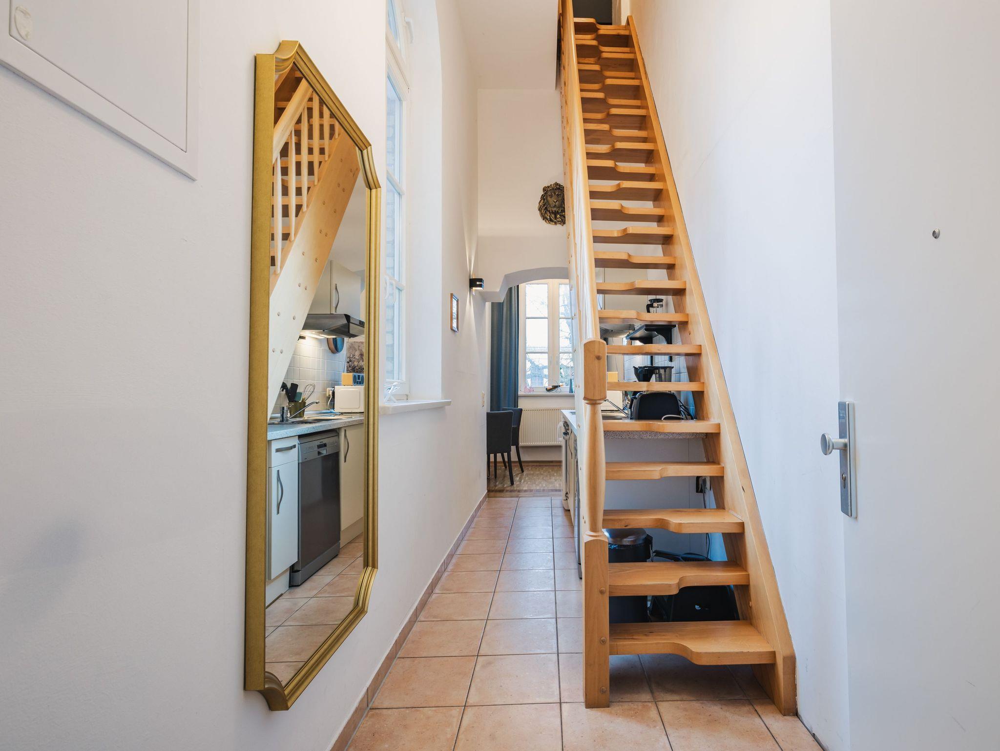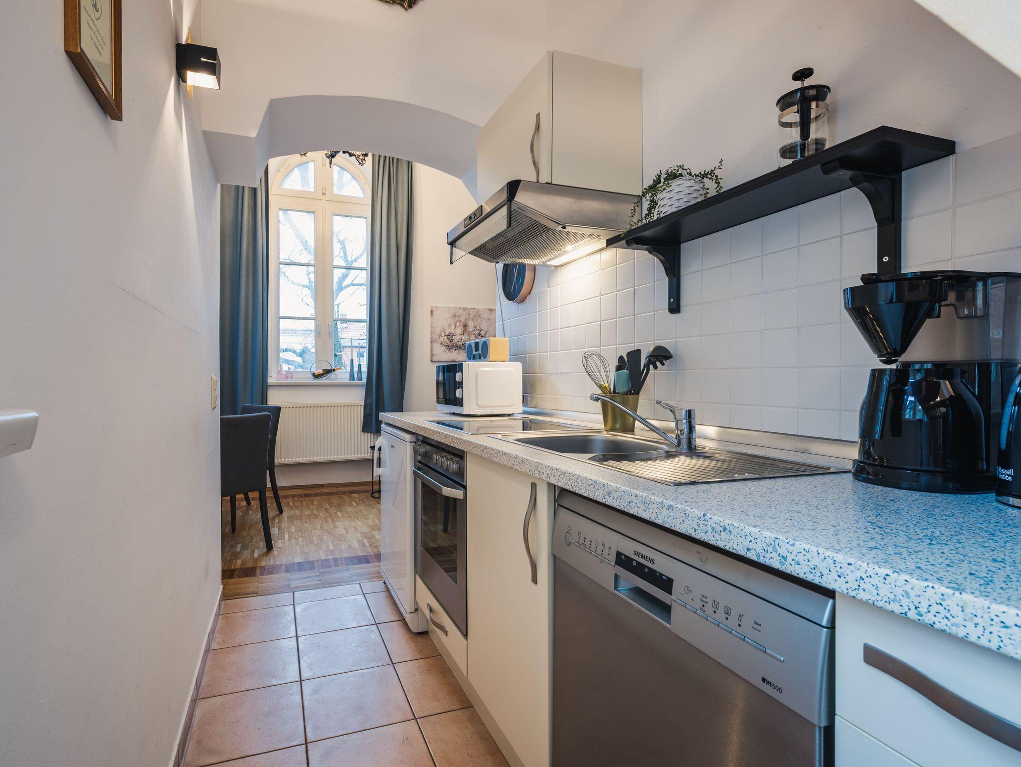 Das Altstadt-Studio 2 befindet sich im 2. und 3. OG am Neuen Markt in der Stralsunder Altstadt. Über den Fahrstuhl erreichen sie das moderne Maisonette-Studio mit altbaustypischen hohen Decken und rustikalen Balken. In der unteren Etage stehen ihnen ein Wohnzimmer mit Schlafsofa, TV, Essbereich und offener Küche zur Verfügung. Neben Backofen, Herd, Kühlschrank, Spülmaschine und Mikrowelle finden sie auch Kochutensilien für den täglichen Bedarf. Über eine steile lange Raumspartreppe gelangen sie in das Schlafzimmer mit Doppelbett (160x200) und das Bad mit Dusche und WC.