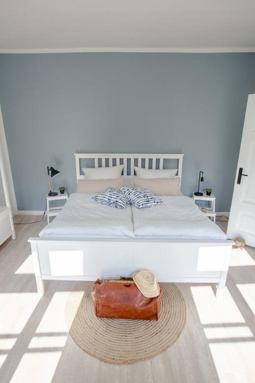 Gleich im angrenzenden Zimmer befindet sich eins der zwei Schlafzimmer. Im lichtdurchfluteten Raum lässt es sich im gemütlichen 1,80m*2,00m Doppelbett mit komfortablen in Mecklenburg-Vorpommern hergestellten Matratzen entspannen. Hier können sie entweder im gemütlichen Sessel noch ein wenig lesen oder auf dem Balkon die Sonne genießen.