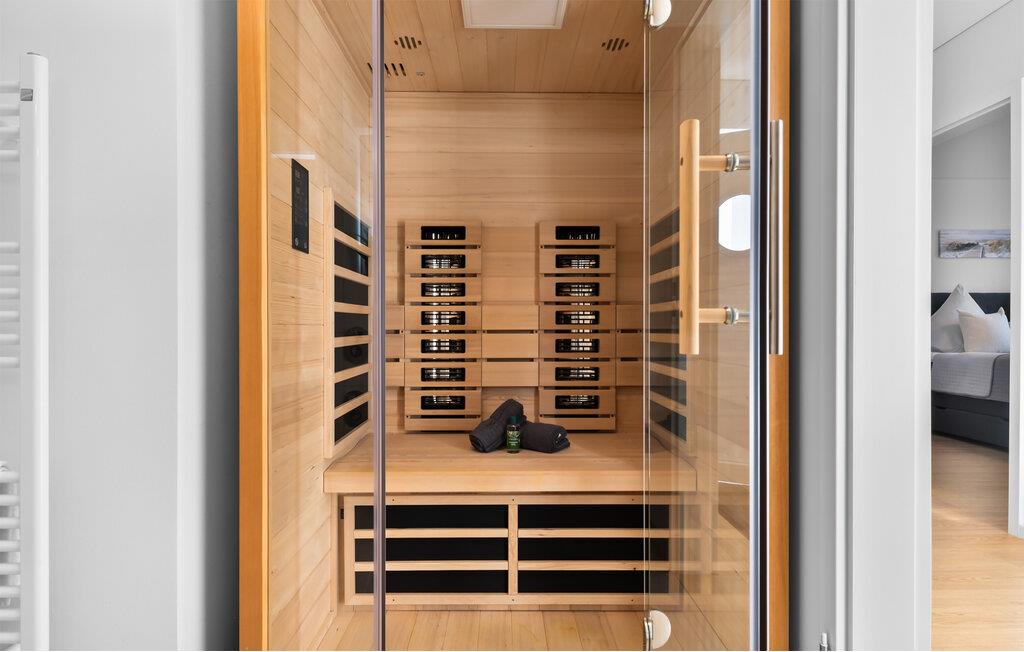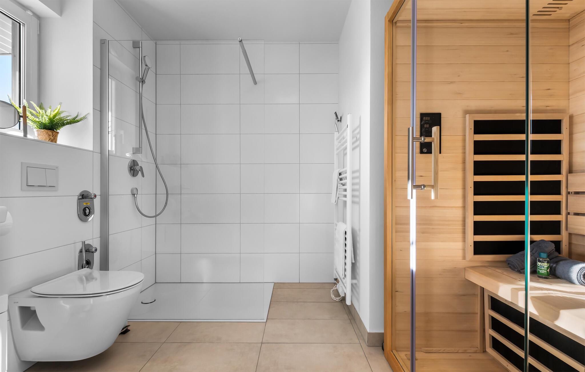 Badeværelset er et sandt wellness-tempel med en indbydende infrarød sauna (varmekabine) og en bruser på gulvniveau, perfekt til at slappe af efter en lang dag på stranden.