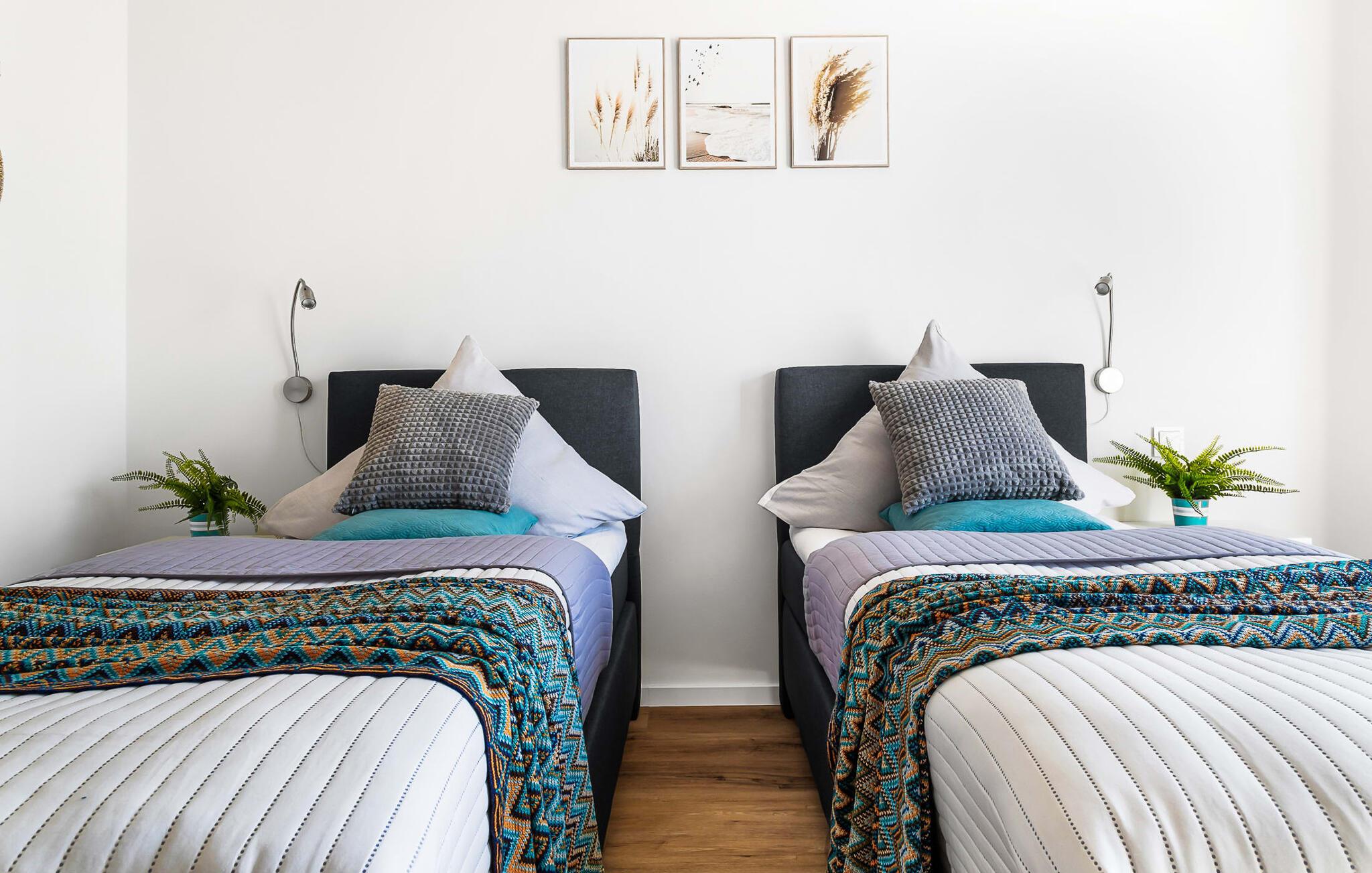 Det store soveværelse er udstyret med en stor boksmadrasser og et fjernsyn. Her er garanteret afslappende timer! Det andet soveværelse tilbyder jer ekstra soveplads med to enkeltsenge med springmadrasser.