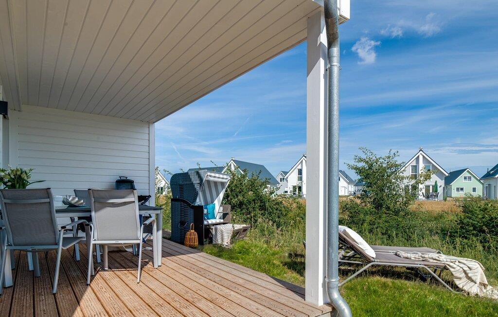 En overdækket terrasse med en strandstol og liggestole inviterer jer til at tilbringe dagen udendørs og nyde Østersøsolen. Det omkringliggende grønne område omkring huset bliver en legeplads for vores små gæster.
