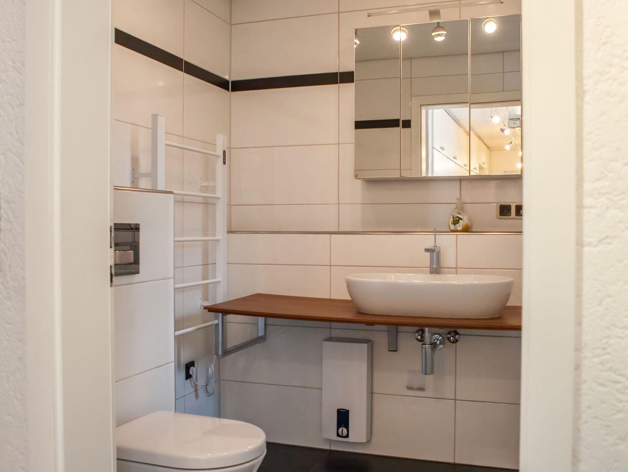 Das Badezimmer ist mit einem großen Waschbecken und einer Dusche ausgestattet. Bettwäsche, Handtücher und Geschirrtücher werden gestellt.