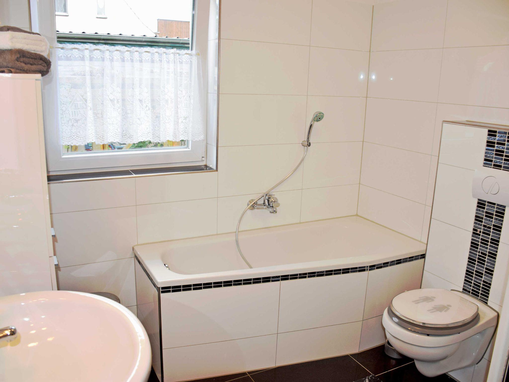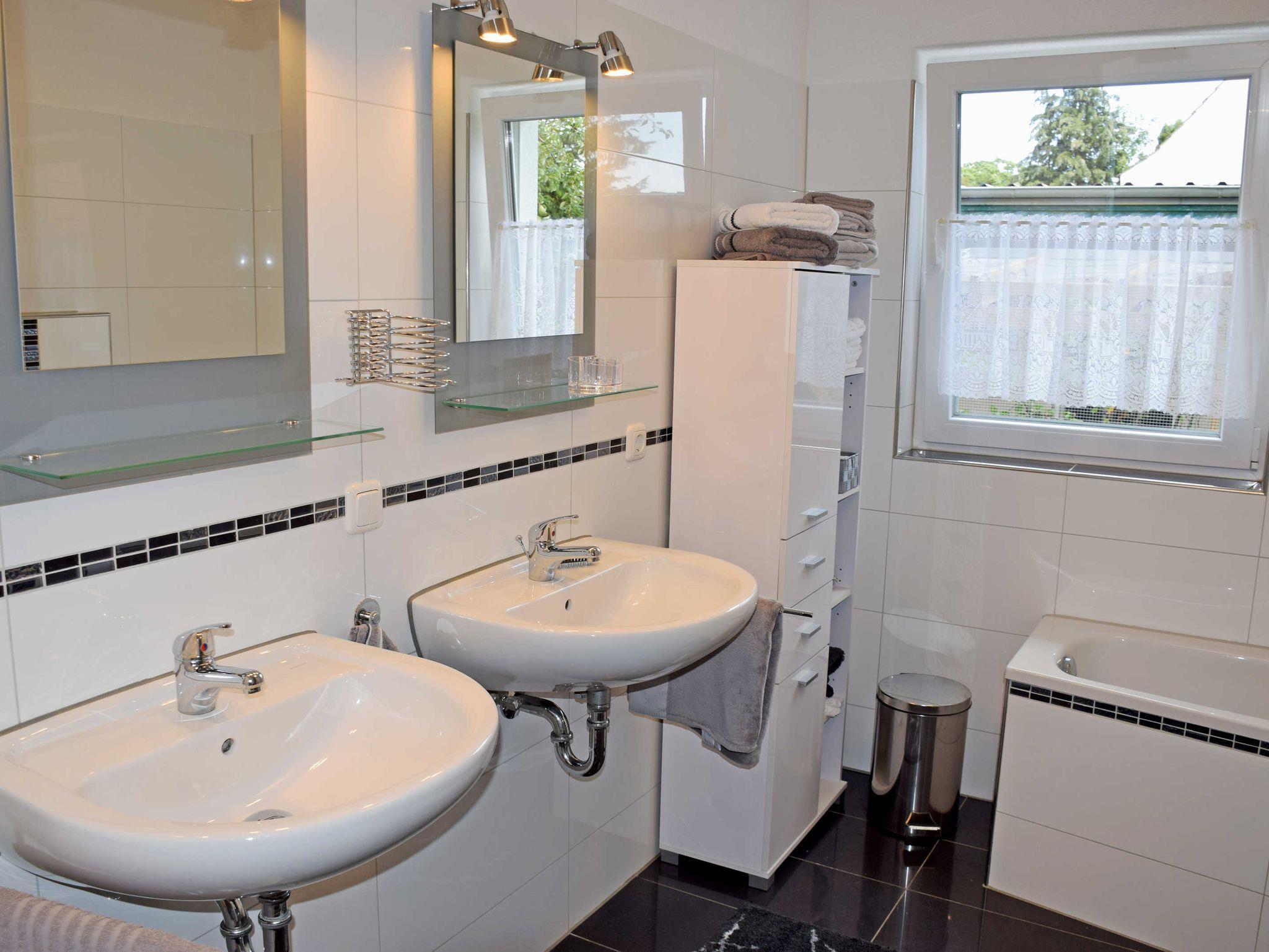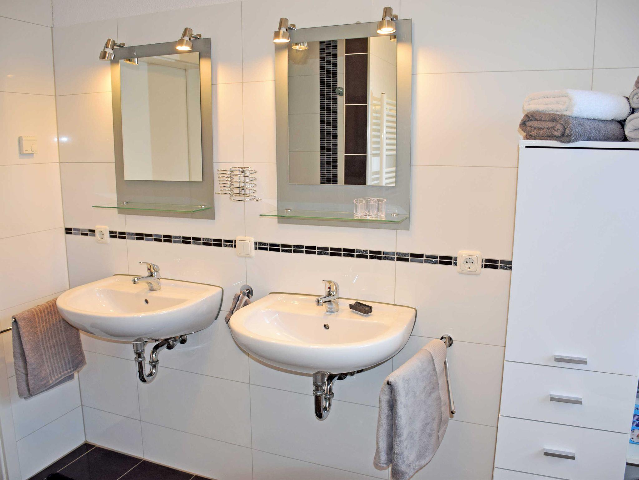 Das moderne große Bad ist mit Dusche, Badewanne WC, Fön und zwei Waschtischen ausgestattet.