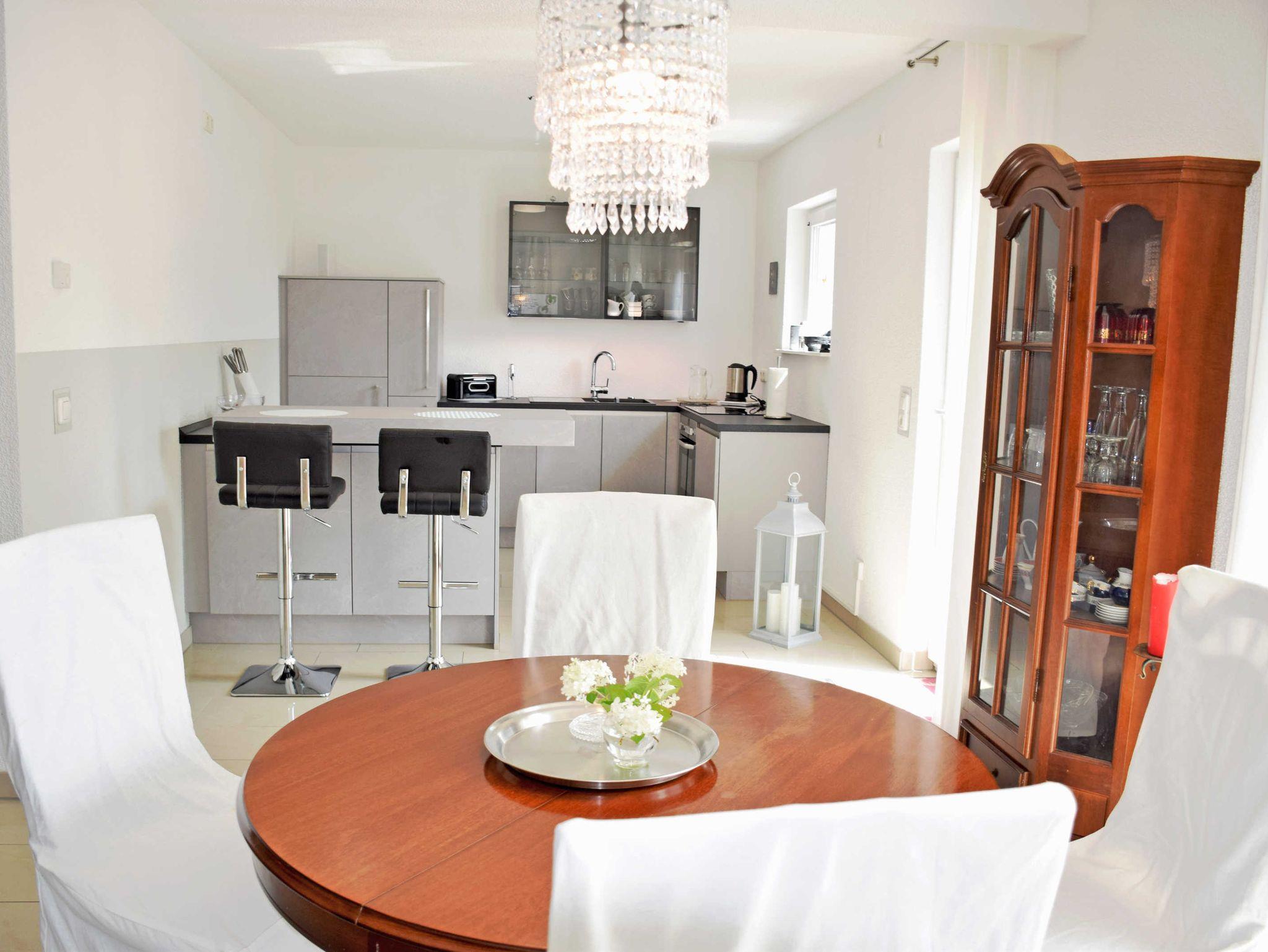Die Küche ist ausgestattet mit einem Backofen, Ceran-Kochfeld, Kühlschrank mit einem kleinen Gefrierfach, Mikrowelle, Heißluftfriteuse, Spülmaschine, Kaffeemaschine, Wasserkocher, Toaster, Mixer etc., Arbeitsplatte Tresen mit Sitzhocker (Wohn- und Essbereich Fußbodenfliesen).