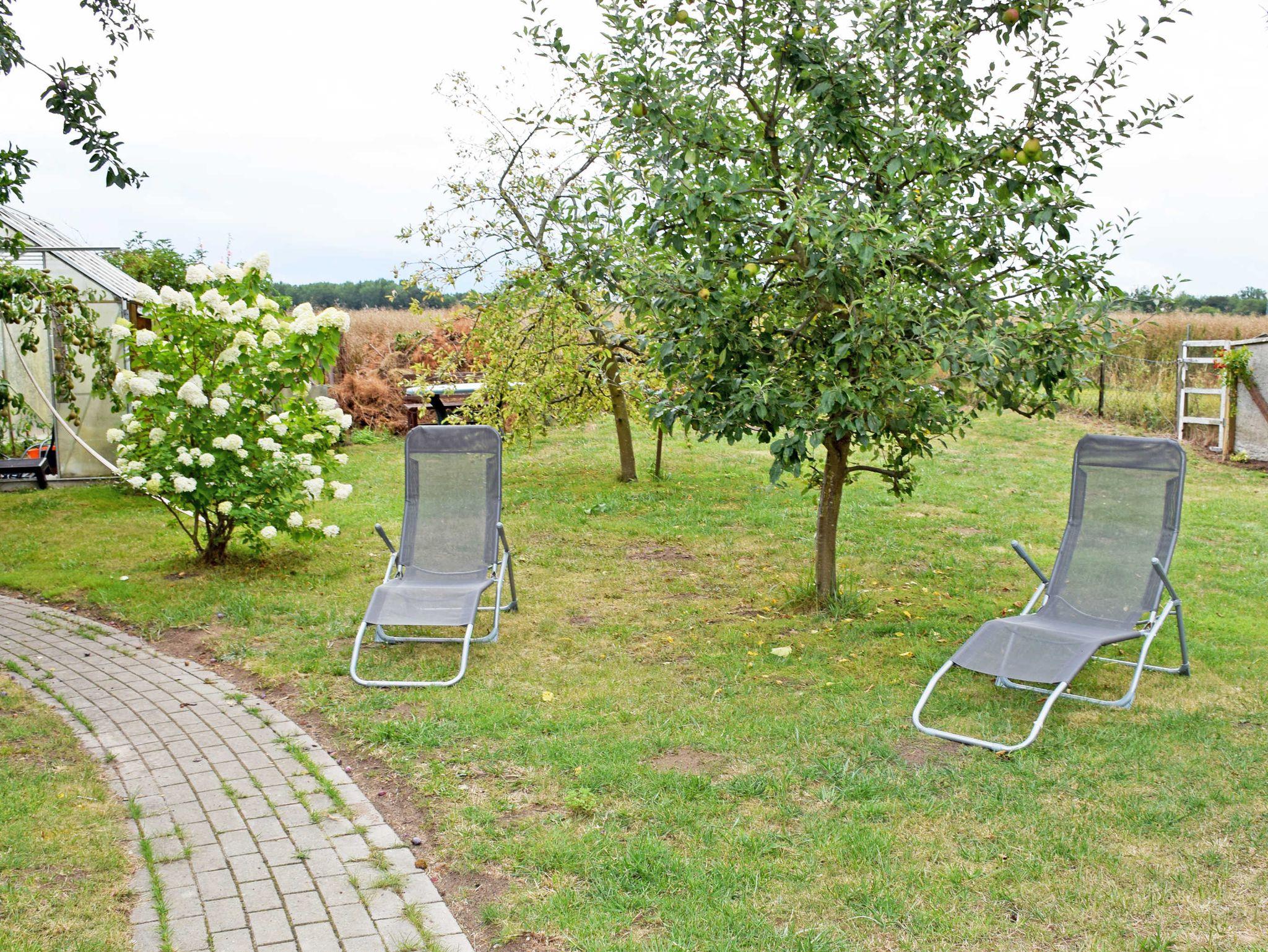 Eine Gartenterrasse mit Gartenmöbeln, Strandkorb und Grillkamin laden bei schönem Wetter zum Entspannen und Verweilen ein. Das große Grundstück mit Garten, Liegewiese vor und hinter dem Haus, mit kleinen und großen Sitzecken und Sommerliegen lassen den Urlaub sowohl zum Frühstück als auch abends vielleicht mit einem Glas Wein in Ruhe genießen. Saisonal laden frisches Obst und Gemüse von Baum und Strauch, wie zum Beispiel Tomaten oder Äpfel zum Naschen ein.
