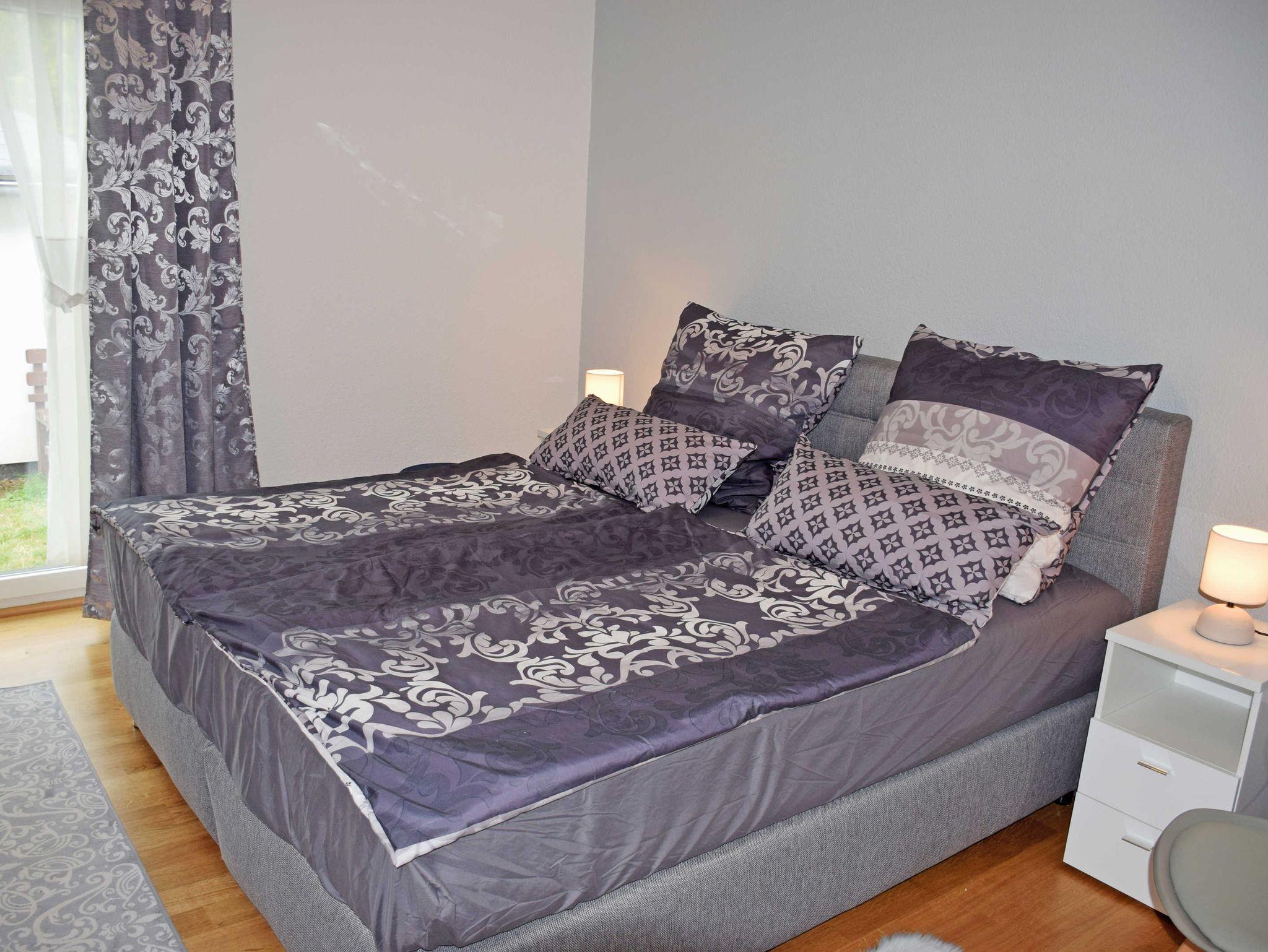 Es gibt ein großes Schlafzimmer mit einem Boxspringbett (180 x 2 00 cm, inkl. Bettwäsche)m und Parkettboden.
