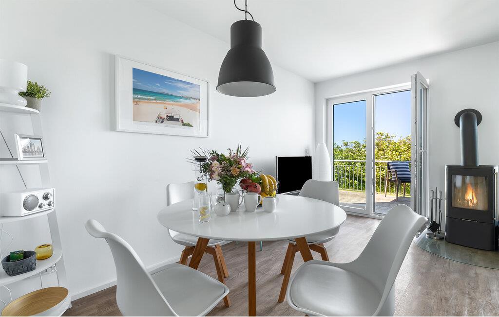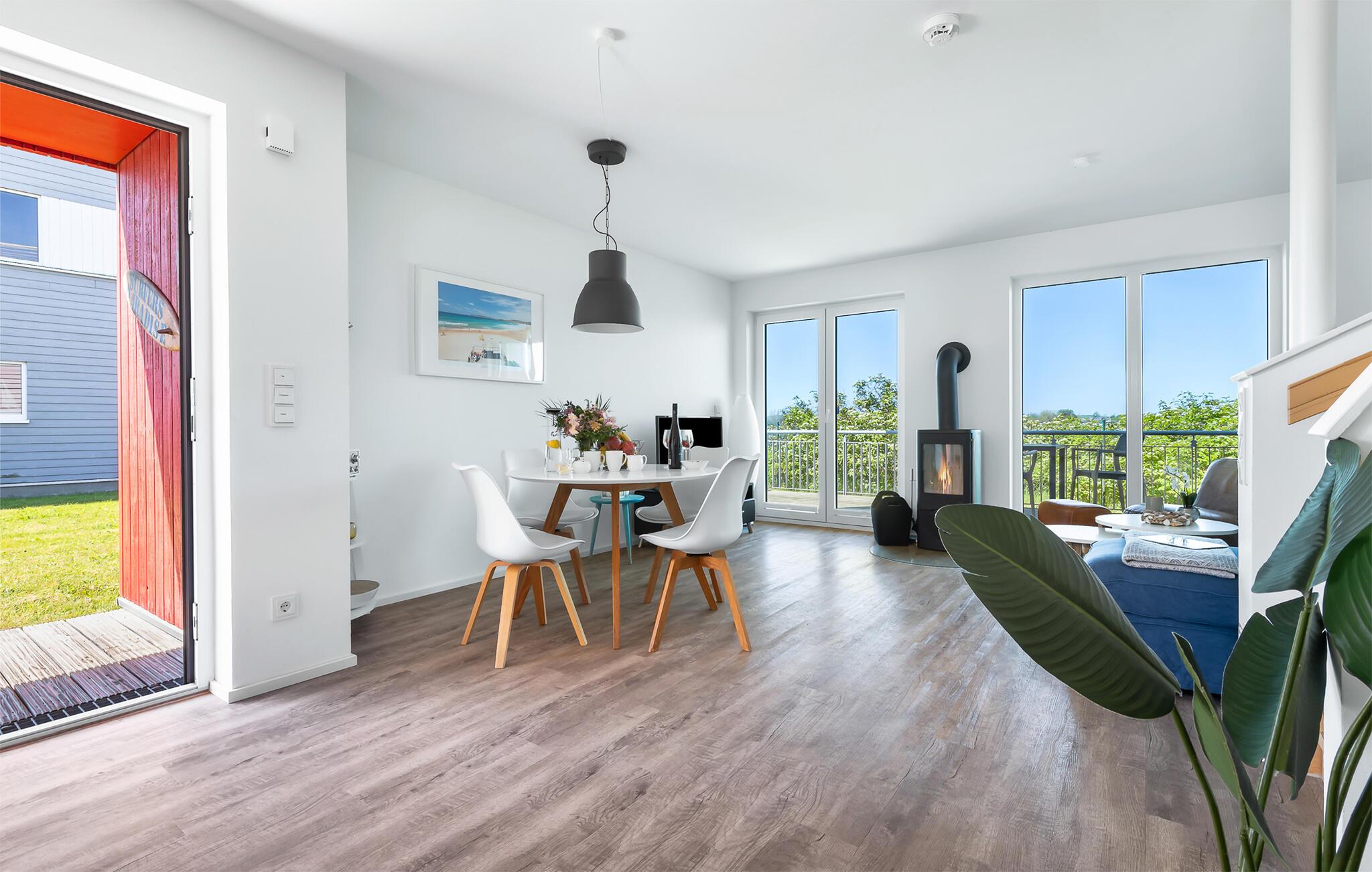Det lyse opholds- og spiseområde ligger i stueetagen og imponerer med gulv til loft-vinduer og panoramaudsigt over Sleien. Herfra er der direkte adgang til den tilstødende terrasse. Denne terrasse scorer med sin sydvestlige orientering og fantastiske solnedgange