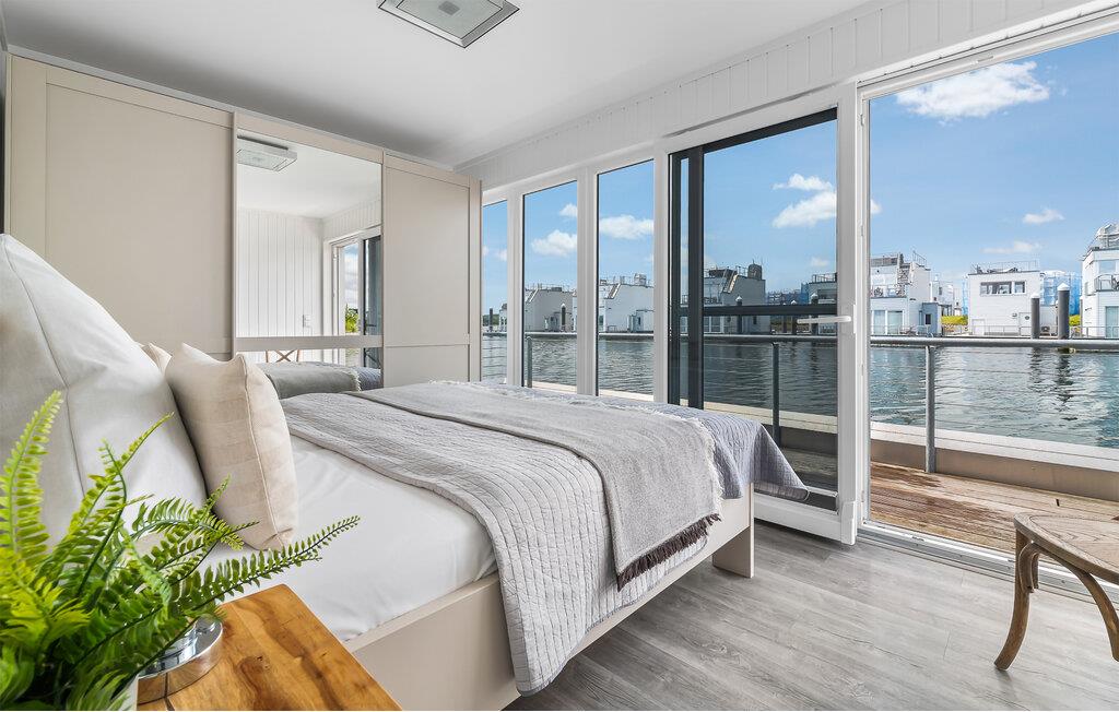 Det flydende hus strækker sig over tre niveauer, hvor den øverste etage har en åben stue og spiseplads. Det fuldt udstyrede køkken-alrum og den tilstødende terrasse byder ikke kun på kulinariske lækkerier, men også en imponerende udsigt over vandet. Herfra fører stien til den spektakulære tagterrasse, udstyret med møbler af høj kvalitet og en Weber elektrisk grill, det ideelle sted at fejre feriefølelsen og opleve betagende solnedgange.