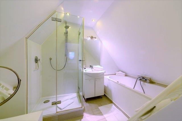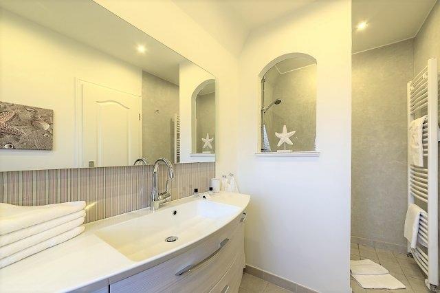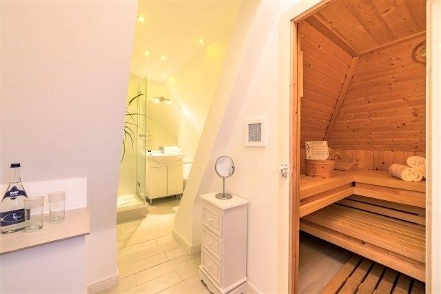 Ein Schlafzimmer mit (Doppelbett) hochwertigen Tischlereinbauten, Flat TV, Stereoanlage mit CD und Bad en suite (Dusche, WC, Waschtisch) befinden sich ebenfalls auf dieser Etage und versprechen gemütliche Träume. Die Küche mit allen Extras (Kühlschrank mit Null Grad Zone, Ceranfeld mit Induktion, Geschirrspüler, Backofen mit Grill..) lässt keine Wünsche offen. Im DG bietet Ihnen dieses Objekt die geräumige Sauna, wie ein Badezimmer mit Dusche, WC, Waschtisch und Whirlpoolbadewanne (Whirl/Air...) und ein weiteres Schlafzimmer wo man die Betten als 2 Einzelbetten aber auch als ein grosses Doppelbett nutzen kann. Selbstverständlich ist auch in diesem Schlafzimmer ein Flat TV mit DVD. Jedes Schlafzimmer verfügt zudem über Verdunkelungsrollos und die Schlafzimmer im DG haben zusätzliche Sonnenschutzrollos. Waschmaschine mit Trockner, Bügeleisen, Bügelbrett, und Staubsauger befinden sich in einen Einbauschrank im Flur damit es unseren Gästen wirklich an nichts fehlt
