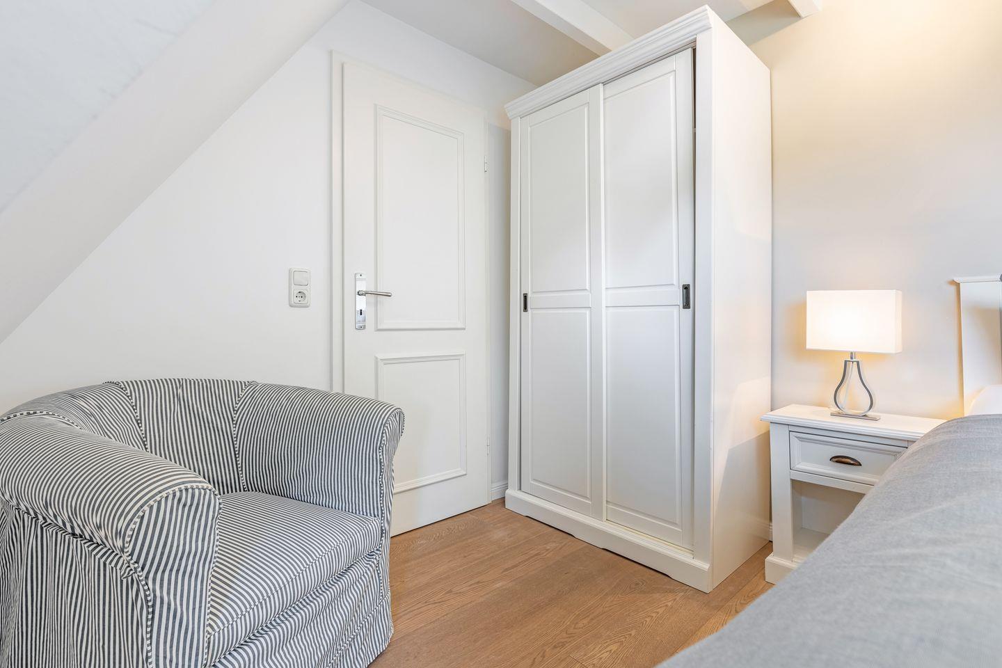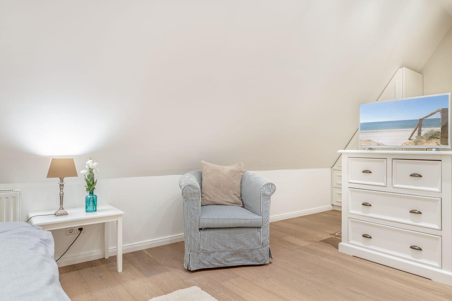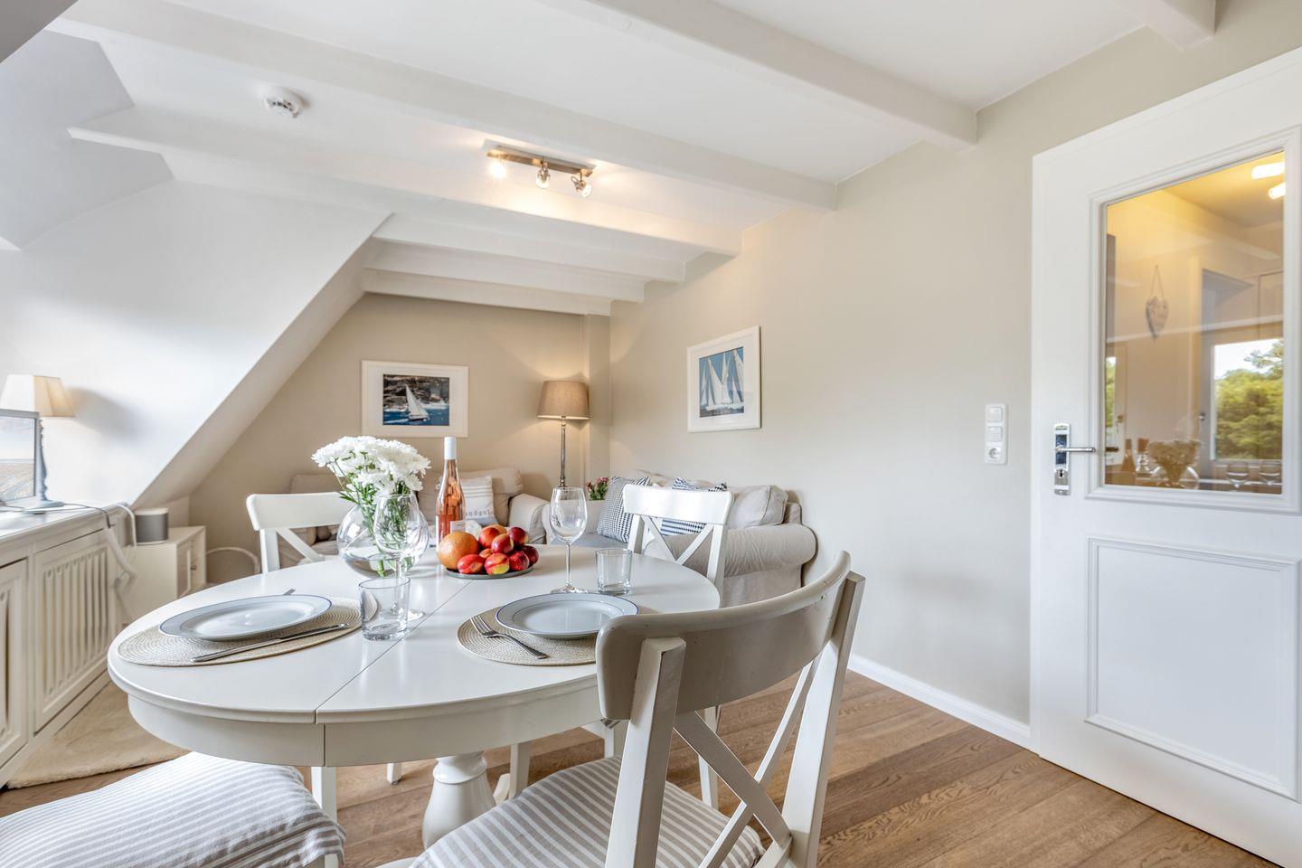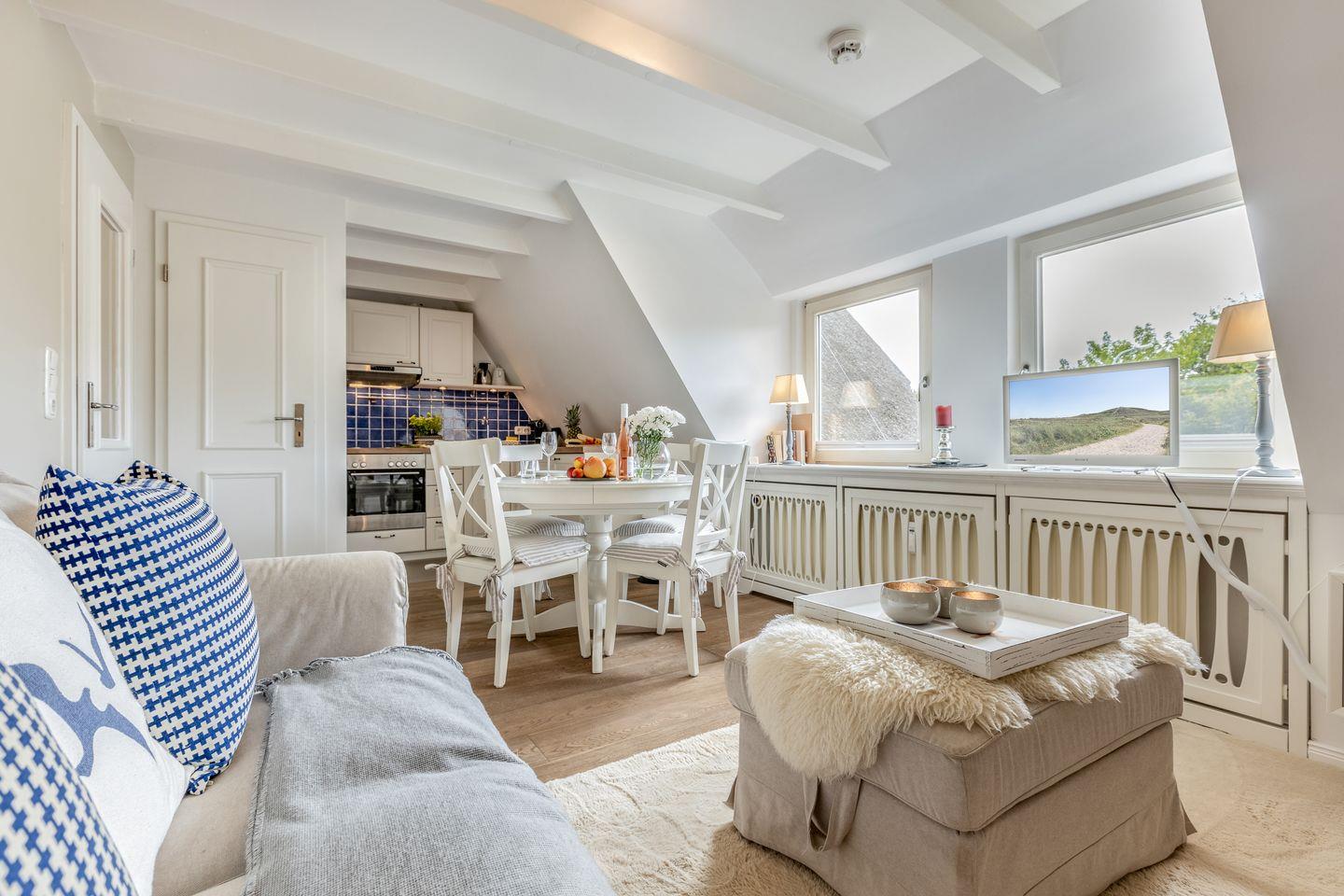 Unsere schöne Maisonette-Ferienwohnung Mareyke befindet sich im Reethof Sylt im ruhigen Ortsteil Tinnum, am Ende einer wenig befahrenen Sackgasse. Hier finden bis zu 4 Personen alles, was Sie für einen entspannten Urlaub benötigen. Im lichtdurchfluteten Wohn/-und Essbereich verbringen Sie gesellige Stunden auf der gemütlichen Sofalandschaft oder am Esstisch, direkt am Fenster. Die angrenzende offene Küche ist komplett ausgestattet und macht somit die Selbstversorgung im Urlaub zum Kinderspiel. Das modern gestaltete Tageslichtbad verfügt über eine ebenerdige Dusche. Eines der Schlafzimmer befindet sich auf der gleichen Etage, wobei das andere in der 2. Etage untergebracht ist und ein eigenes kleines Reich bildet. Beide Schlafräume sind mit komfortablen Doppelbetten ausgestattet und bieten genügend Stauraum für Ihre Garderobe. Genießen Sie Ihre Sonnenstunden im großen, von Friesenwällen umgebenen, Gemeinschaftsgarten im eigenen Strandkorb. Freuen Sie sich auf Ruhe und Wohlfühlambiente.
