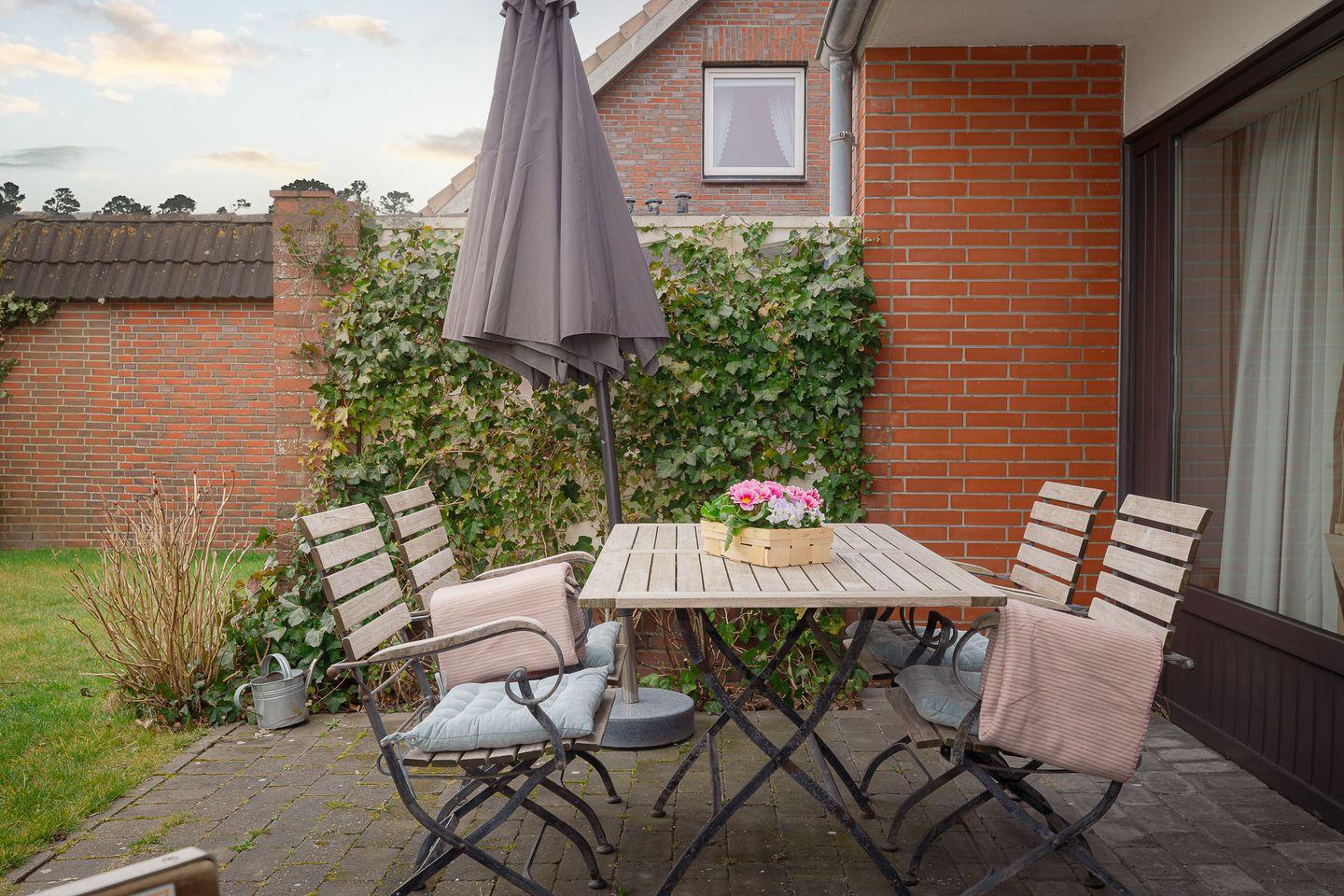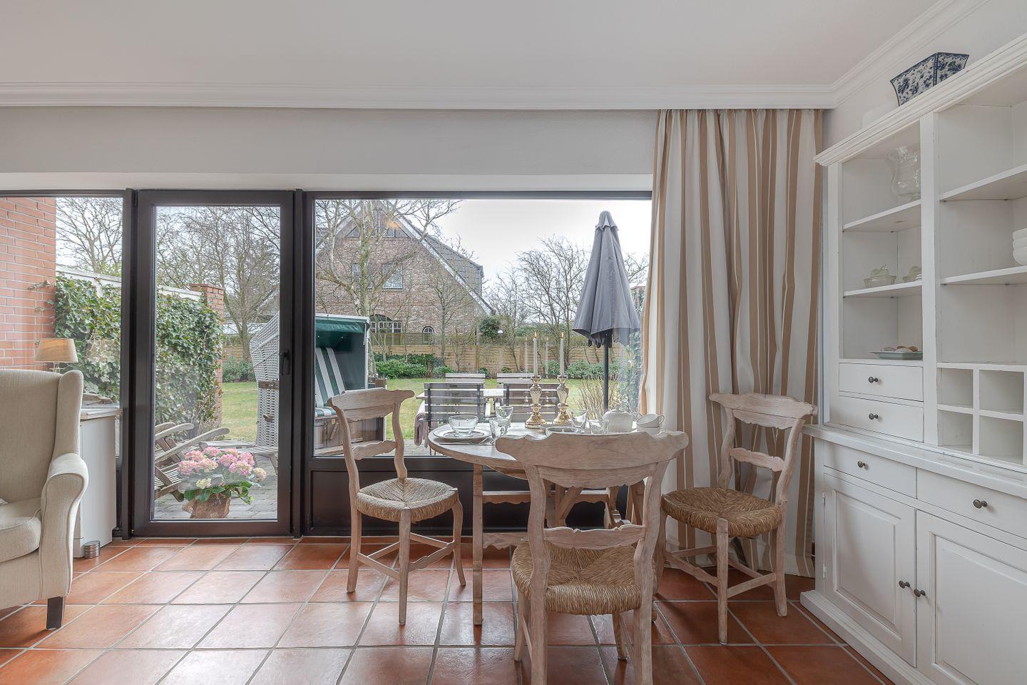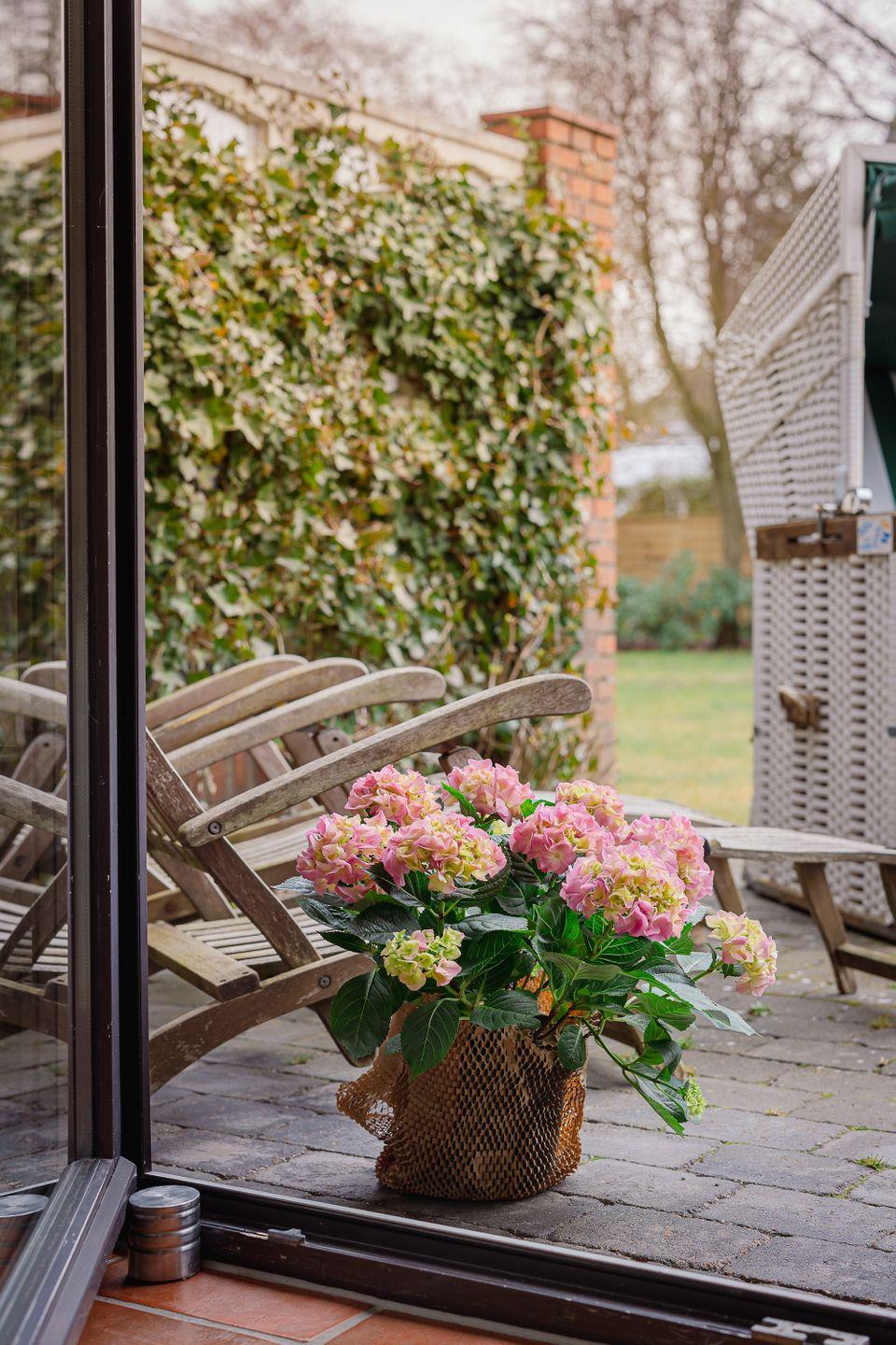 Ein echtes Highlight ist die sonnige Süd-Terrasse mit Blick ins Grüne. Genießen Sie hier Ihr Frühstück, entspannen Sie auf den Gartenmöbeln oder Sonnenliegen, oder machen Sie es sich im Strandkorb gemütlich – umgeben von blühendem Sichtschutz für Ihre Privatsphäre.