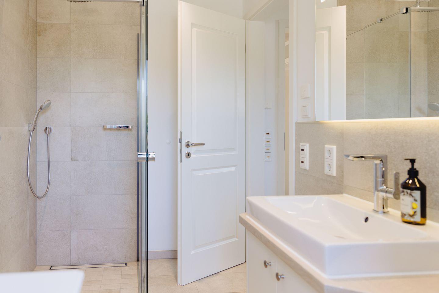 Drei geräumige Schlafzimmer mit komfortablen Boxspringbetten garantieren erholsame Nächte. Besonders exklusiv: ein Schlafzimmer verfügt über ein eigenes Bad en Suite. Zwei weitere Schlafzimmer im Souterrain begeistern durch helle Atmosphäre dank großzügiger Fenster.