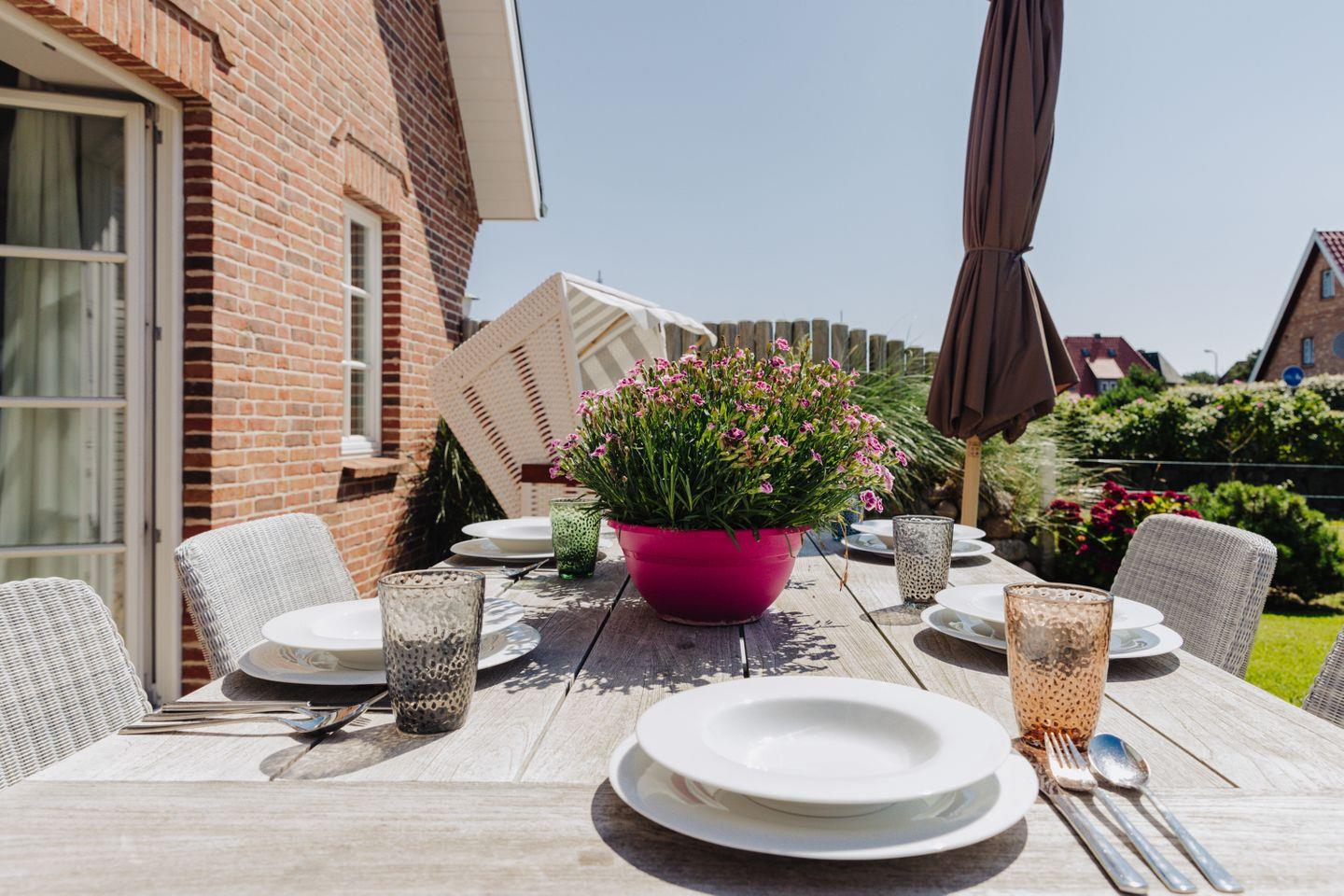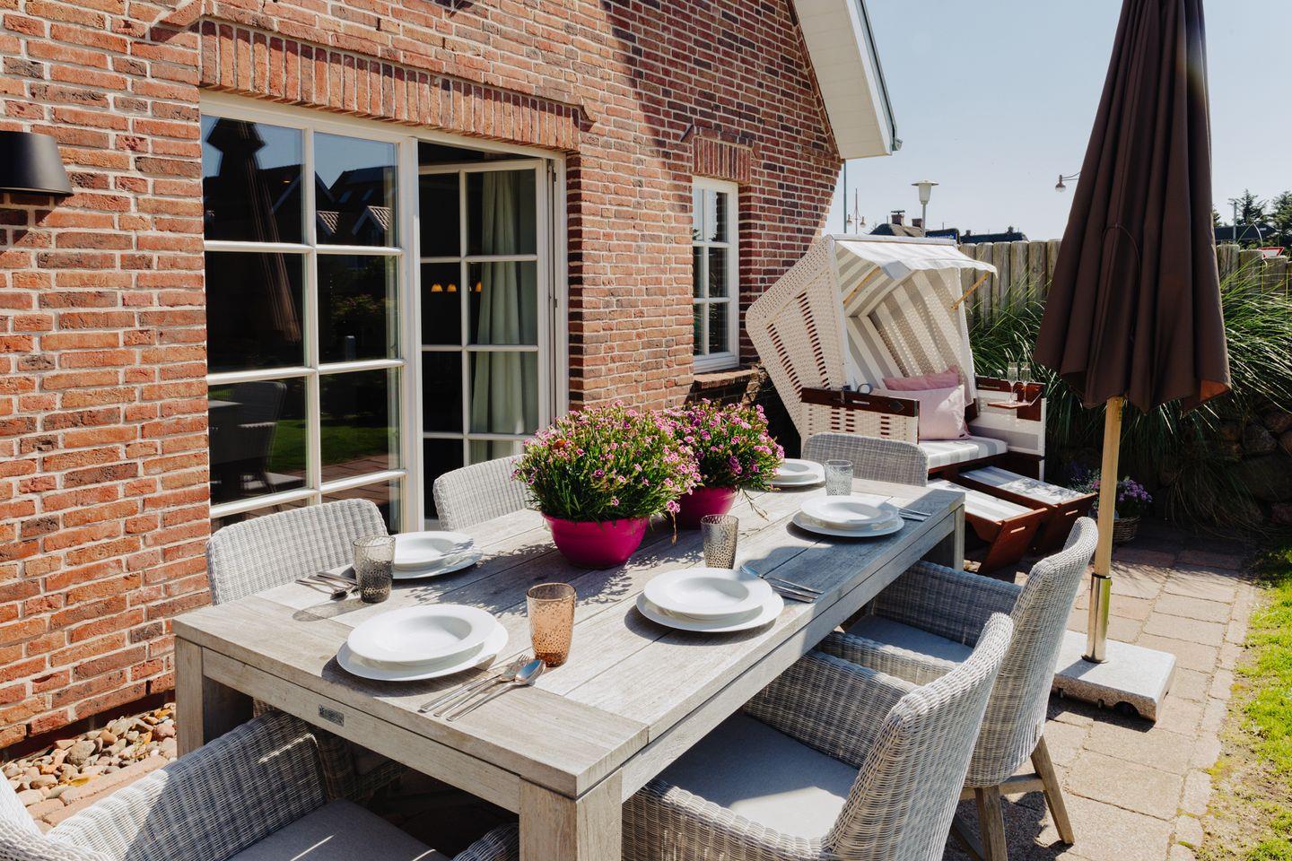 Genießen Sie sonnige Stunden auf Ihrer Südterrasse oder entspannen Sie im idyllischen Garten mit Gartenmöbeln und einem privaten Strandkorb.