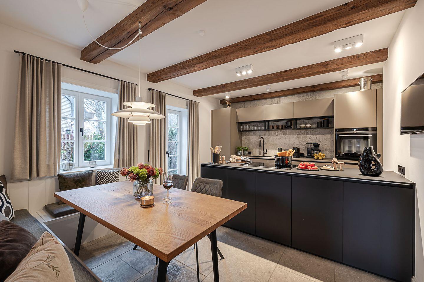 Im Erdgeschoss erwartet Sie ein lichtdurchfluteter Wohn-Essbereich, der mit einem stilvollen Holzkamin ausgestattet ist – perfekt für gemütliche Stunden, in denen die Zeit stillzustehen scheint. Hier können Sie entspannen und die wohlige Wärme genießen, während Sie den Tag ausklingen lassen. Die offene, hochmoderne Küche ist ein wahres Paradies für jeden Hobbykoch, ausgestattet mit besten Siemens-Geräten, darunter ein Backofen mit integrierter Mikrowelle, Induktionskochfeld, Geschirrspüler und ein Kühlschrank mit Gefrierfach – alles, was das Herz begehrt.